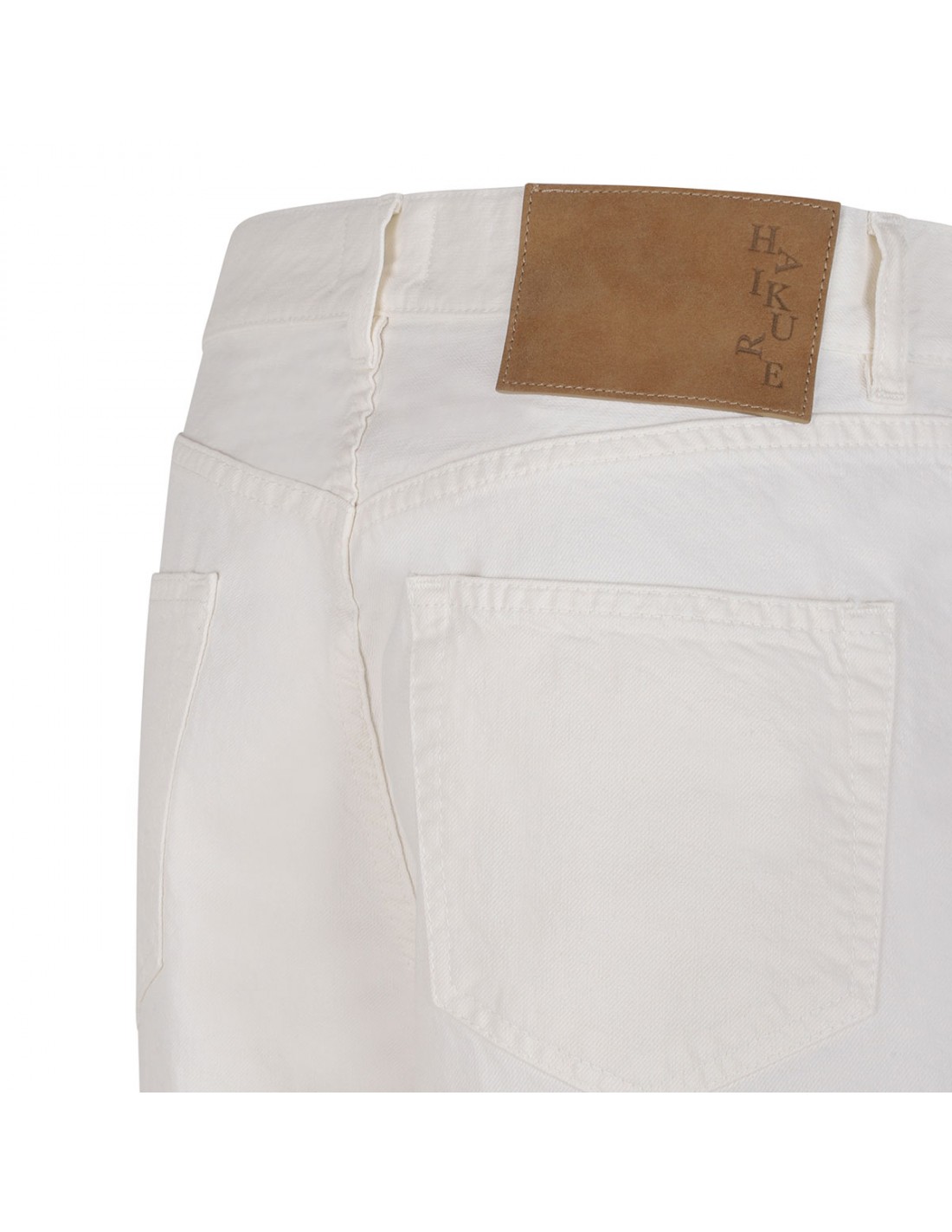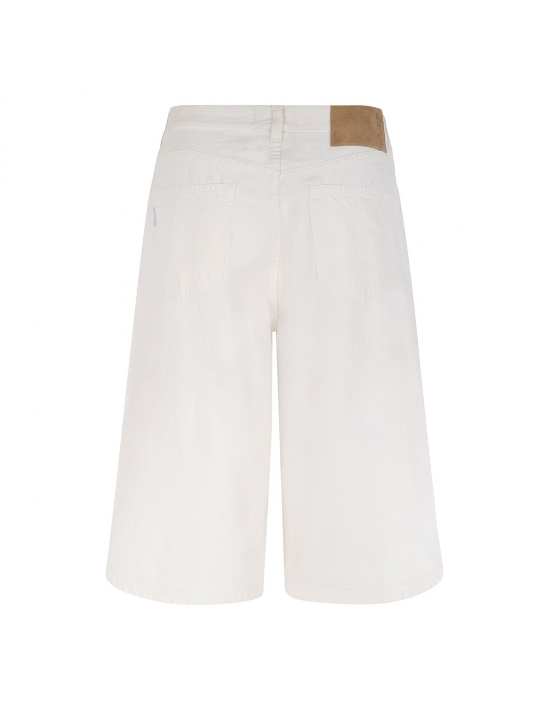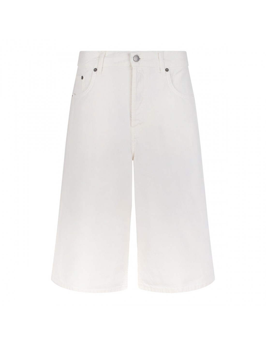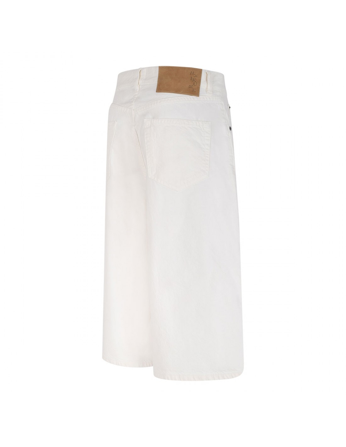 Off-white twill denim New Becky Twill 45 bermuda shorts from Haikure featuring mid-rise waist, wide leg, button closure and zip fly, classic five-pocket style, belt loops on the waistband, leather logo tag on back-waist.