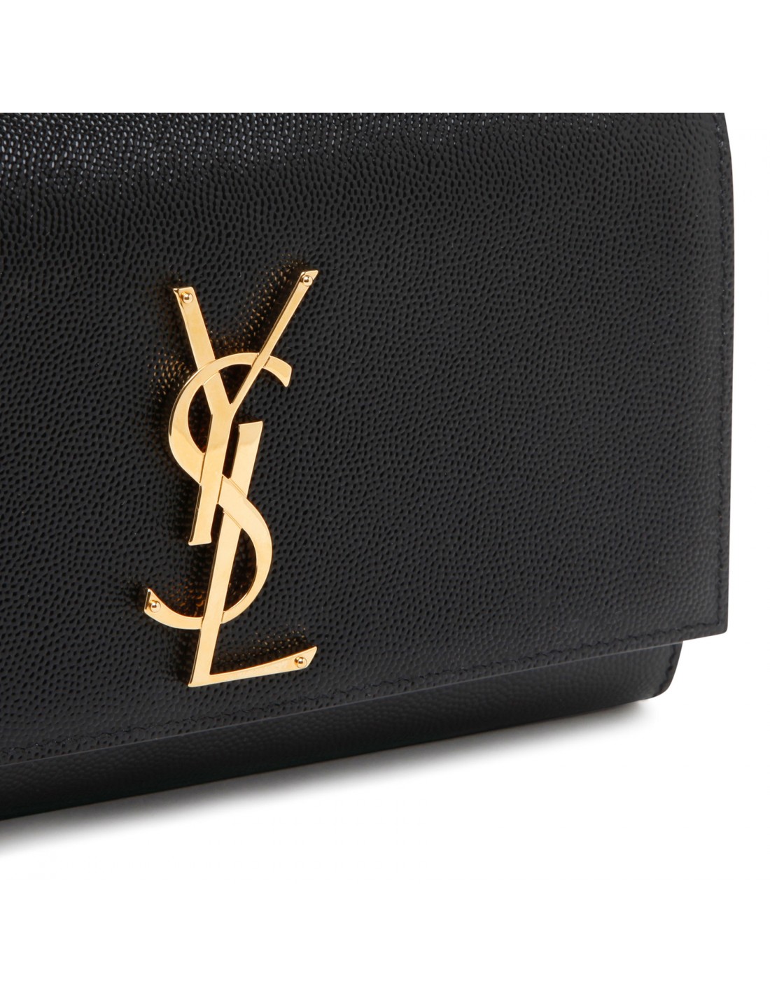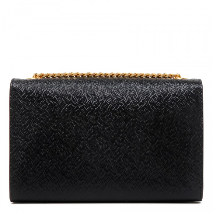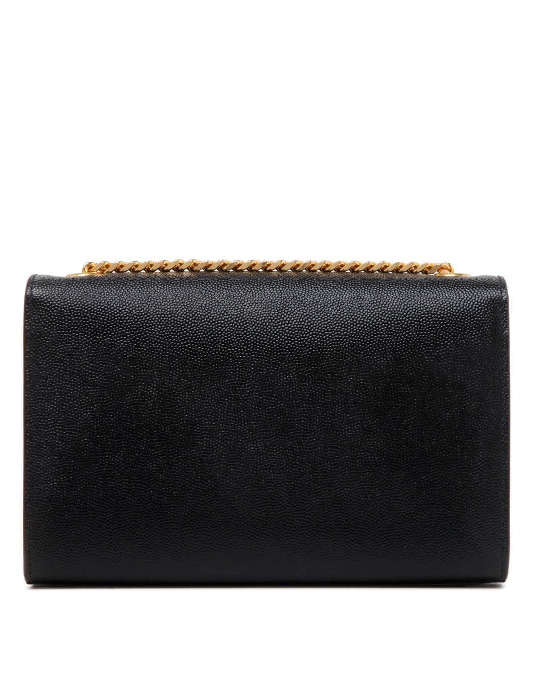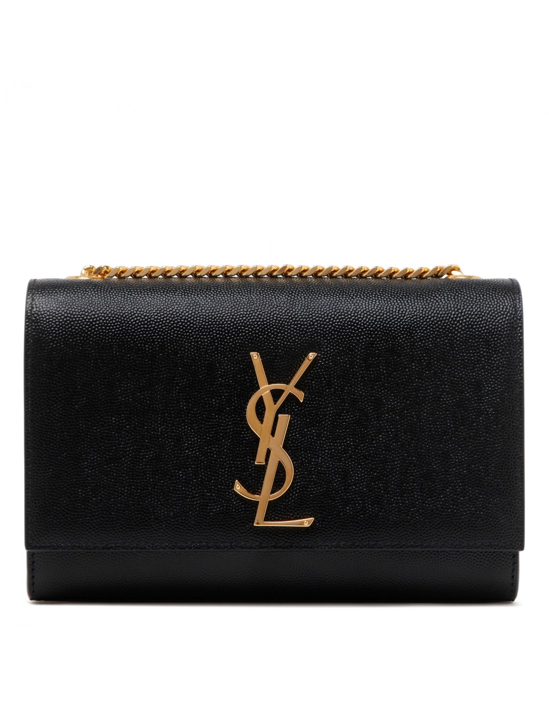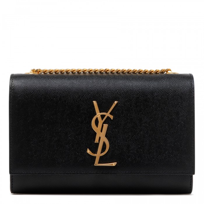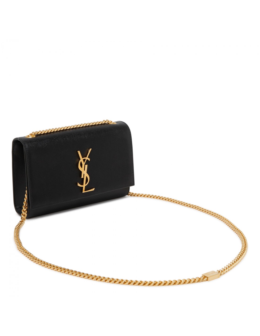 Black grain de poudre leather Kate small chain bag from Saint Laurent with golden metal interlaced YSL logo monogram, golden metal chain shoulder strap, front flap, magnetic snap closure, grosgrain lining, and internal slot pocket.