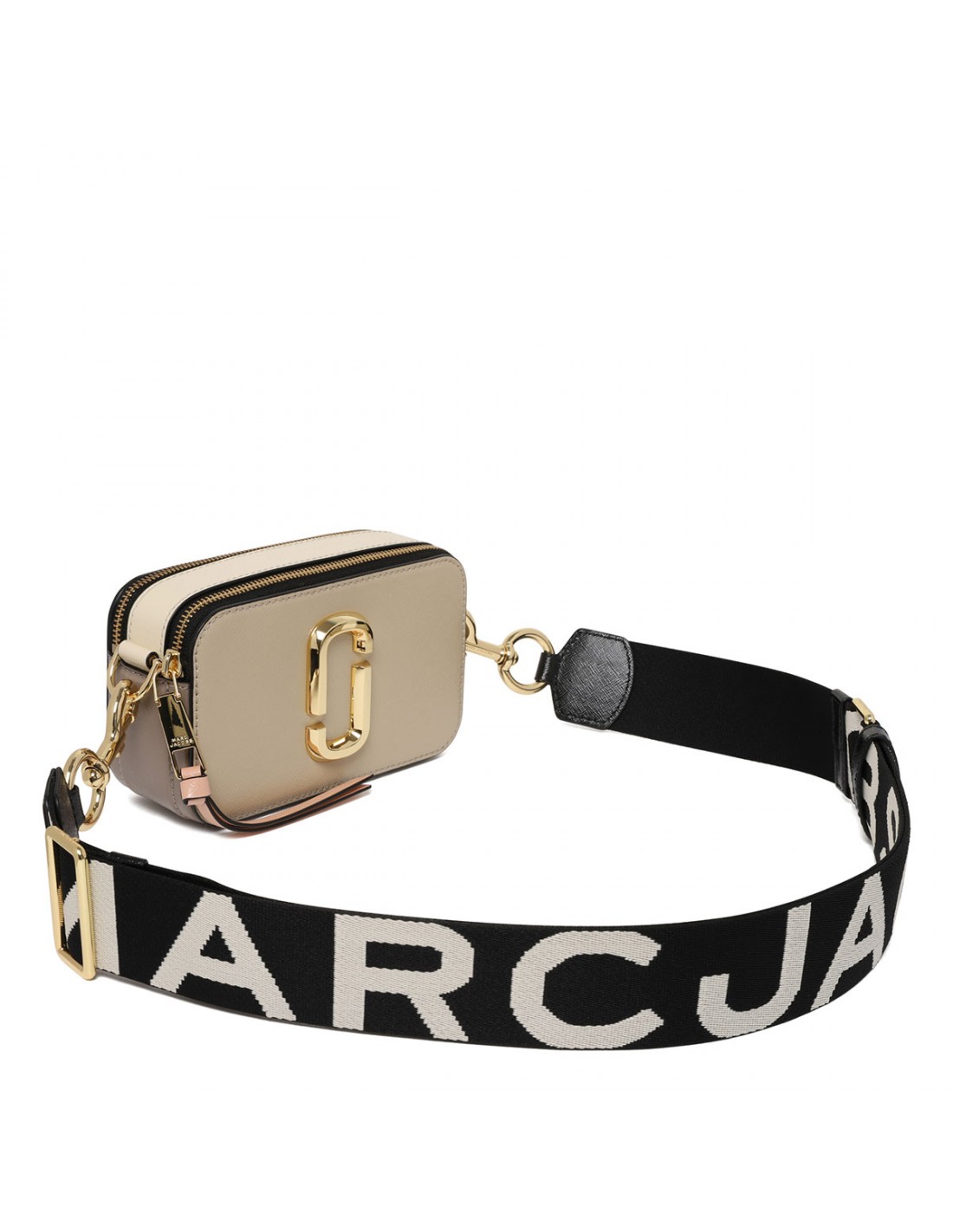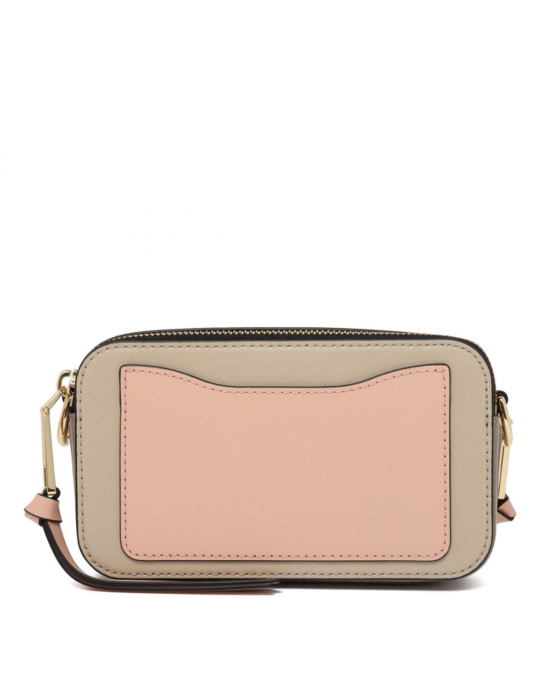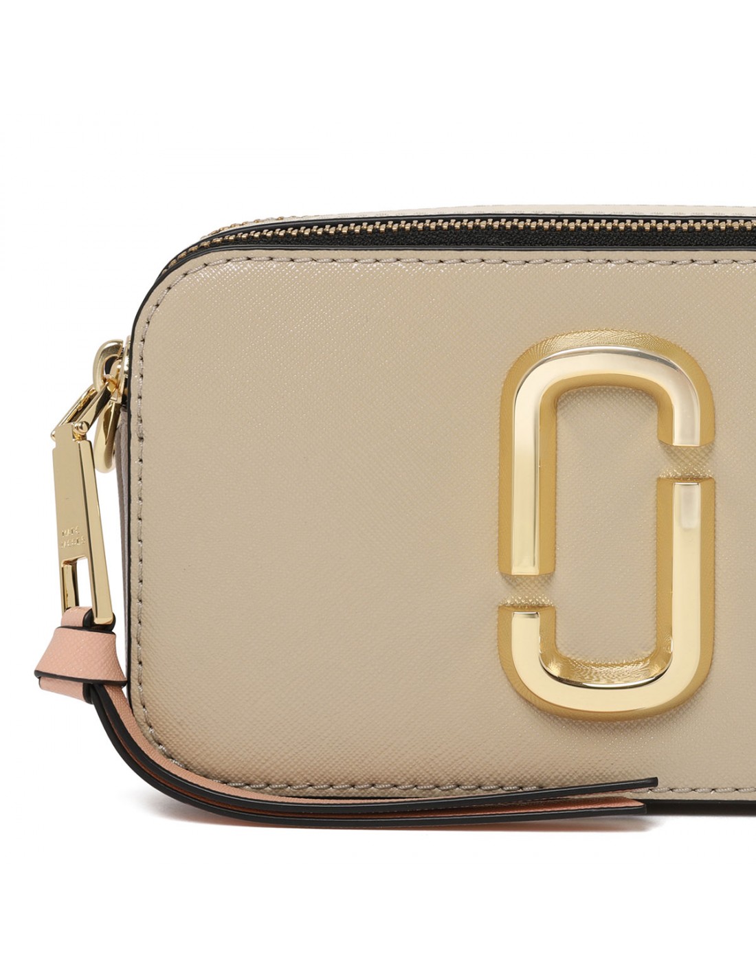 Khaki saffiano leather The Snapshot bag from Marc Jacobs featuring detachable and adjustable logo webbing strap, two-way zip fastening along top, external back pink pocket, beige-hue detail, faille lining, internal zip pocket.