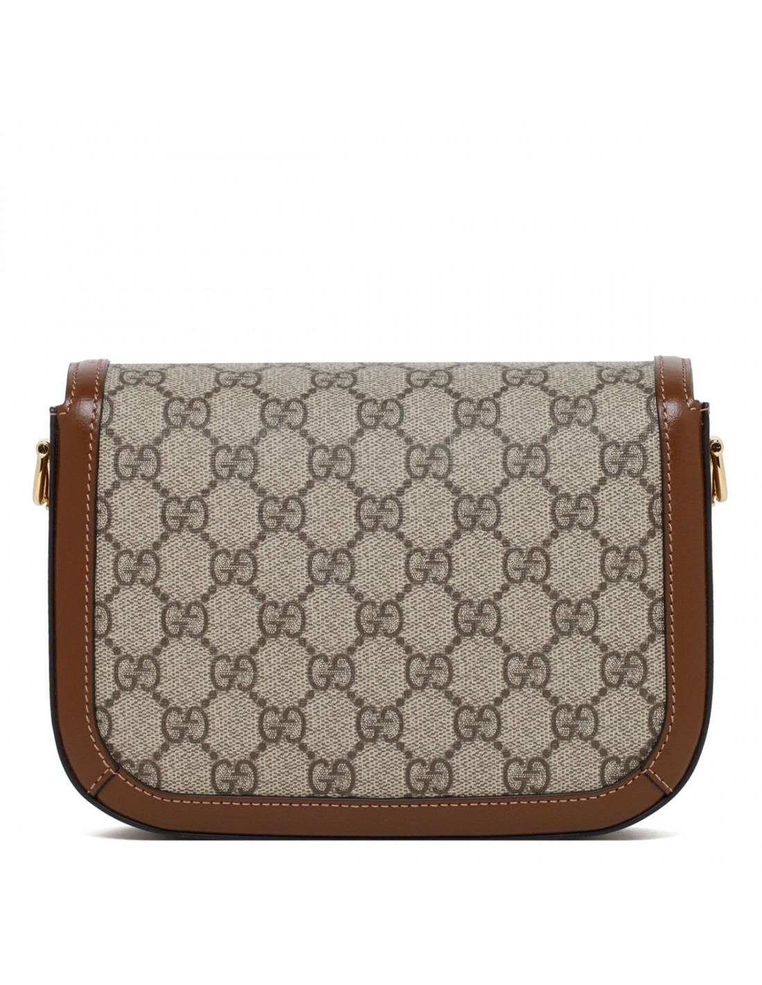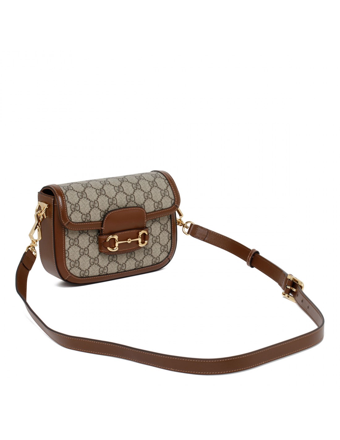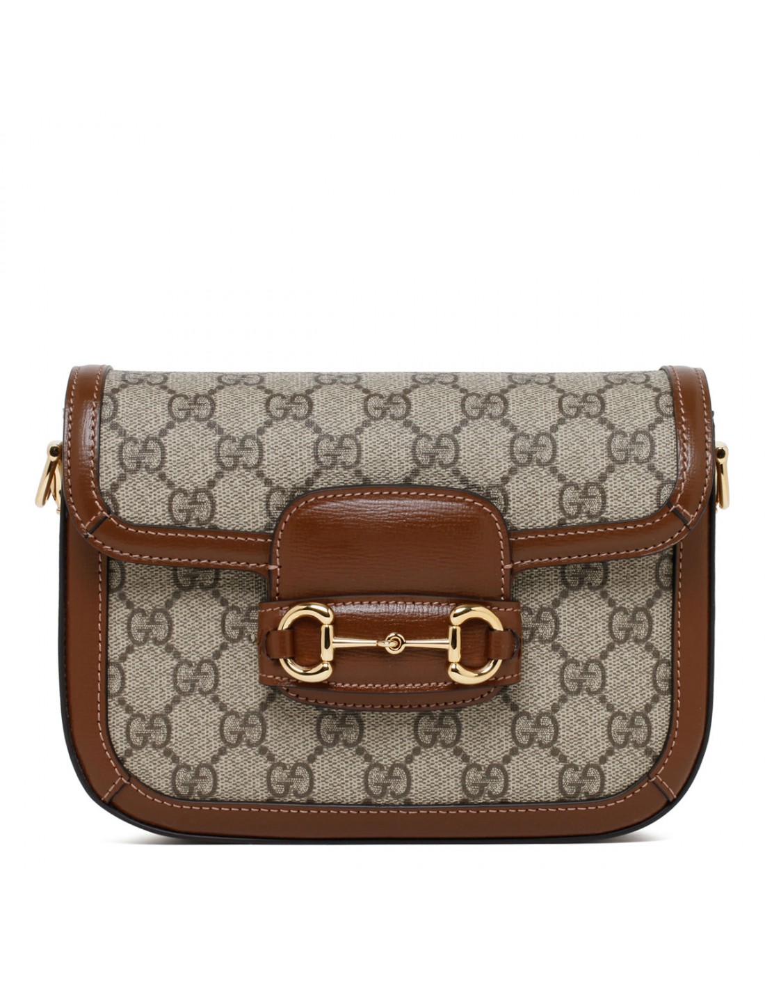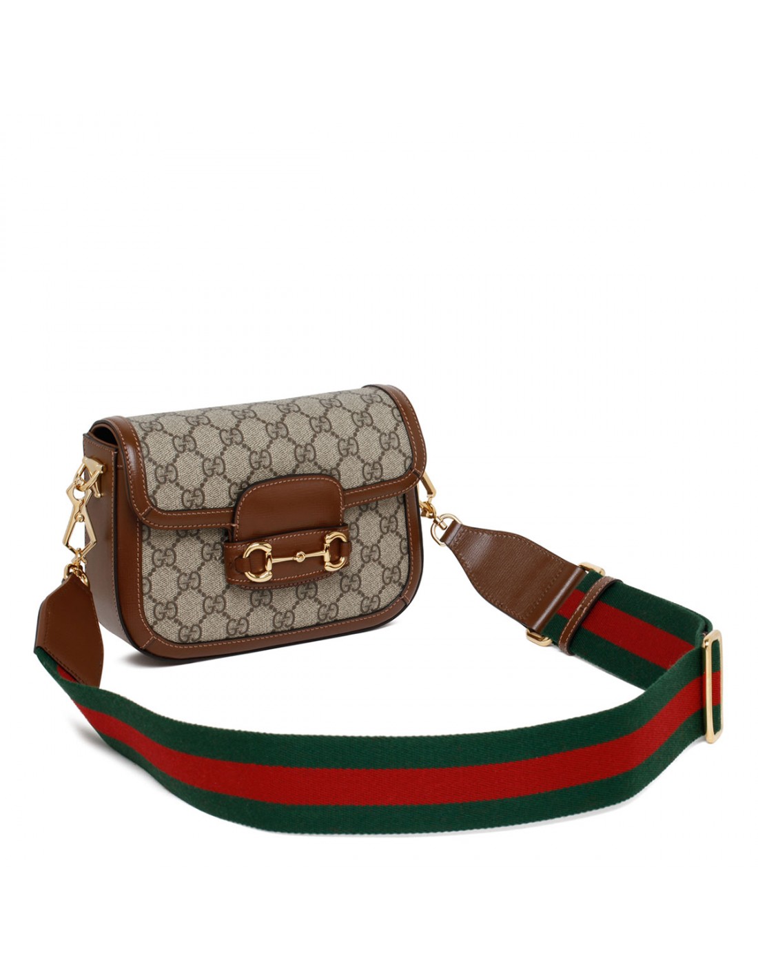Beige and ebony Supreme canvas Horsebit 1955 mini bag from Gucci featuring GG motif, brown leather trims, green and red Web, detachable leather shoulder strap, gold-toned hardware and Horsebit, detachable Web shoulder strap, front flap with closure, microfibre lining with a suede-like finish.