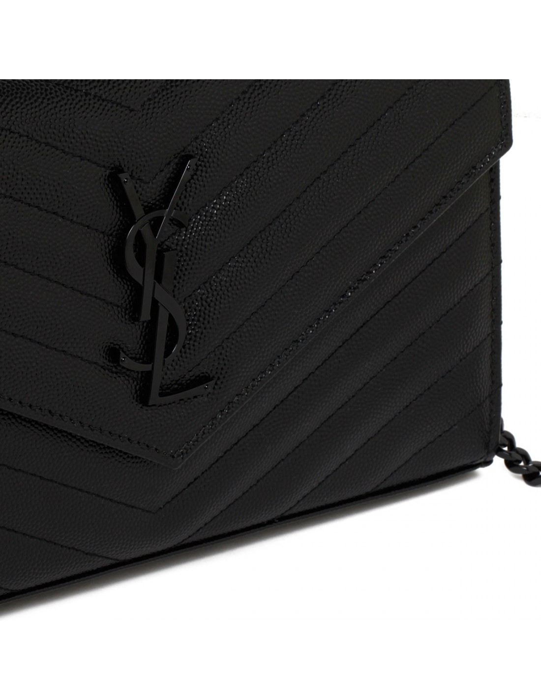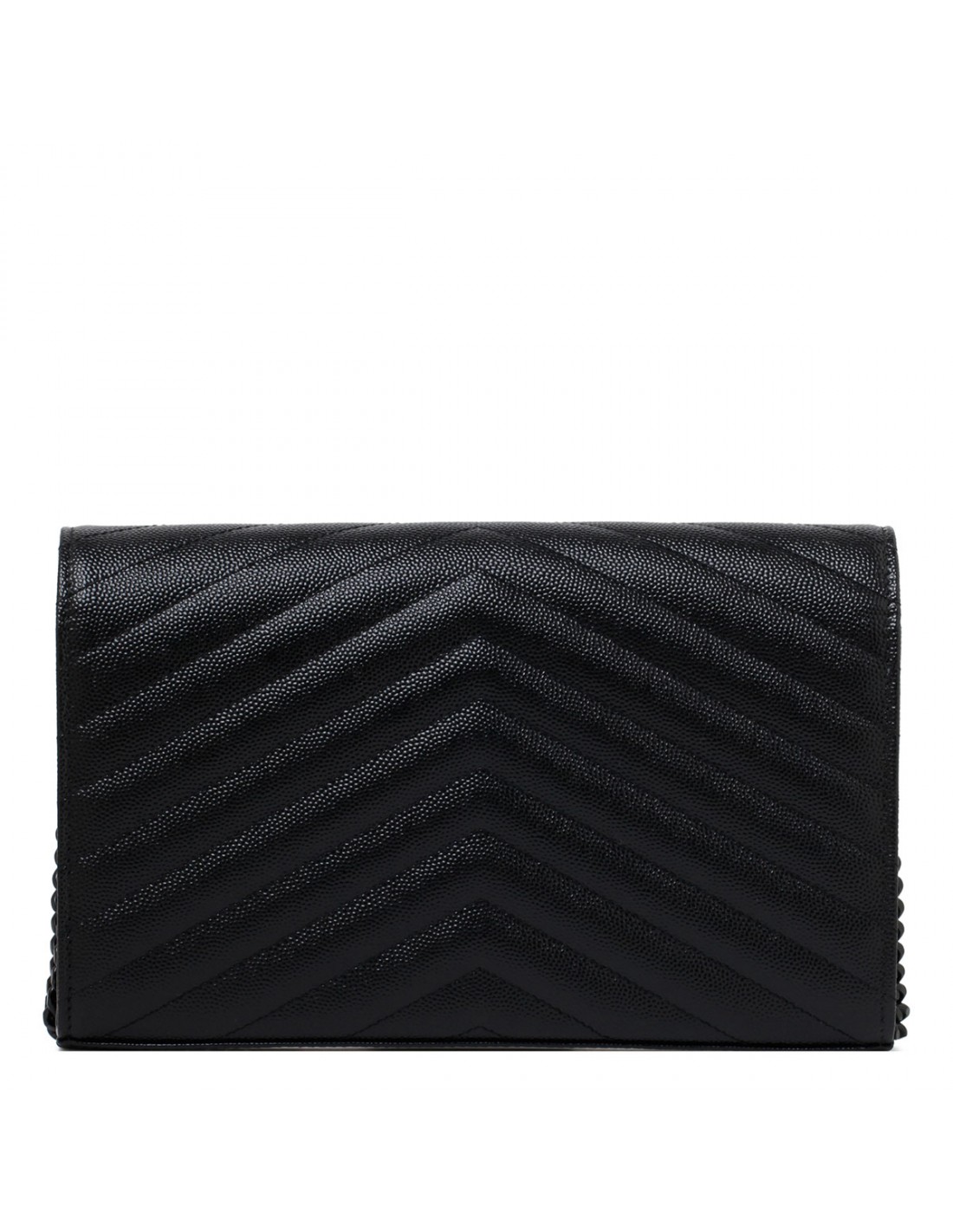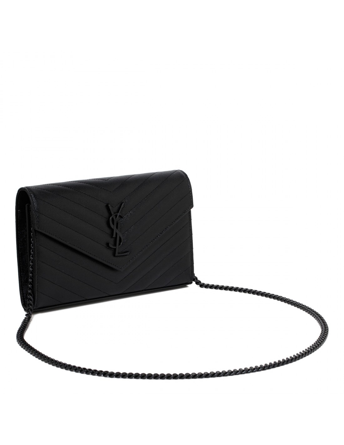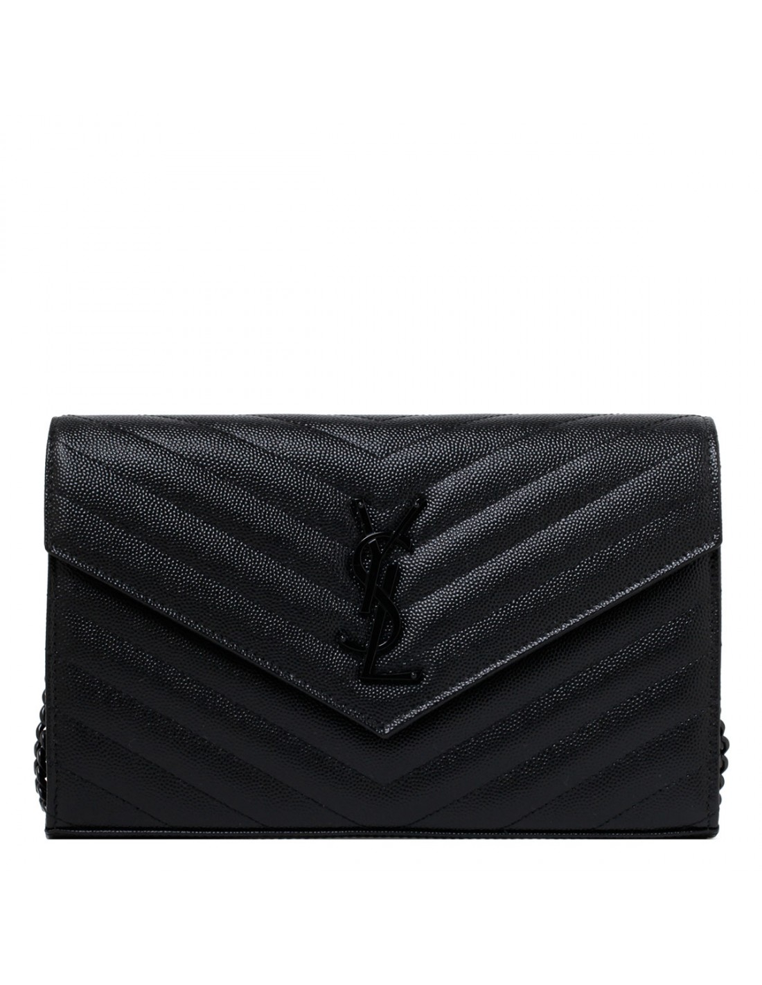 Black grain de poudre leather Cassandre chain wallet from Saint Laurent featuring iconic chevron quilting, cassandre embellishment, magnetic snap closure, two central compartments, matte black brass hardware, leather lining, one internal zipped pocket, bill slot, ten card slots.
