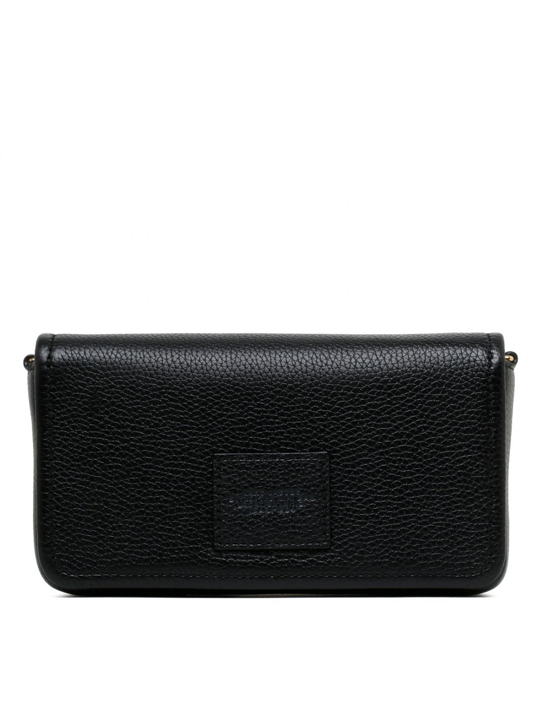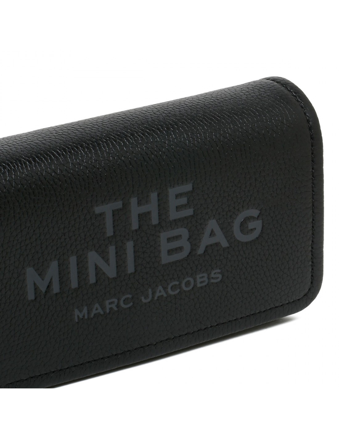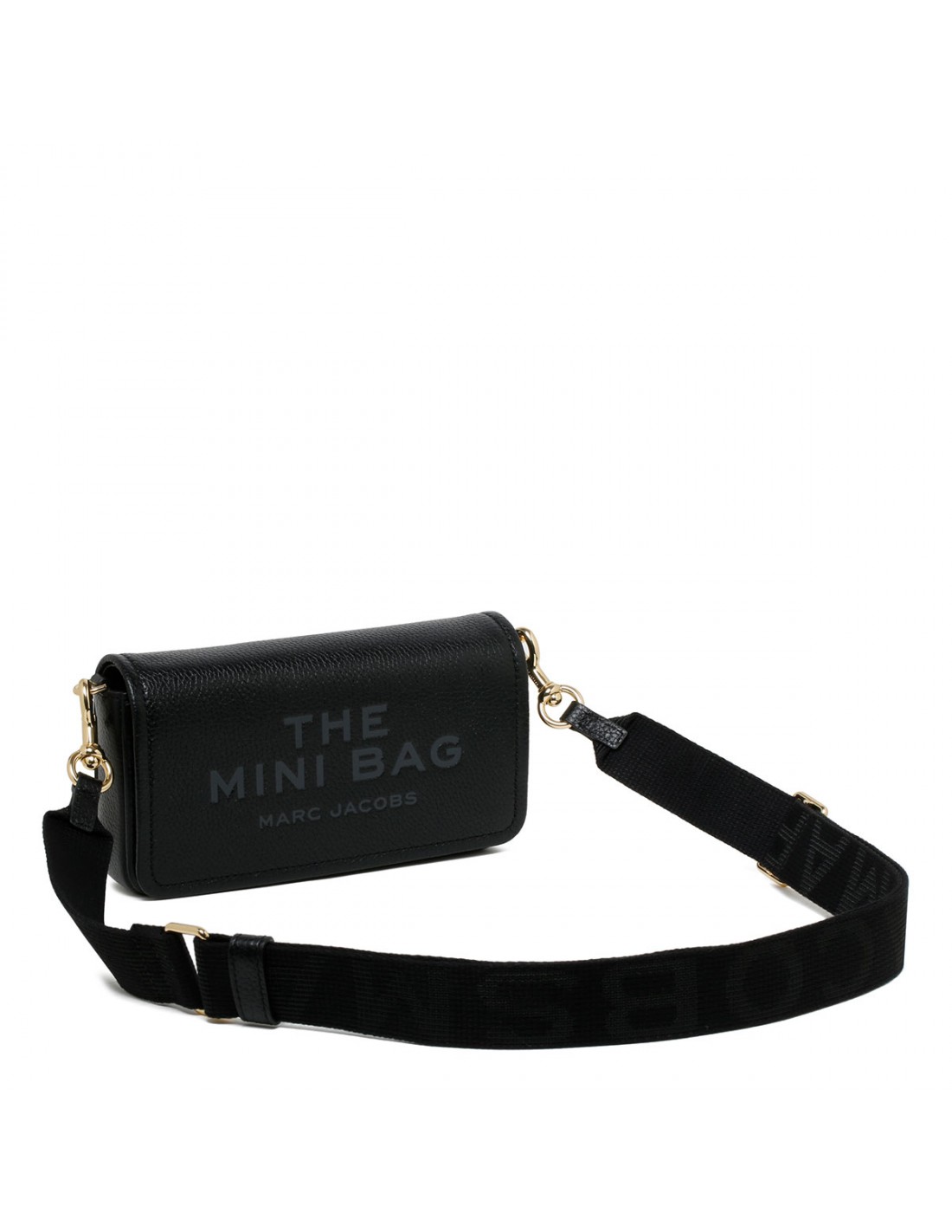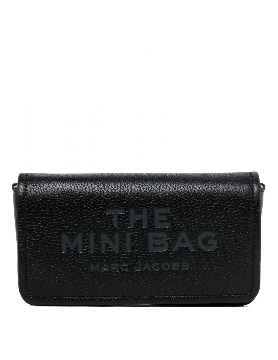 Black full grain leather Mini bag from Marc Jacobs featuring logo on front, magnetic closure, words "my other bag is the tote bag" debossed on the inside, adjustable and detachable webbing strap, twill lining, internal slip pocket and eight card slots.