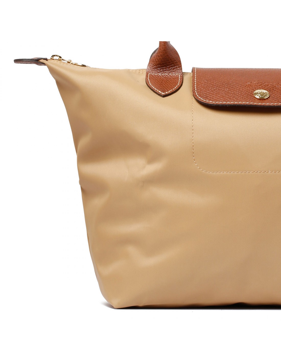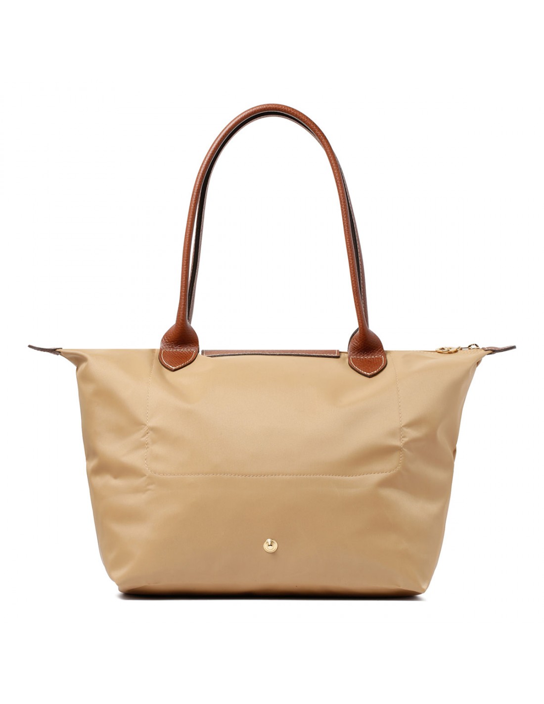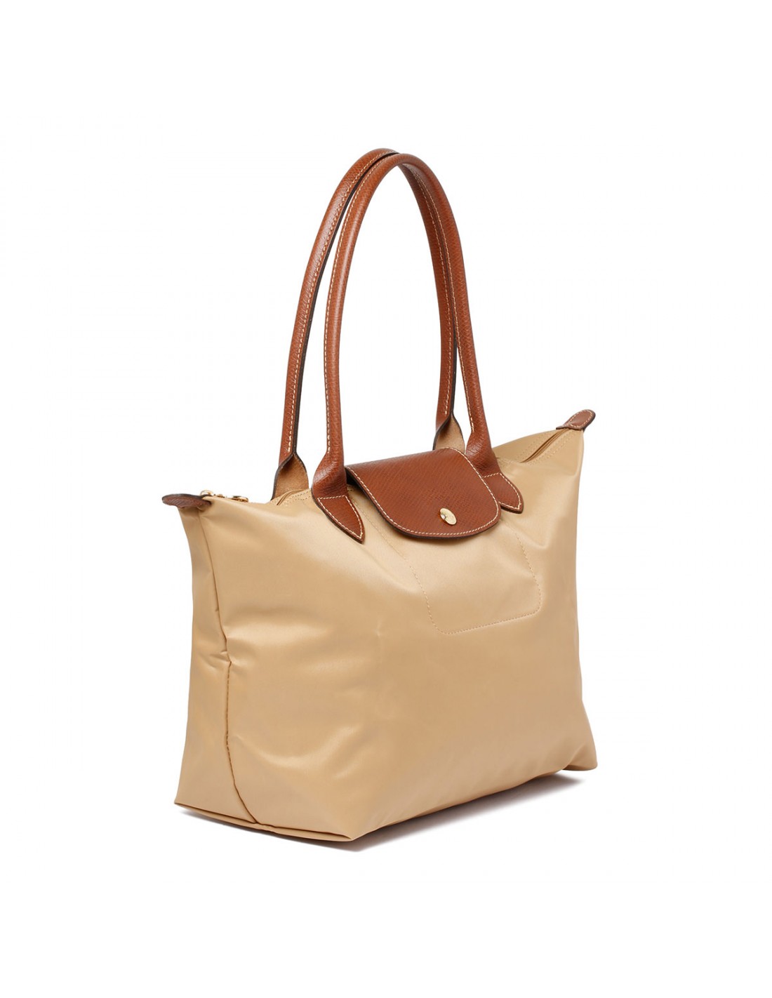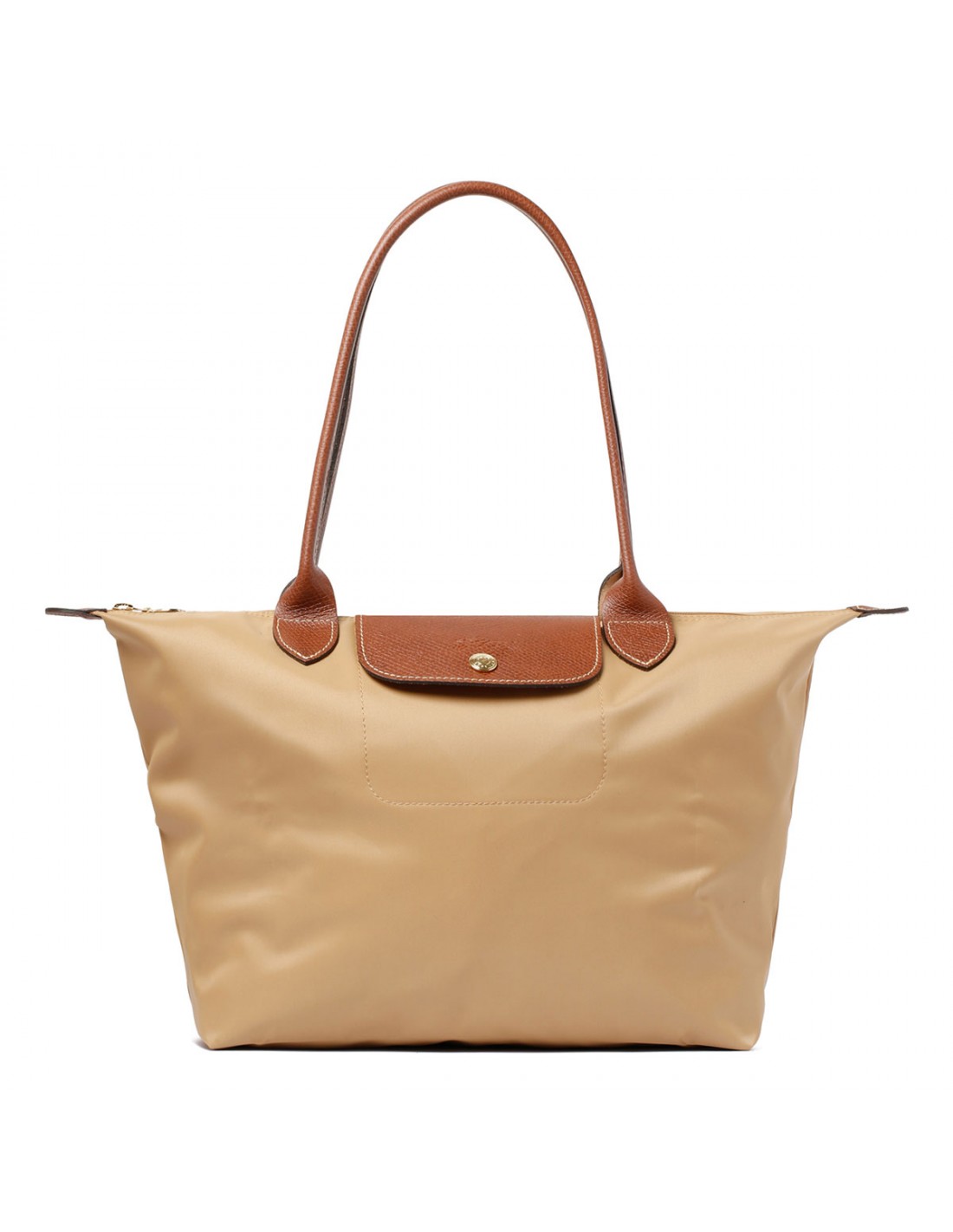 Beige recycled polyester canvas Le Pliage Original L tote bag from Longchamp featuring double leather long handles, leather flap with snap and embossed logo, zip closure, internal open pockets.