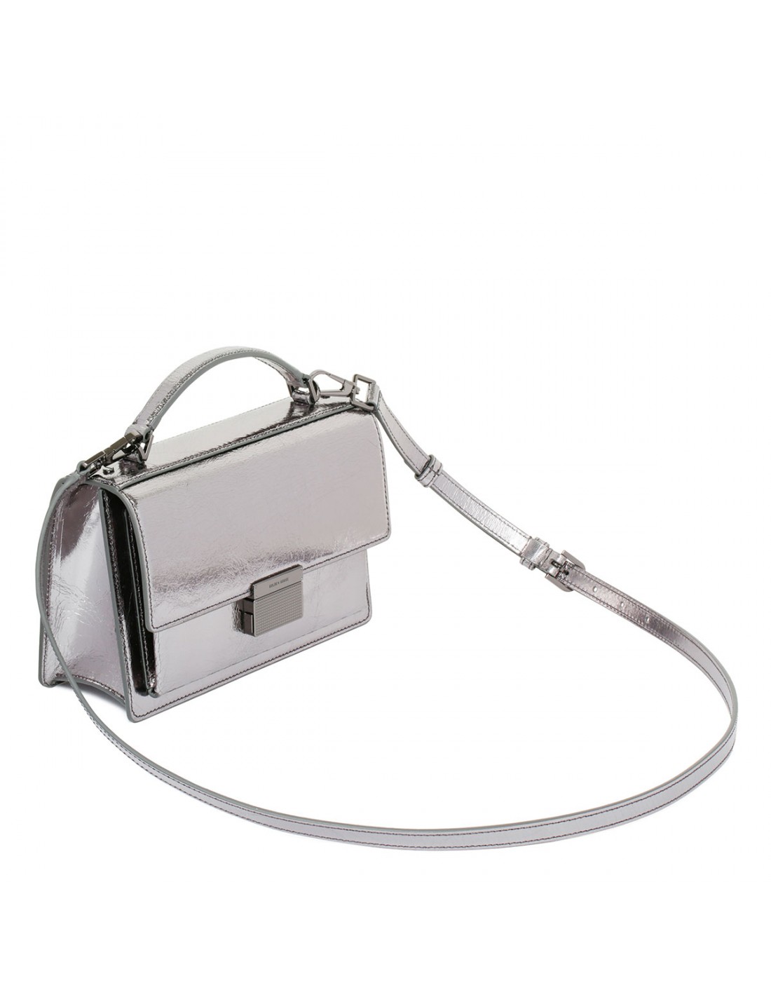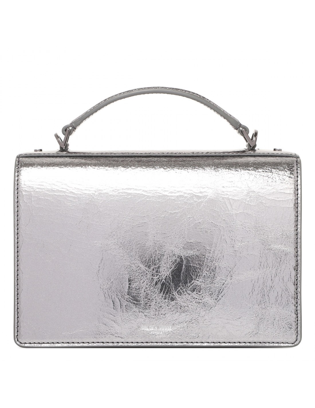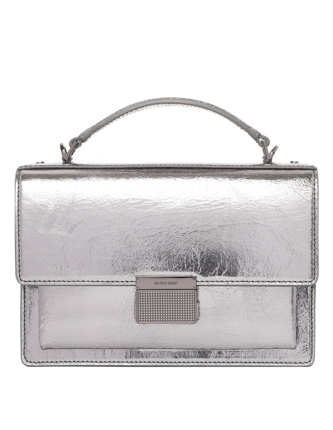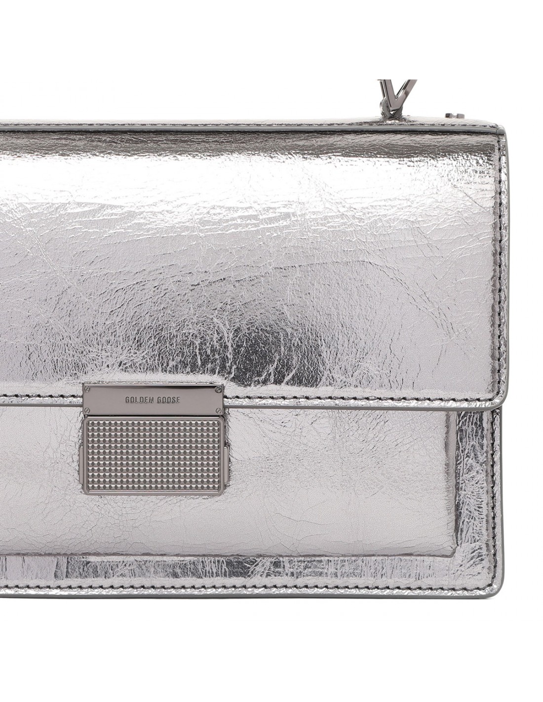 Metallic silver patent leather Venezia shoulder bag from Golden Goose featuring rectangle shape, leather top handle, adjustable and detachable shoulder strap, front clasp fastening with embossed logo, partitioned compartment, gold-tone hardware, internal slip pocket.