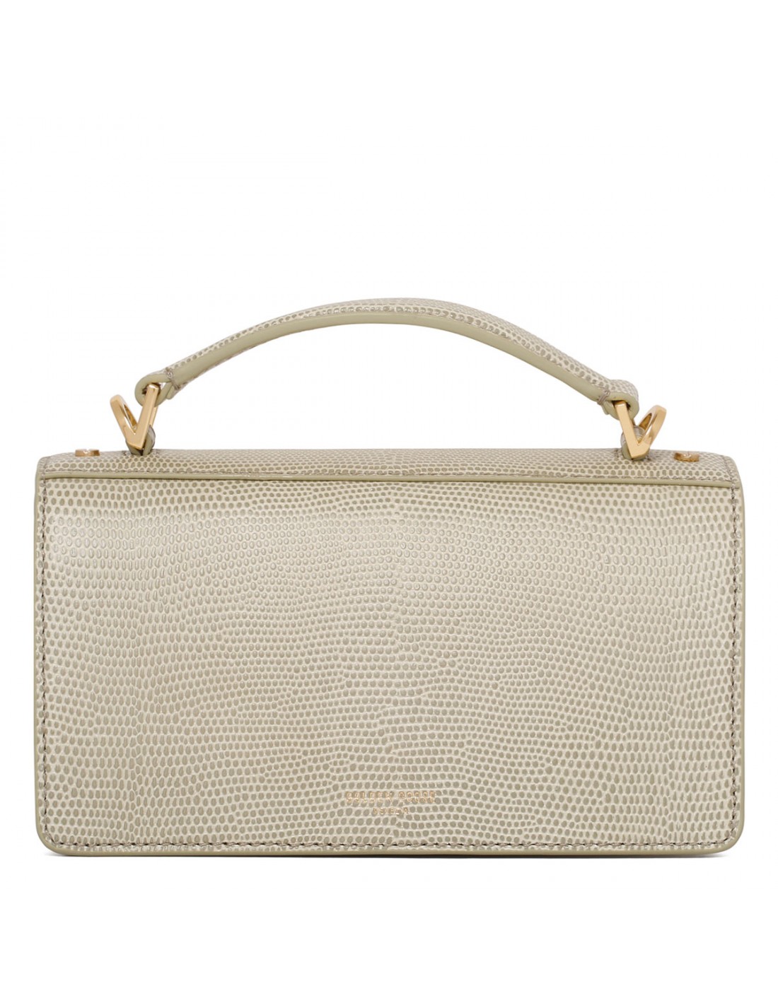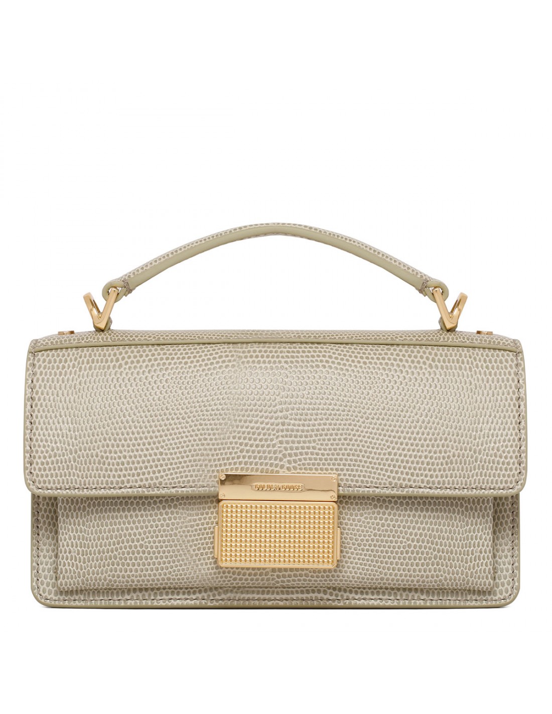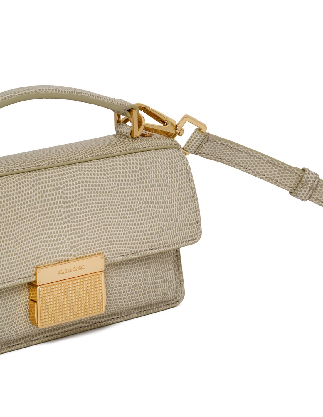 Mineral gray leather Venezia small shoulder bag from Golden Goose featuring tejus motif, rectangle shape, leather top handle, adjustable and detachable shoulder strap, front clasp fastening with embossed logo, partitioned compartment, gold-tone hardware, internal slip pocket.