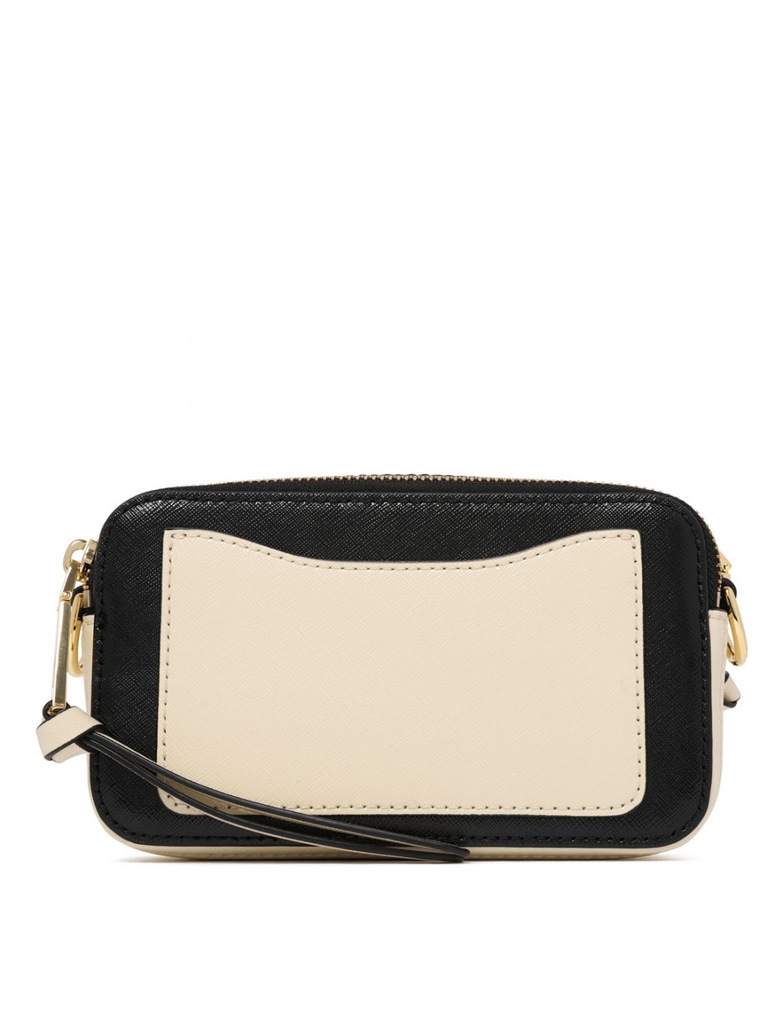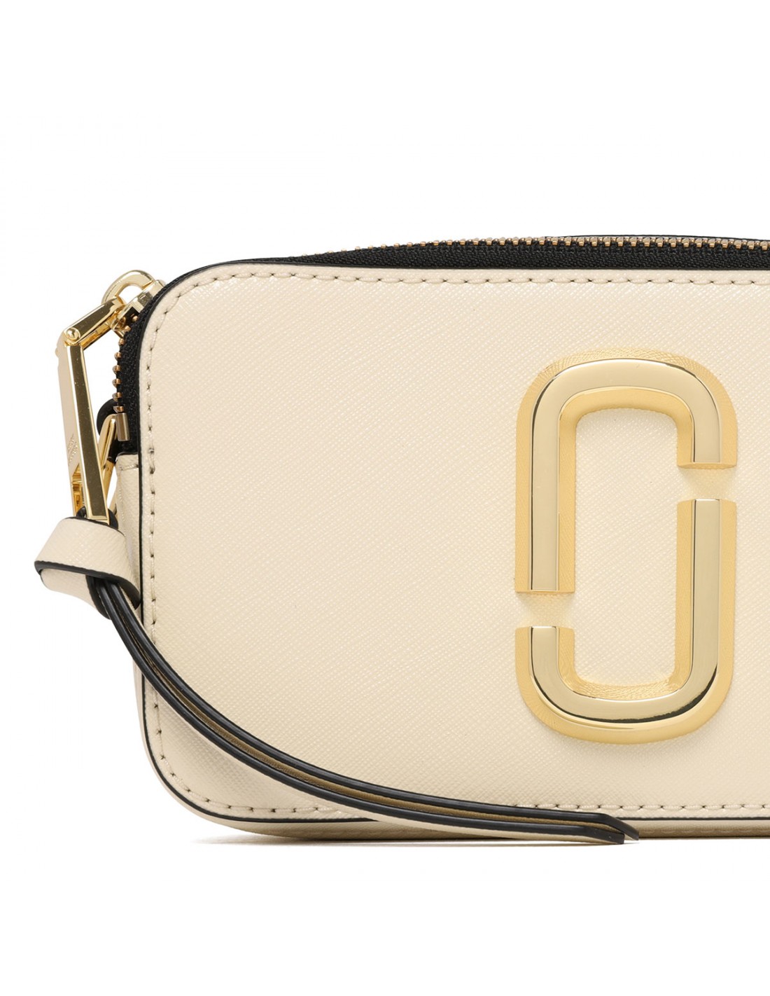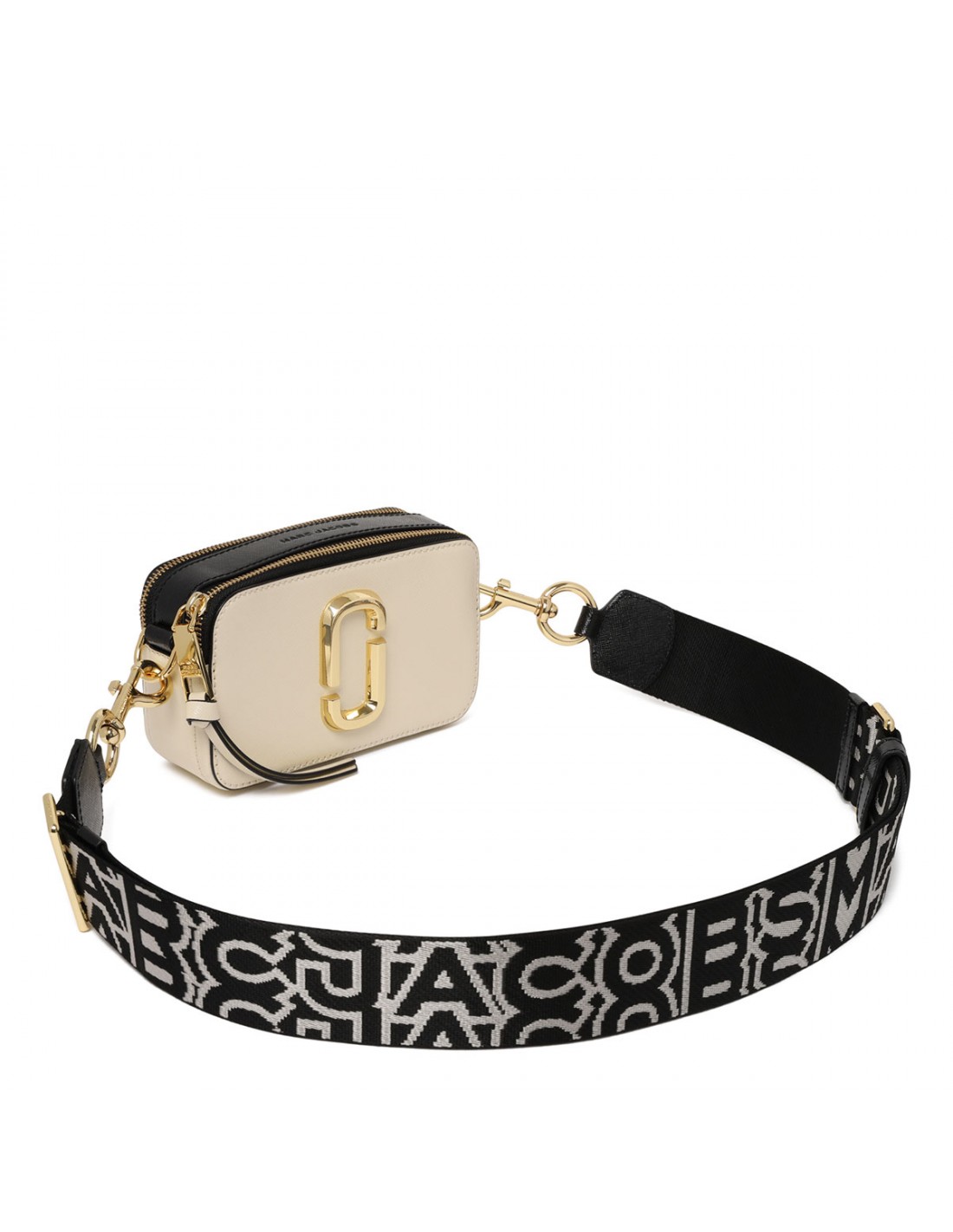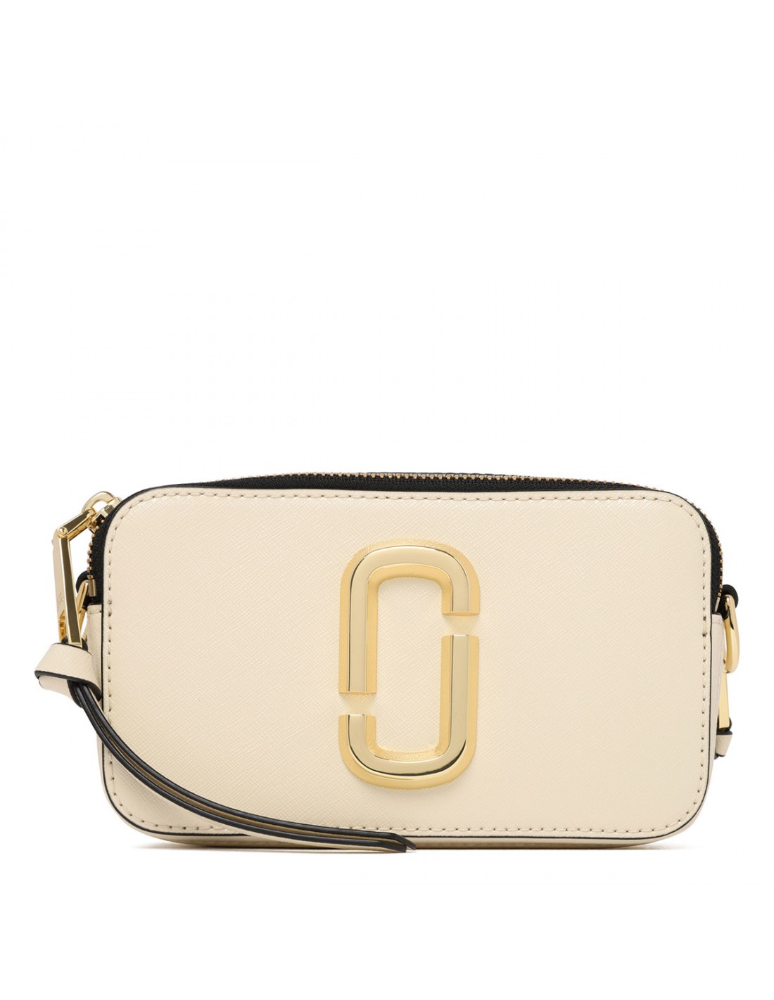 Cloud white hue and black saffiano leather The Snapshot bag from Marc Jacobs featuring detachable and adjustable logo webbing strap, two-way zip fastening along top, external back pocket, faille lining, internal zip pocket.