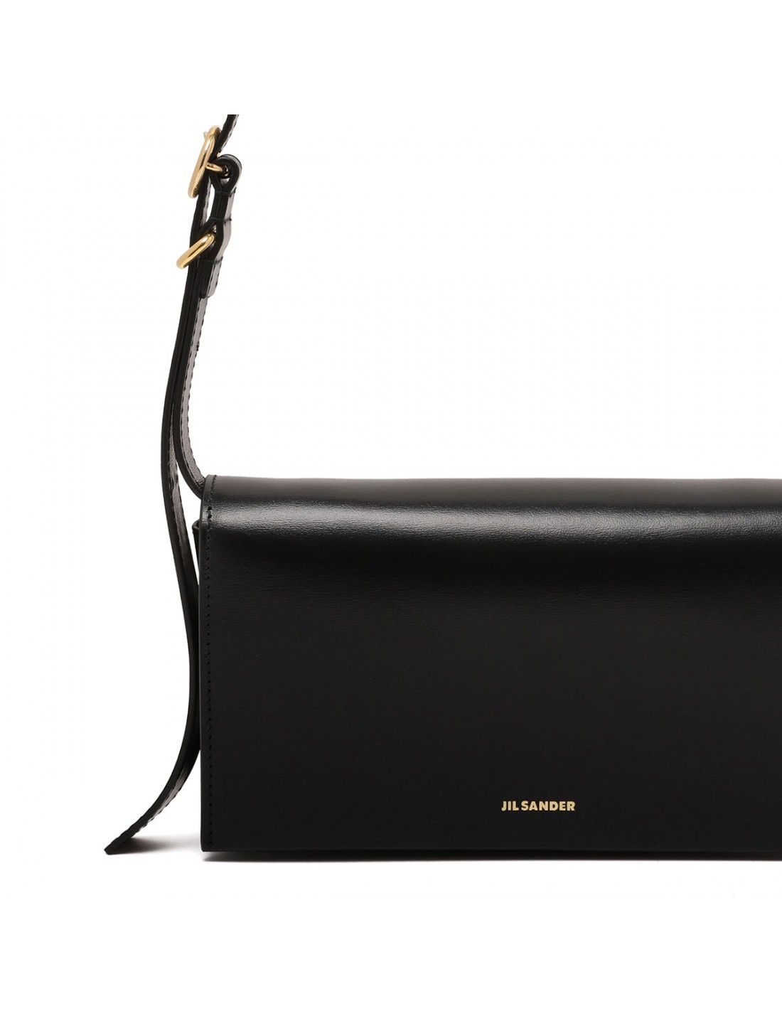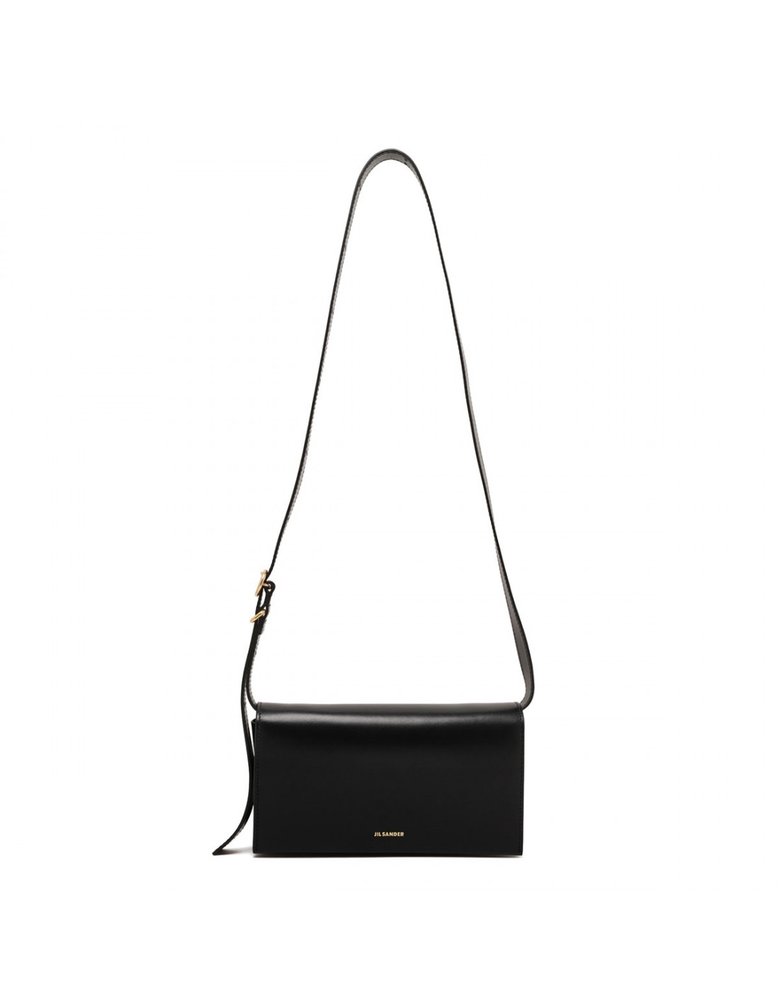 Black leather All-Day small bag from Jil Sander featuring rectangular shape, embossed Jil Sander logo, adjustable leather shoulder strap with buckle, snap button fastening, nappa lining, internal zipped pocket and compartments.