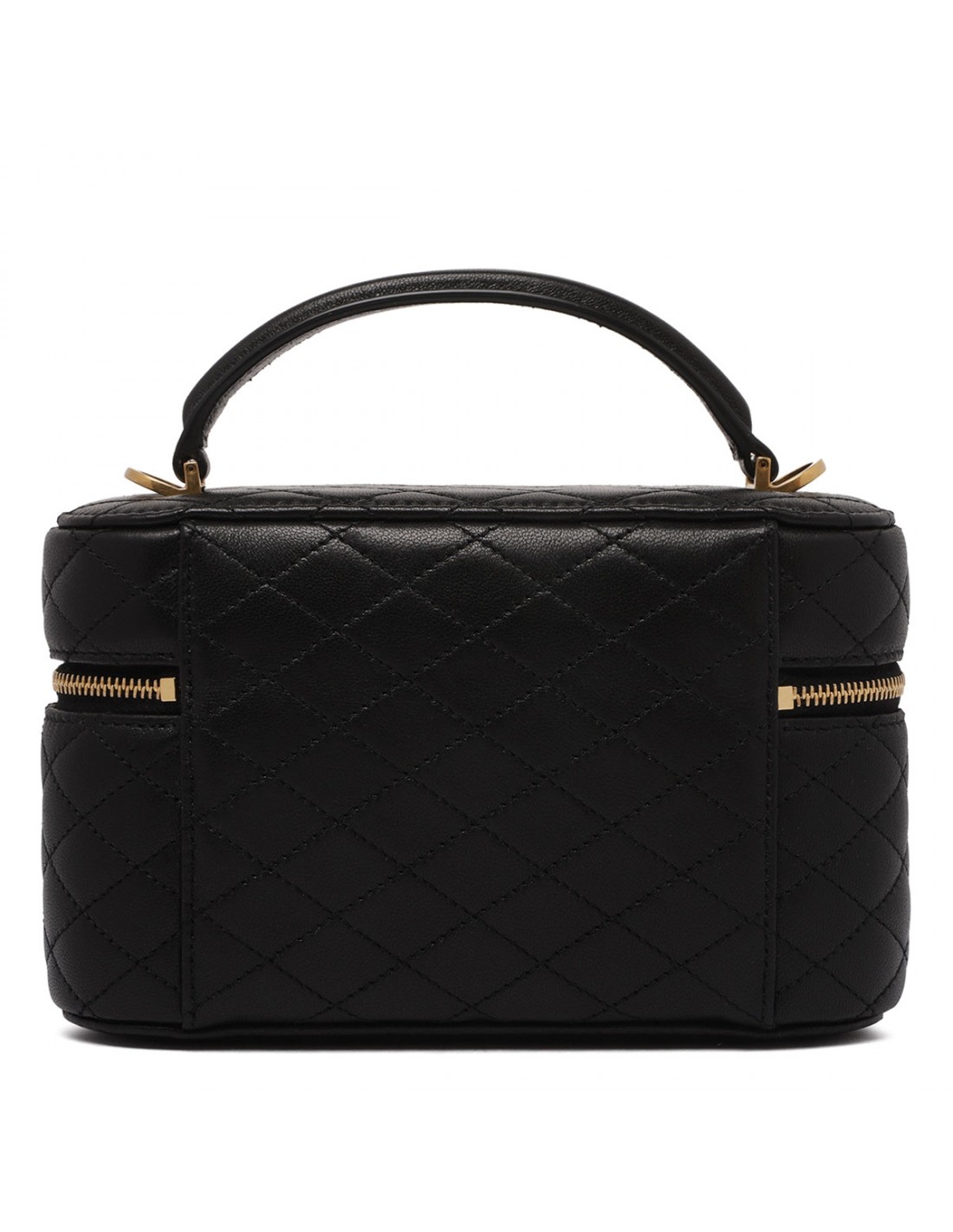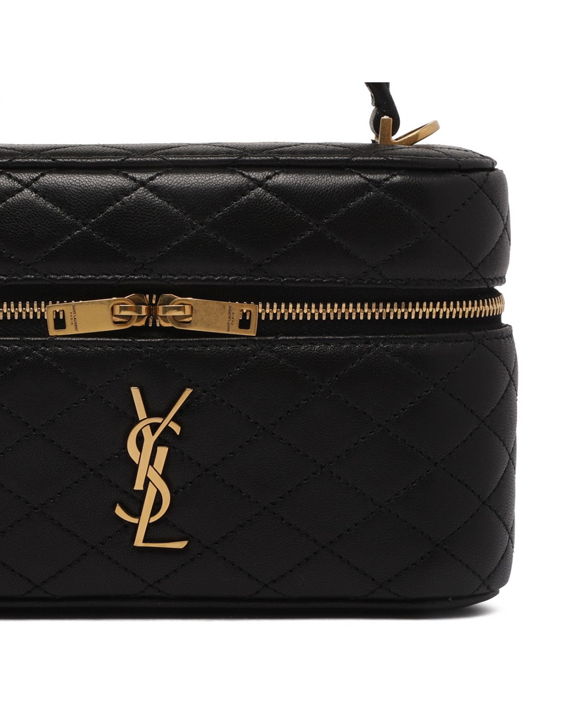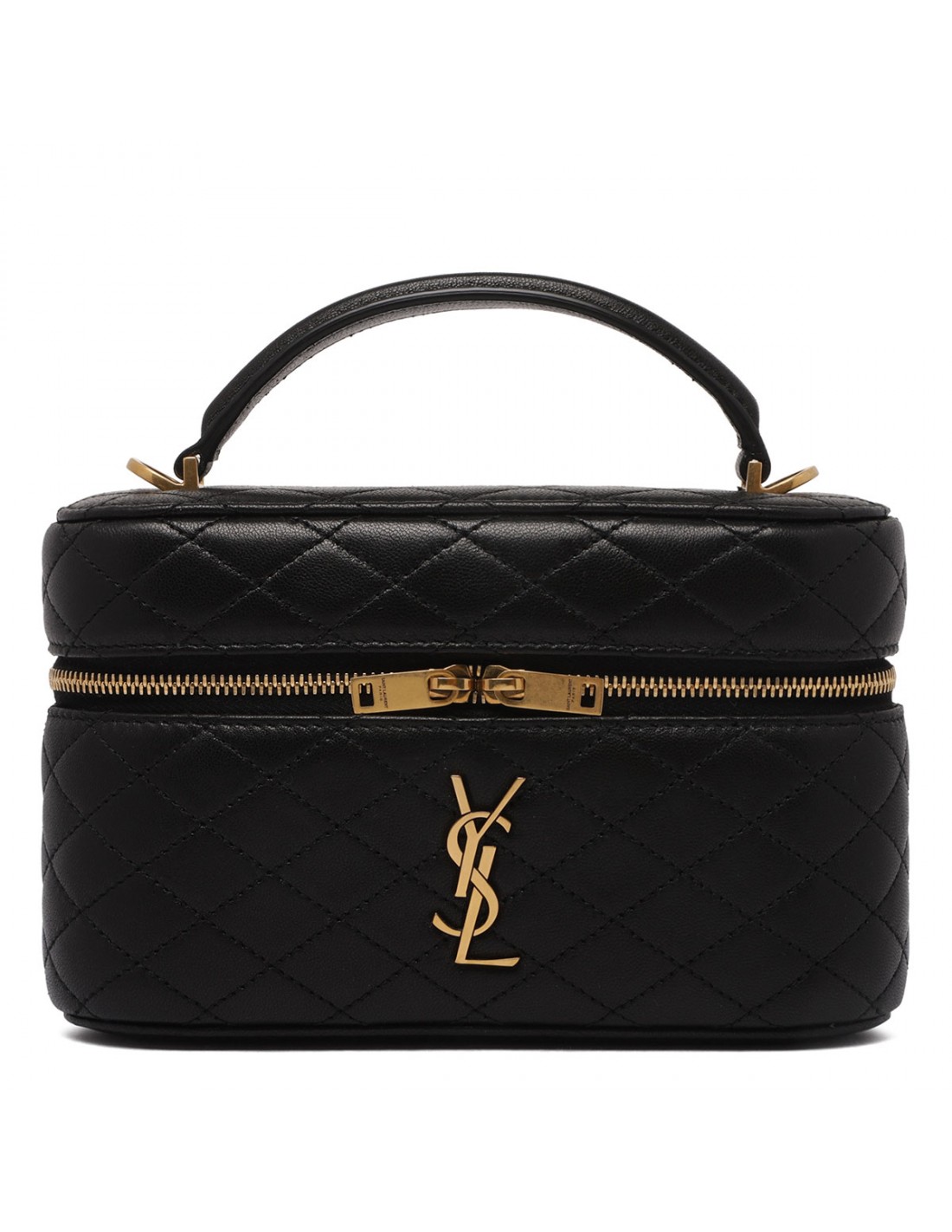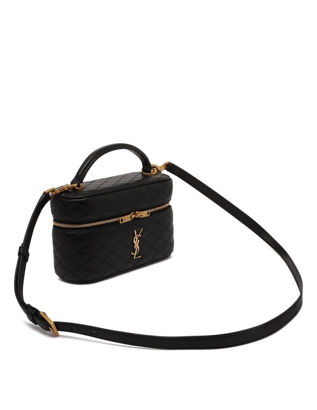 Black matelassé leather Gaby vanity bag from Saint Laurent featuring Cassandre decoration, diamond-quilted overstitching, adjustable and detachable chain strap, zip closure, bronze-toned hardware, leather lining and one card slot.