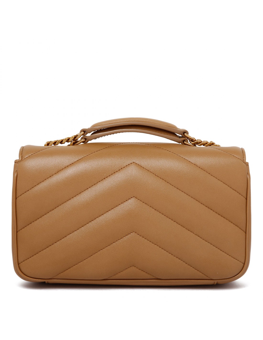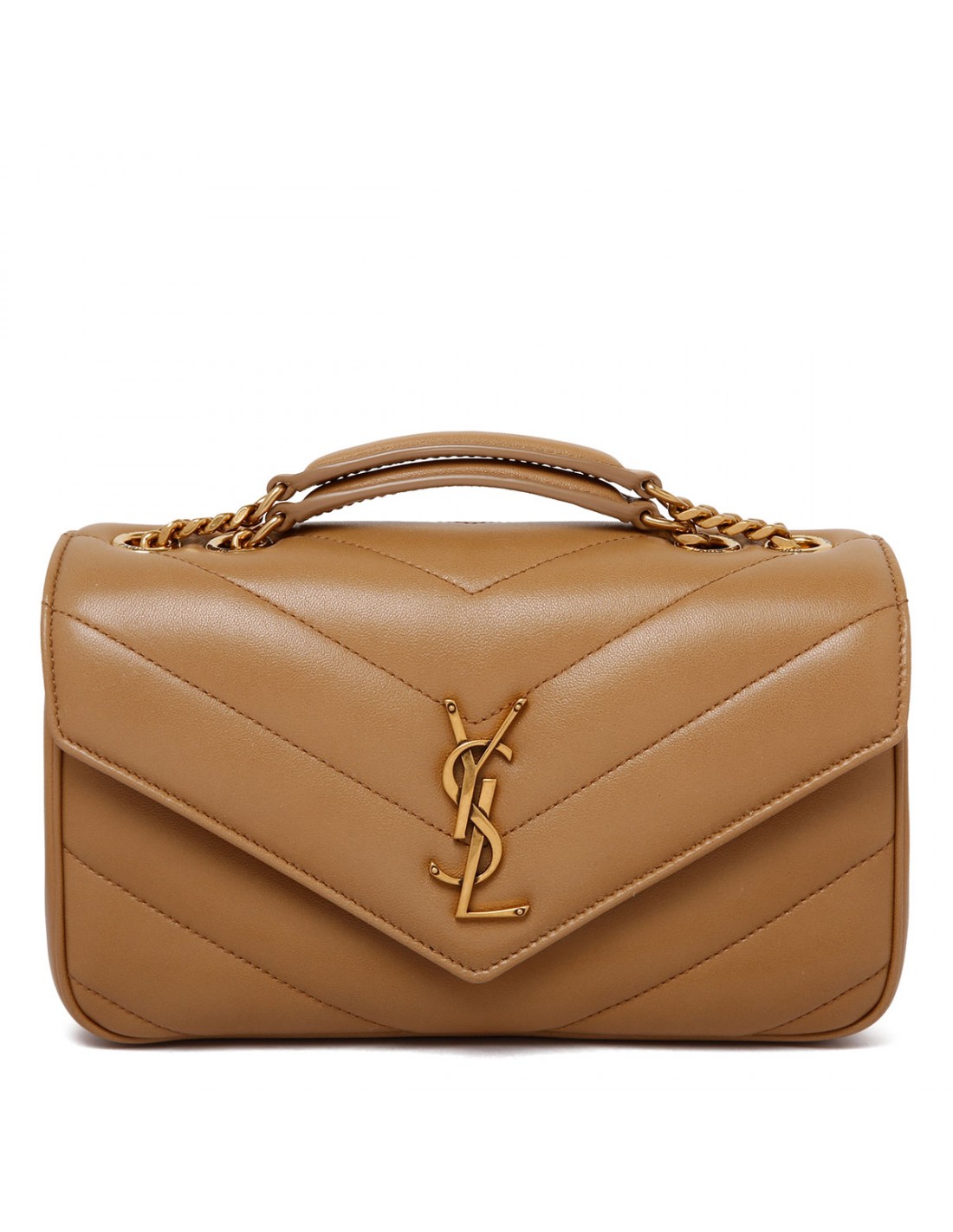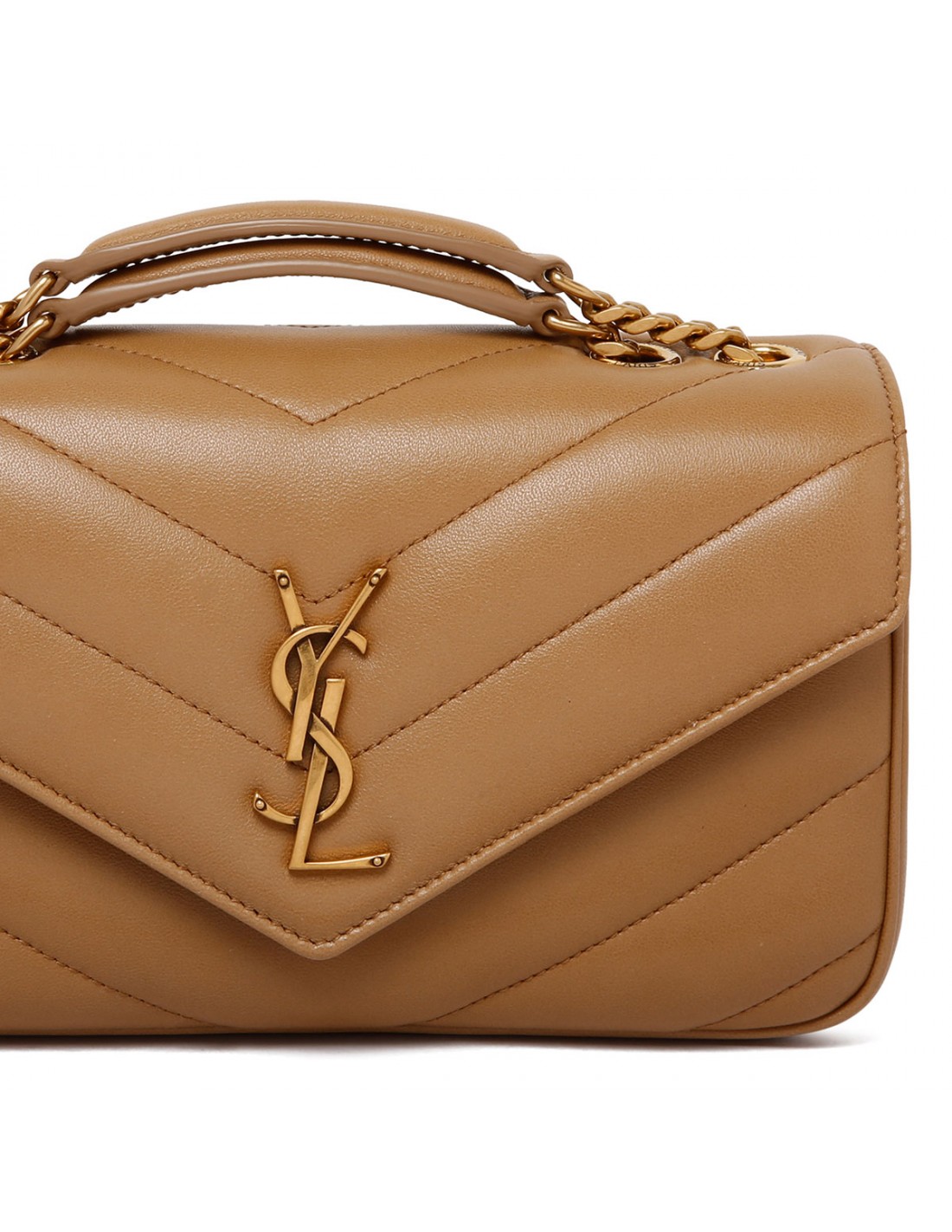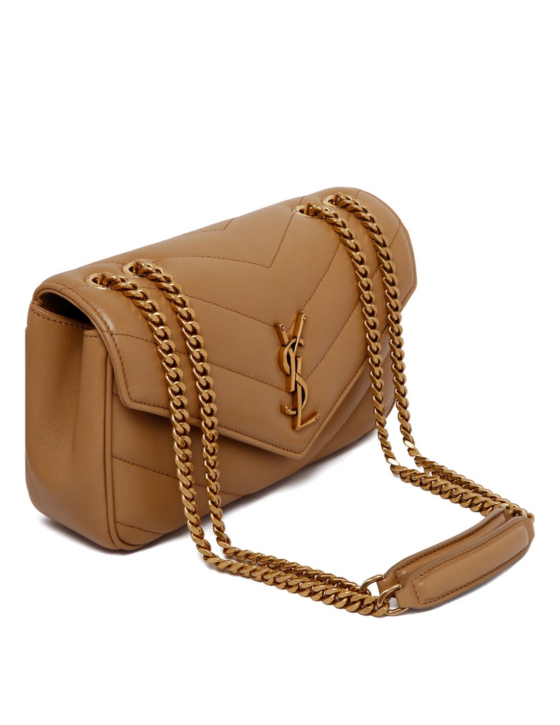 Natural tan hue matelassé Y leather Loulou small shoulder bag from Saint Laurent featuring golden metal interlocking YSL logo, sliding chain shoulder strap with leather detail, front flap with magnetic fastening, leather lining, internal flat pocket.