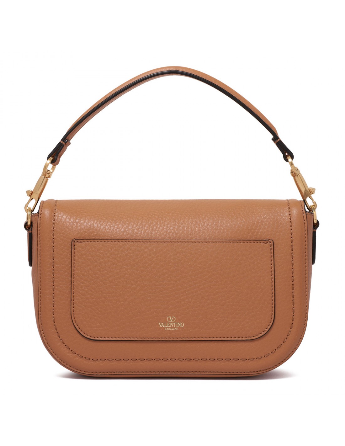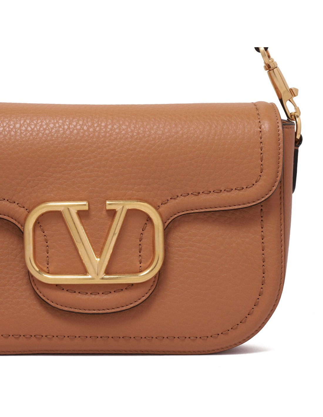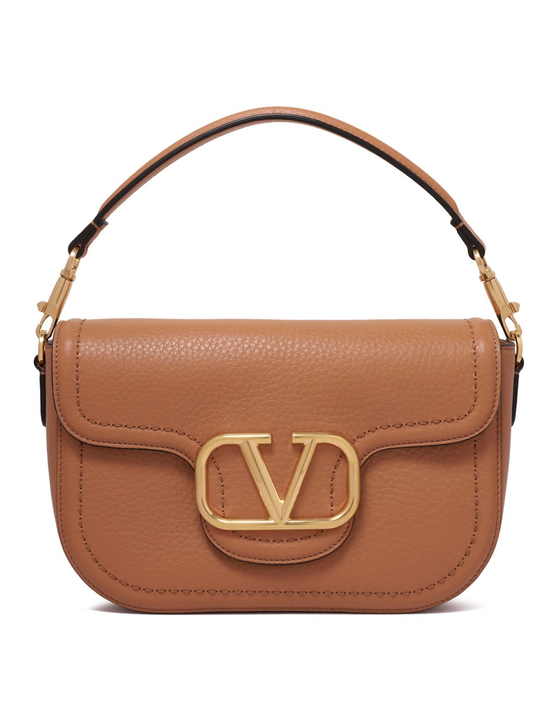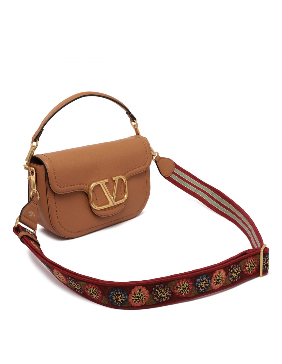 Almond beige grainy leather Alltime shoulder bag from Valentino Garavani featuring metallic VLogo Signature detail, detachable top handle, detachable and adjustable jacquard ribbon shoulder strap with floral pattern, magnetic closure, nappa leather lining and one internal slip pocket.