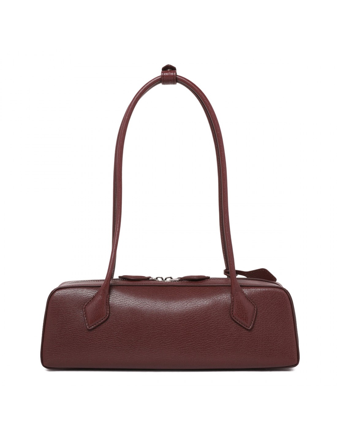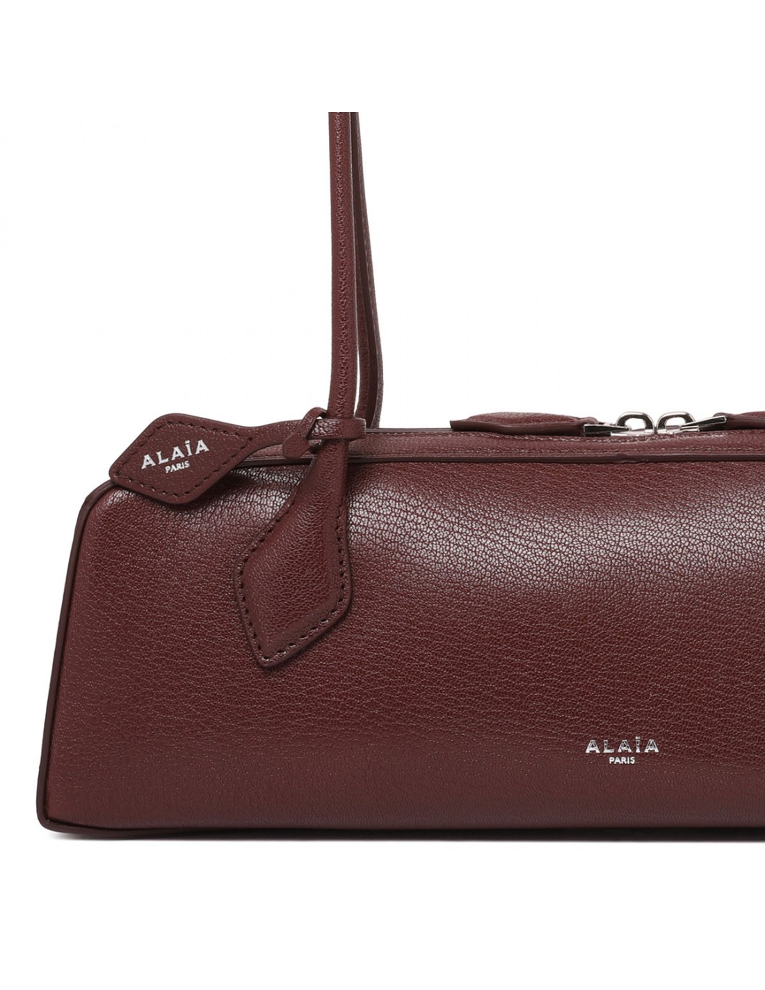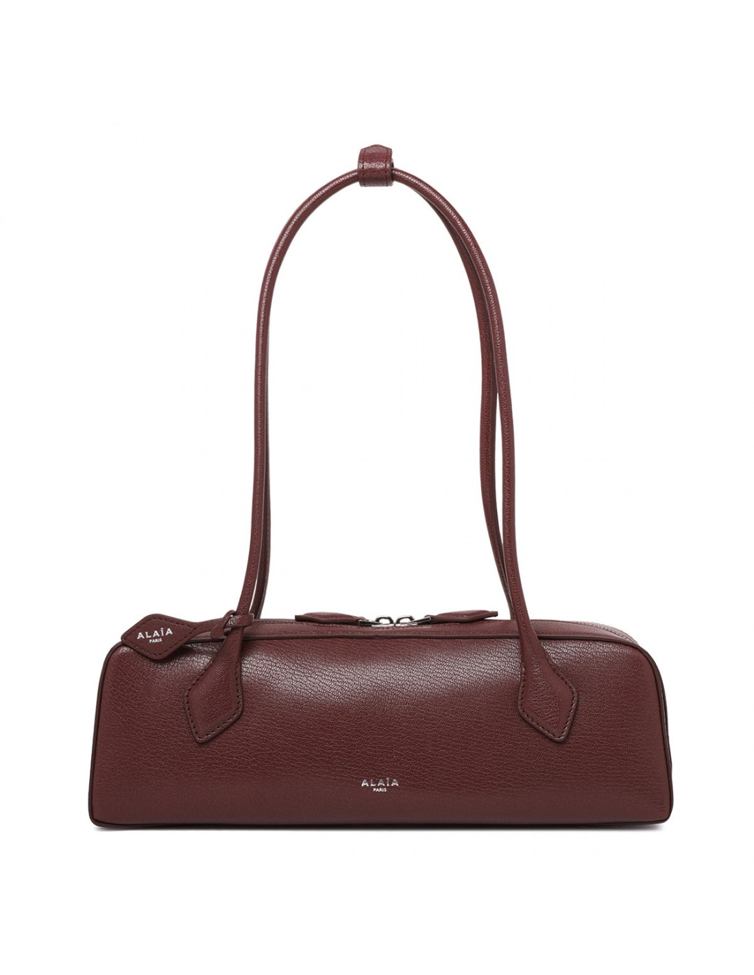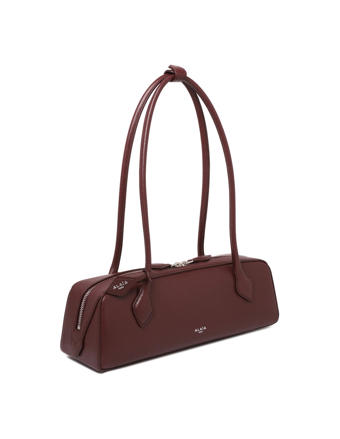 Rouge grenat leather Le Teckel medium bag from Alaia featuring elongated shape, double tubular leather top handle with two decorative ties, two-way zip fastening along top, detachable small mirror in the inner pocket.