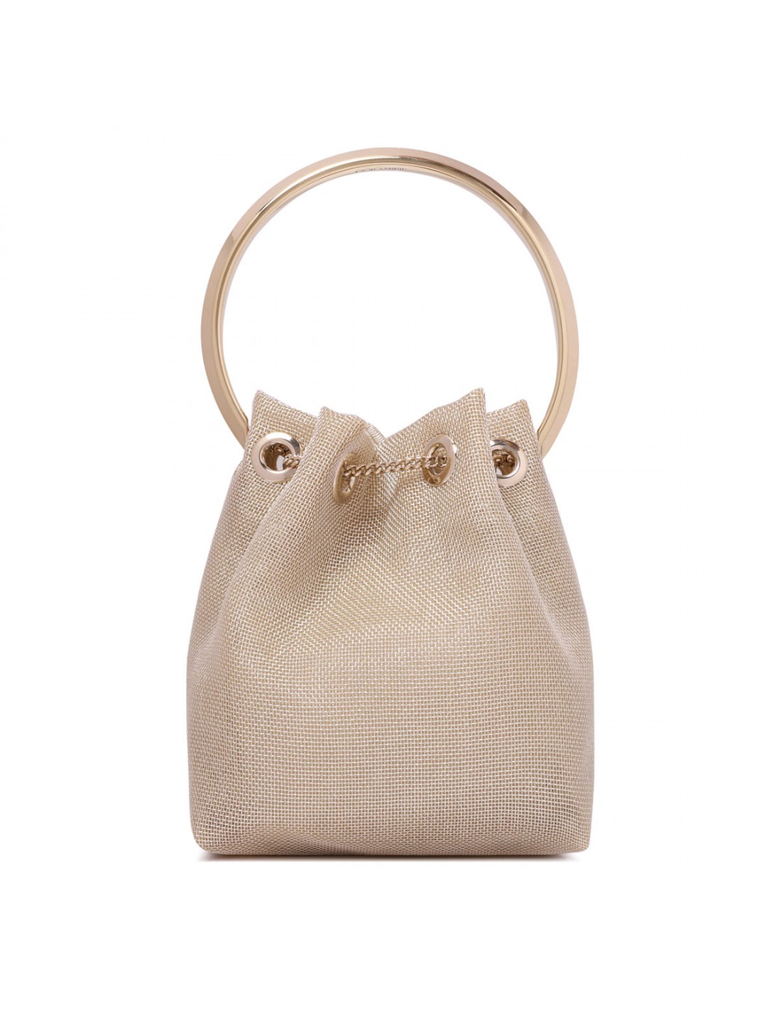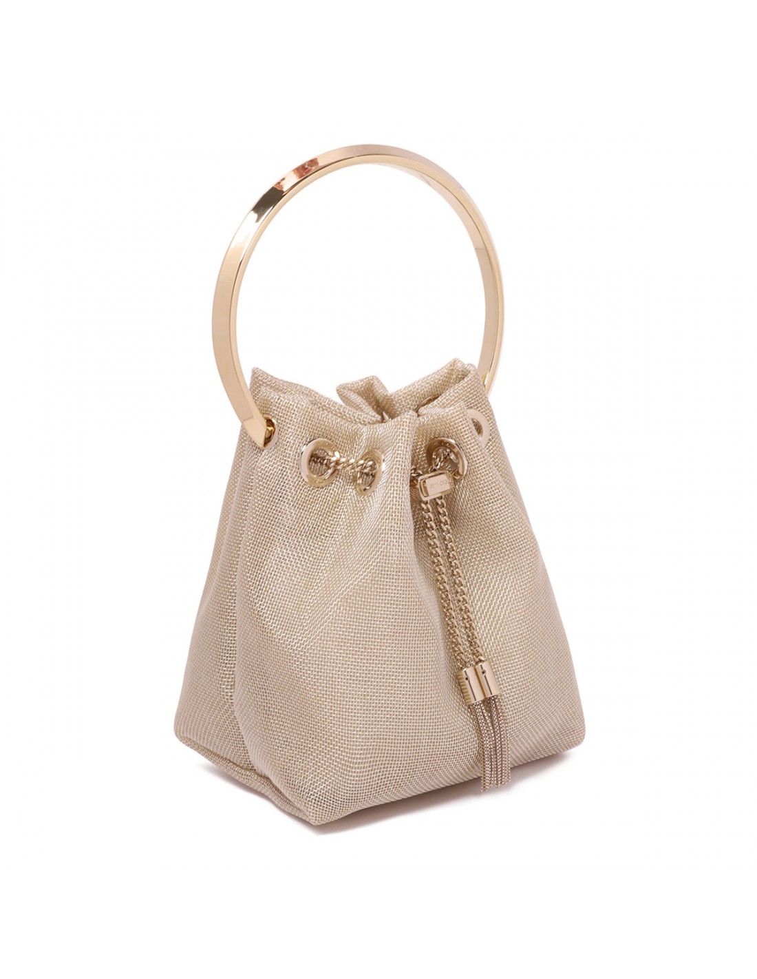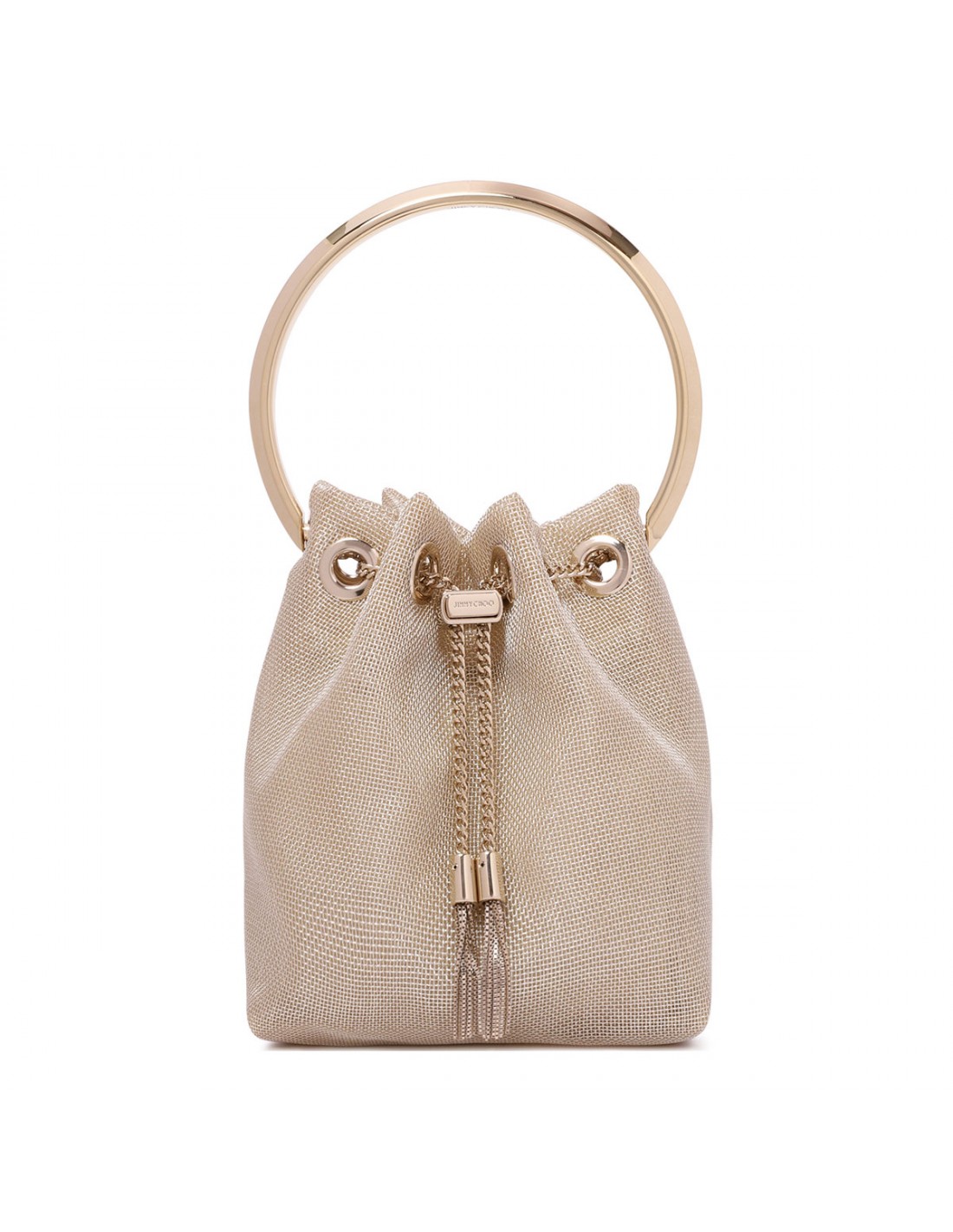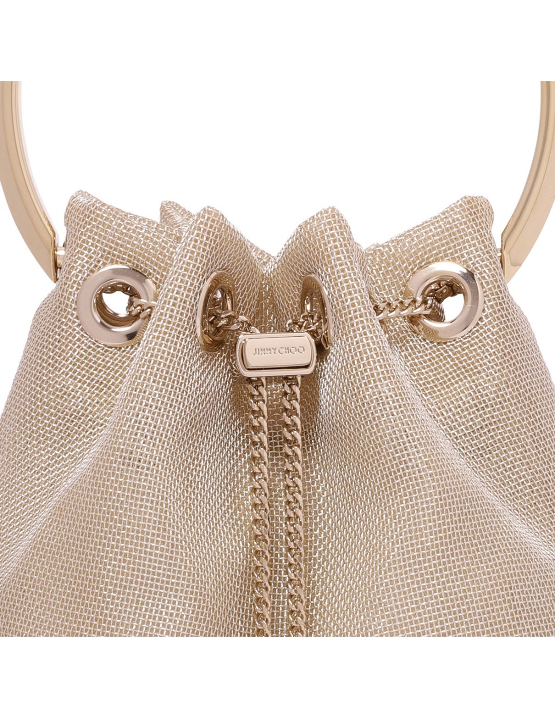 Champagne hue metallic mesh Bon Bon bag from Jimmy Choo featuring bucket silhouette, metal bracelet handle, chain shoulder strap, metal tassel fastening with logo engraved.