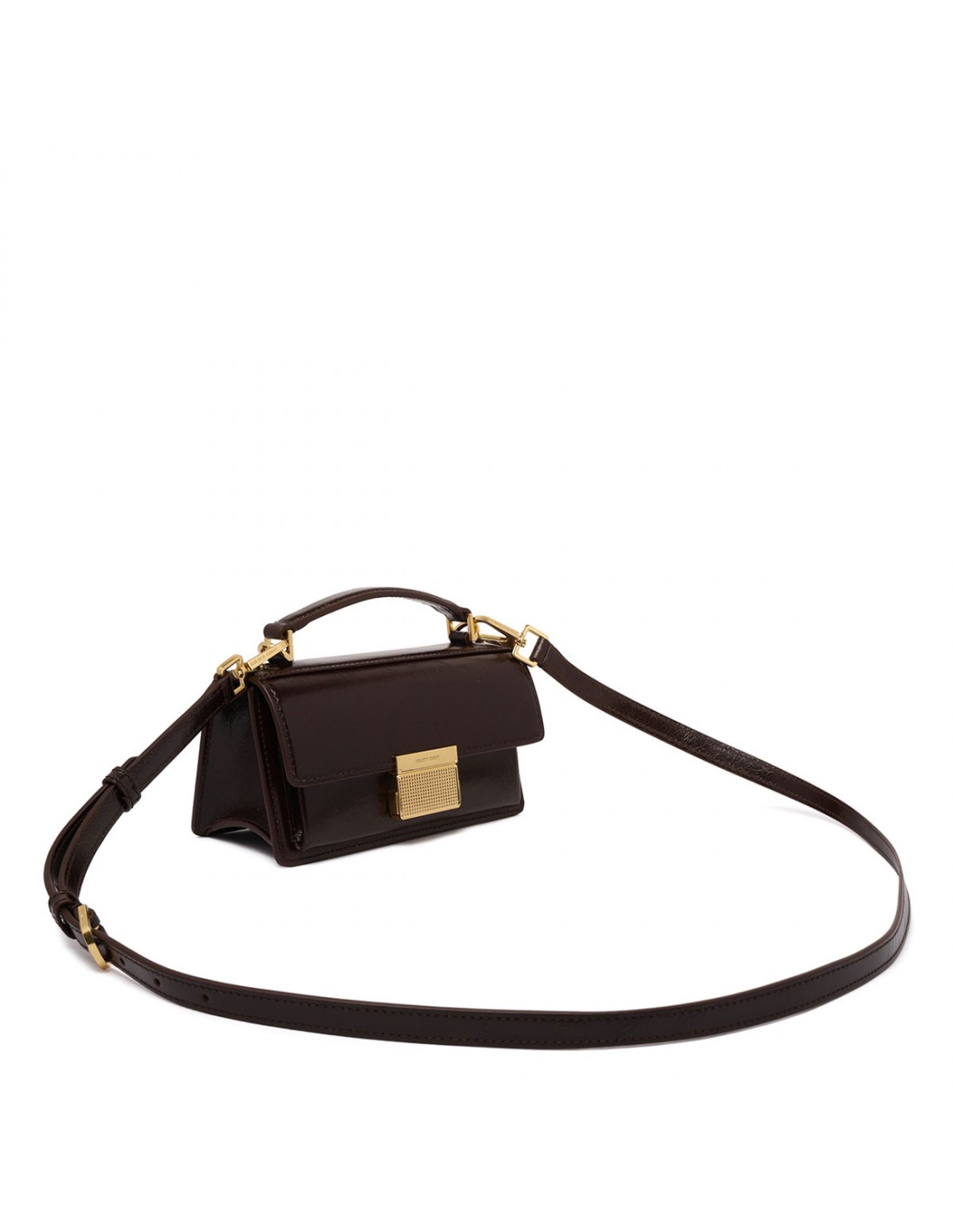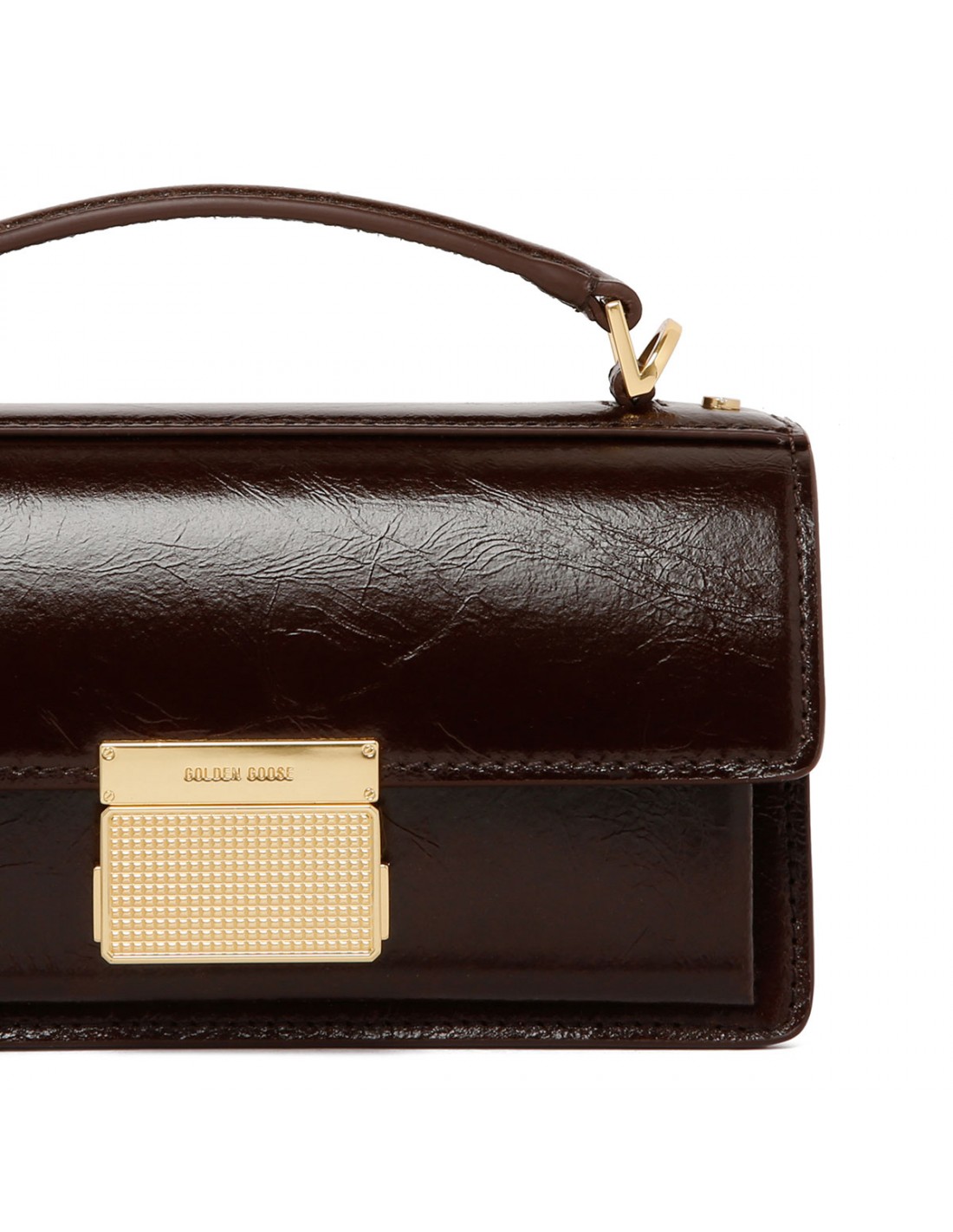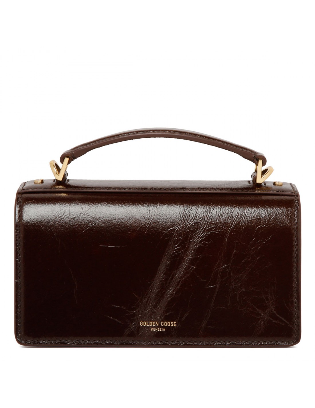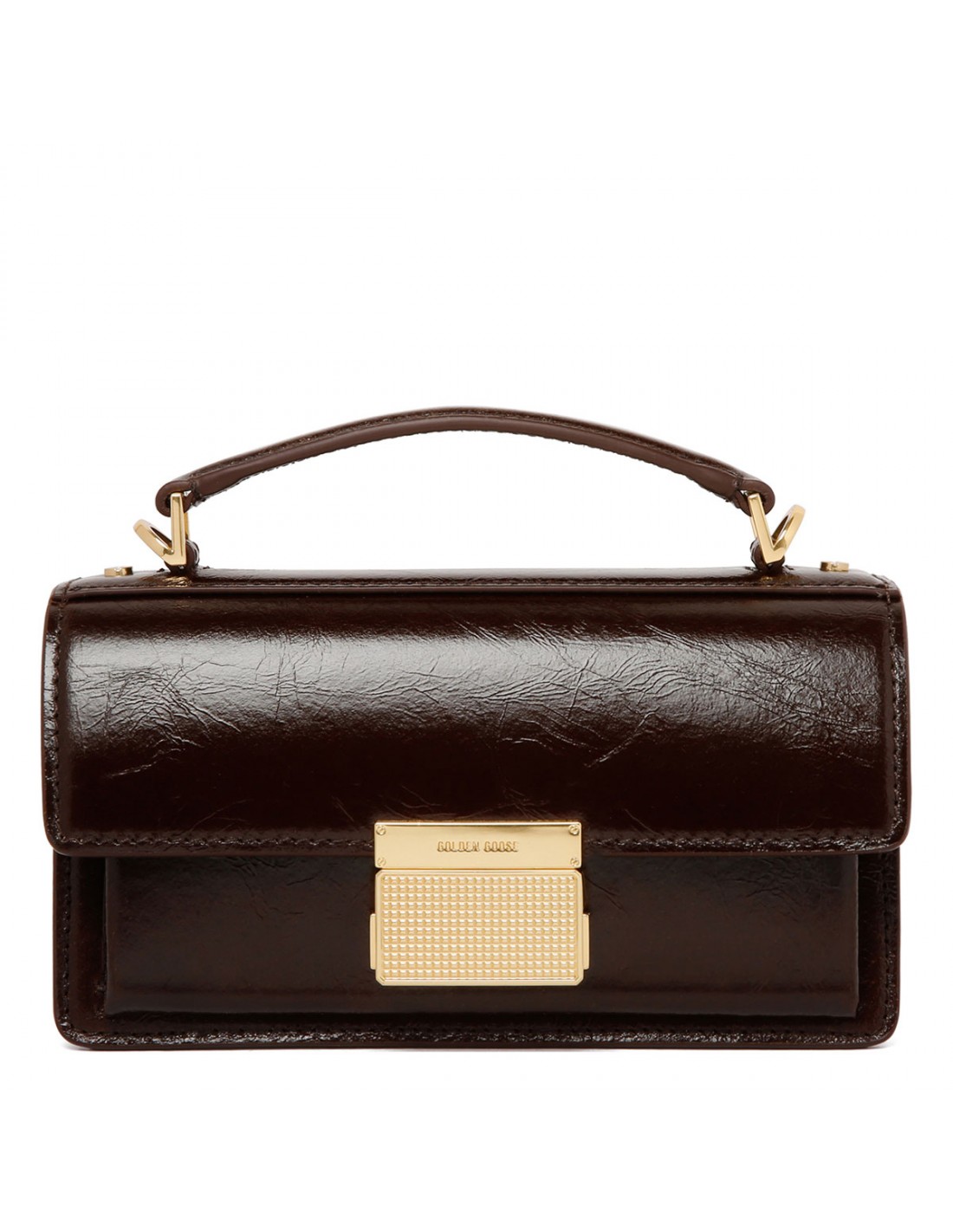 Dark brown shiny wavy leather Venezia small bag from Golden Goose featuring top handle, gold buckle fastening with side buttons, top handle, adjustable shoulder strap with snap hook, logo on the back, double inside pocket, internal card holder.