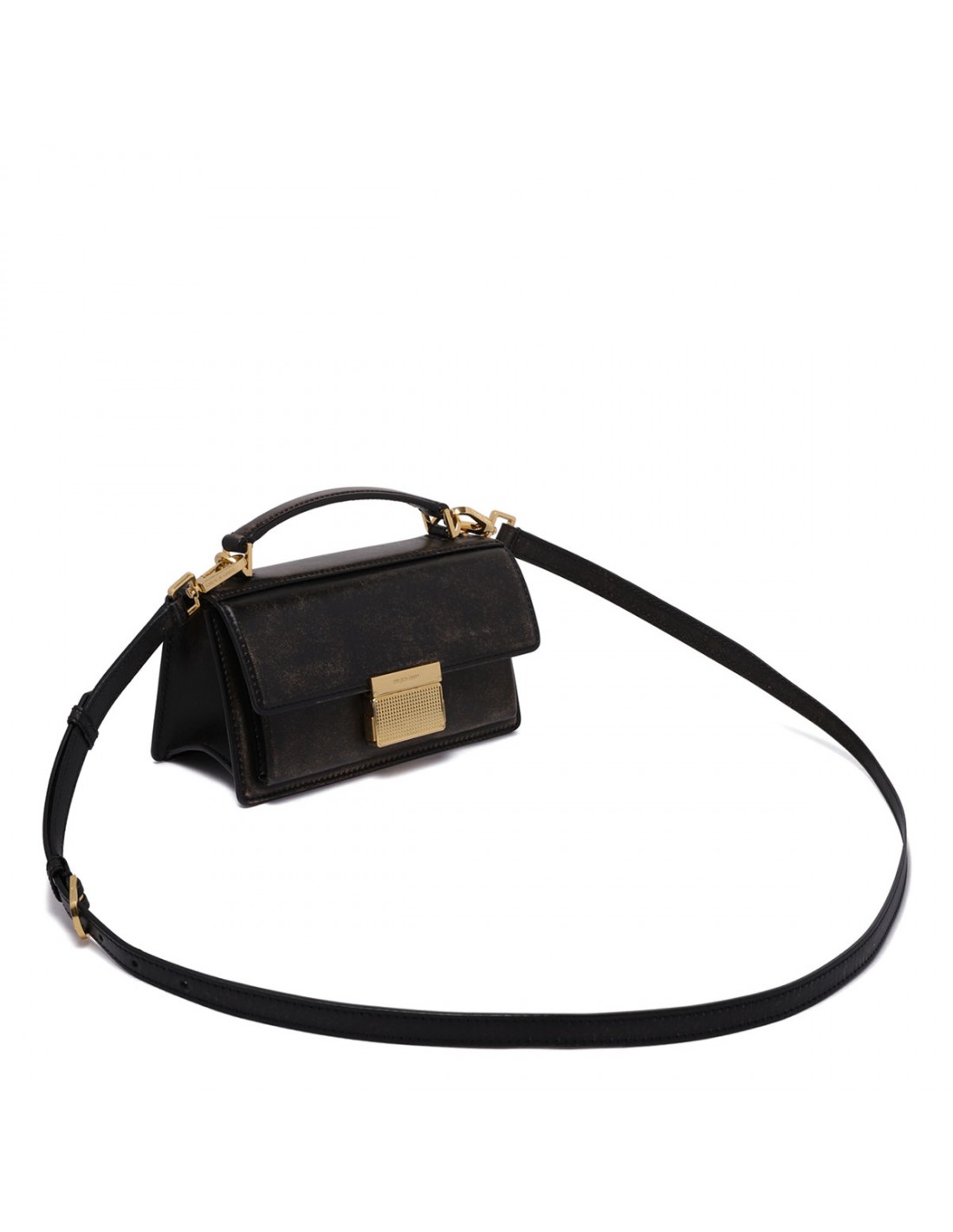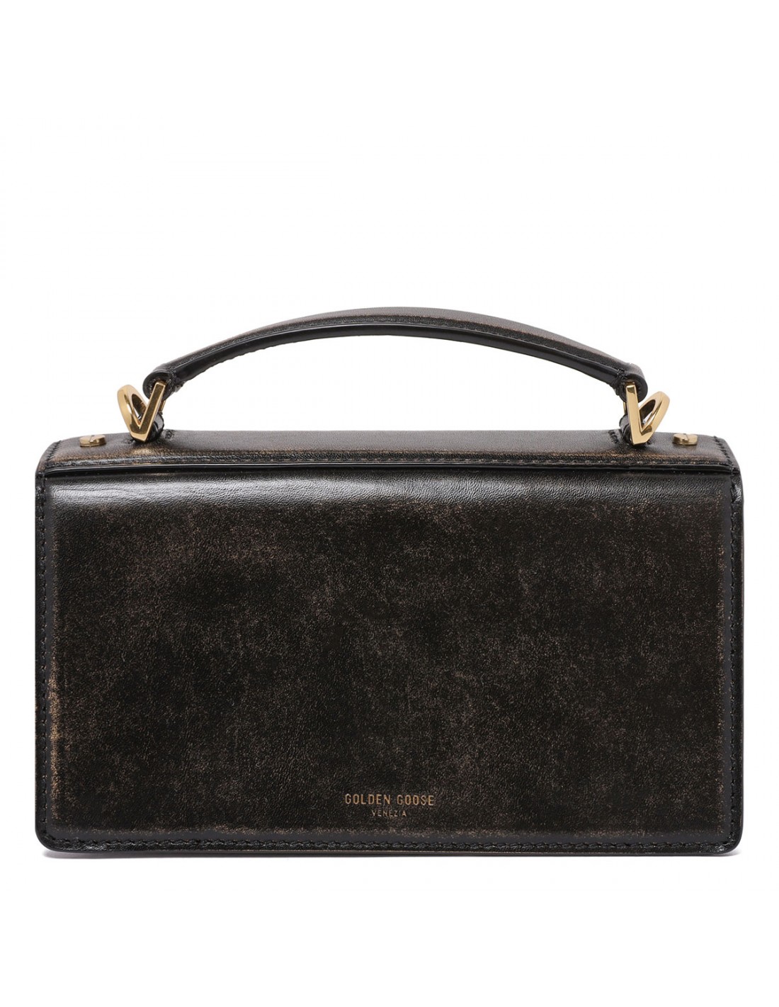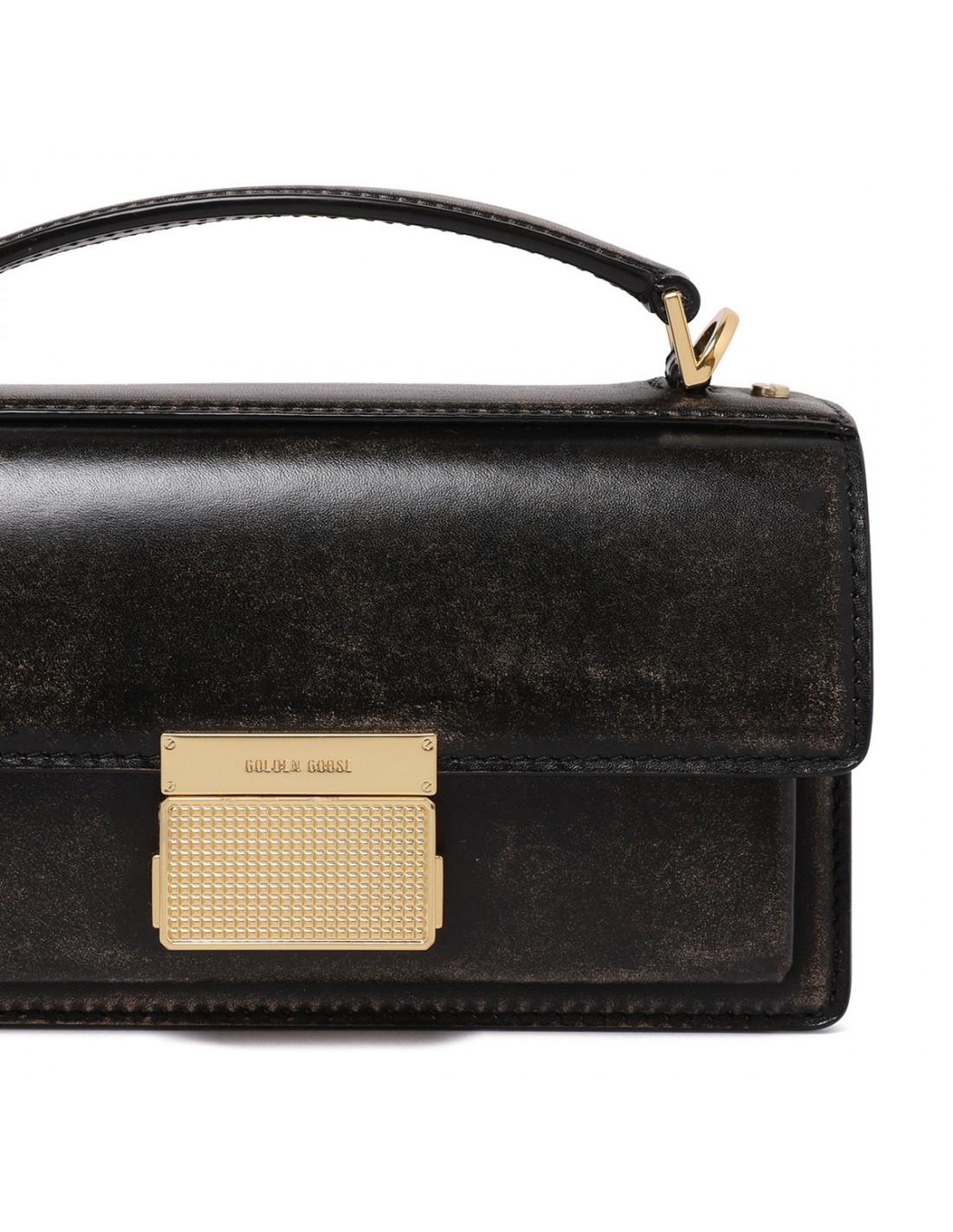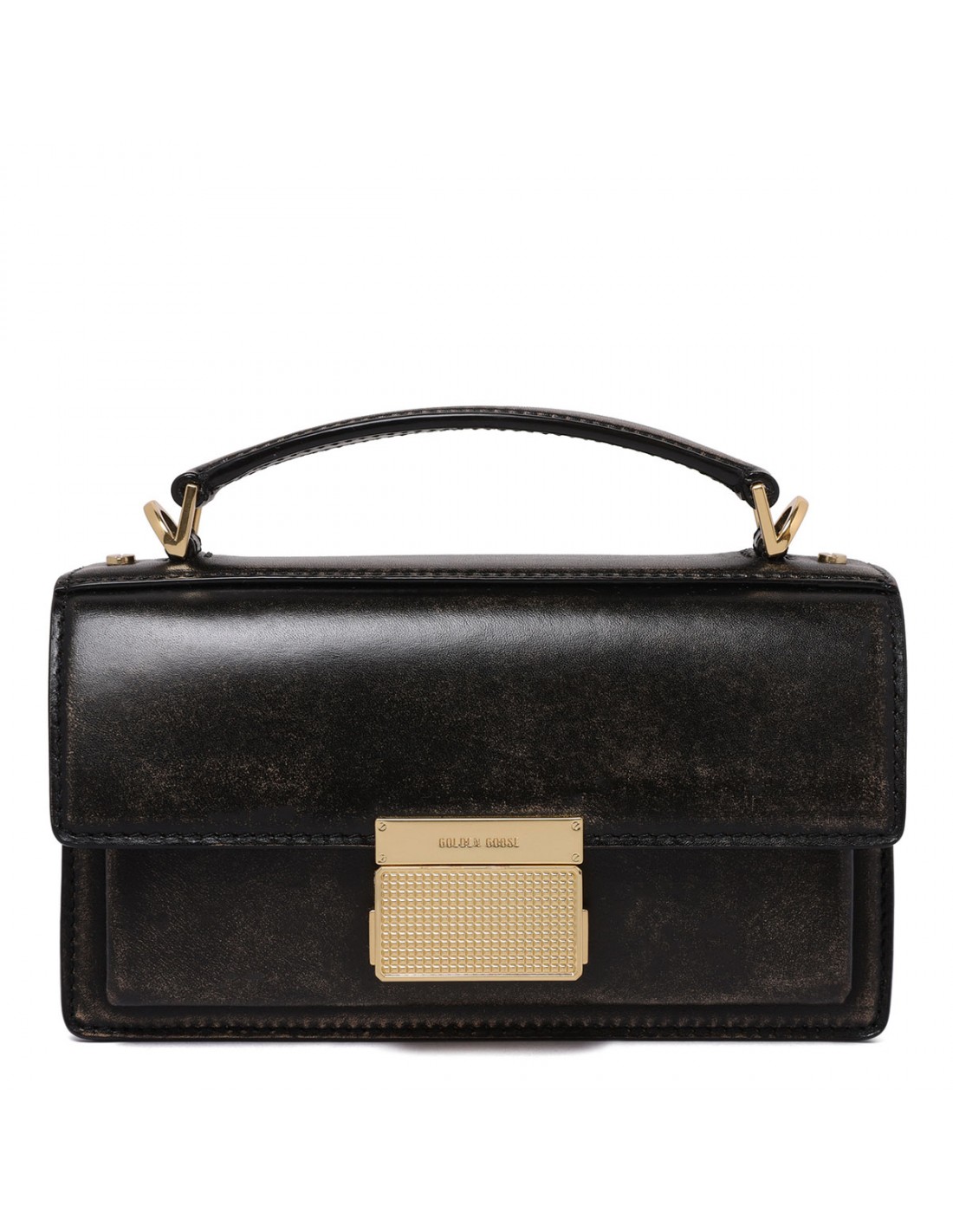 Black distressed leather Venezia small bag from Golden Goose featuring top handle, gold buckle fastening with side buttons, top handle, adjustable shoulder strap with snap hook, logo on the back, double inside pocket, internal card holder.