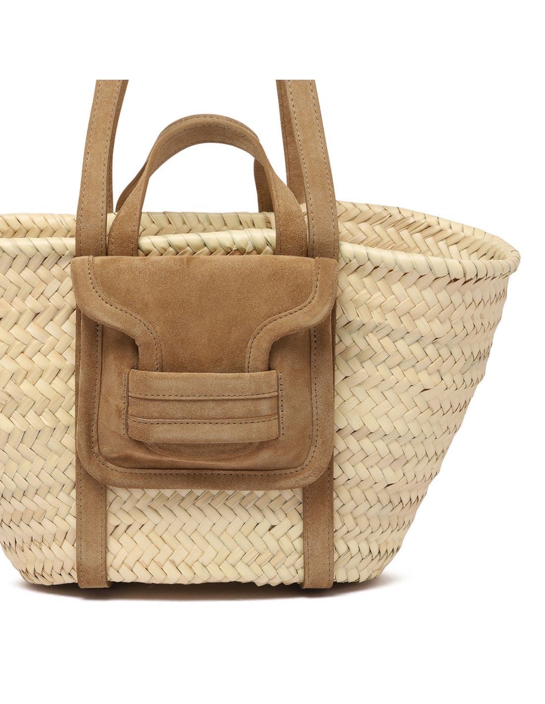 Natural raffia and sand suede calfskin Panier Mini Alpha bag from Pierre Hardy featuring leather shoulder straps and top handles, leather interior base, leather Alpha pocket, internal leather pouch.