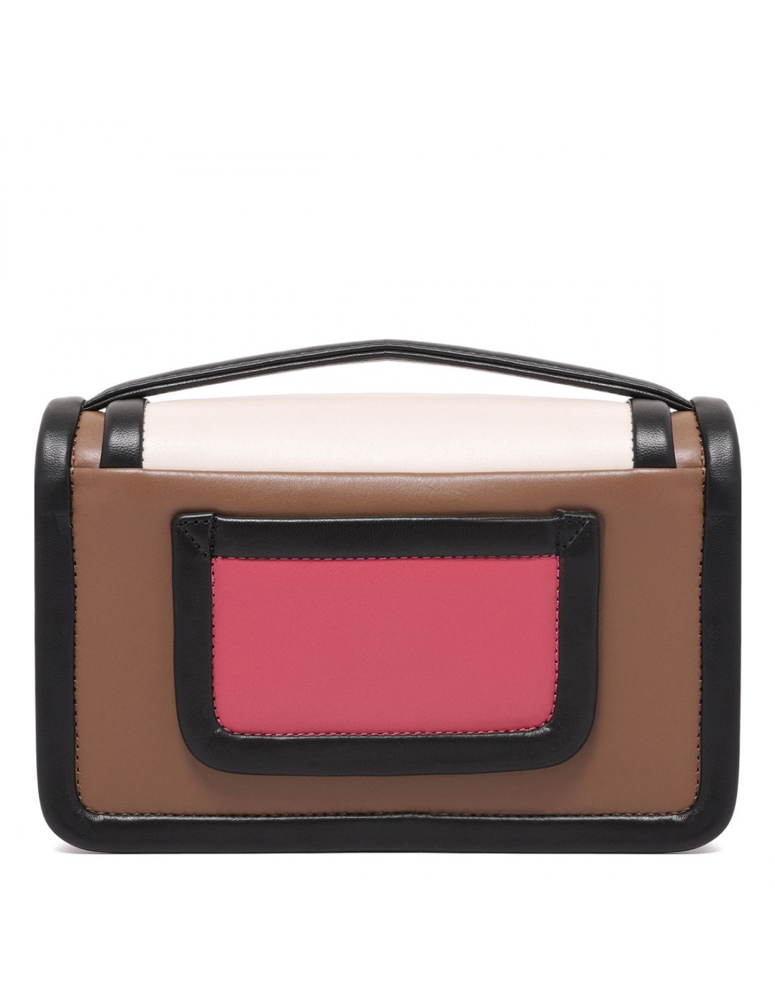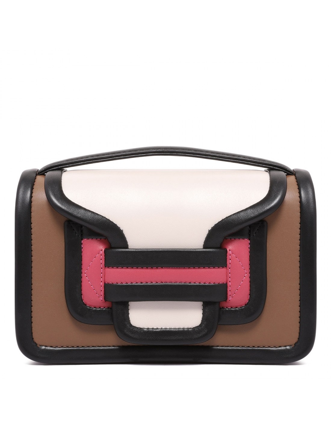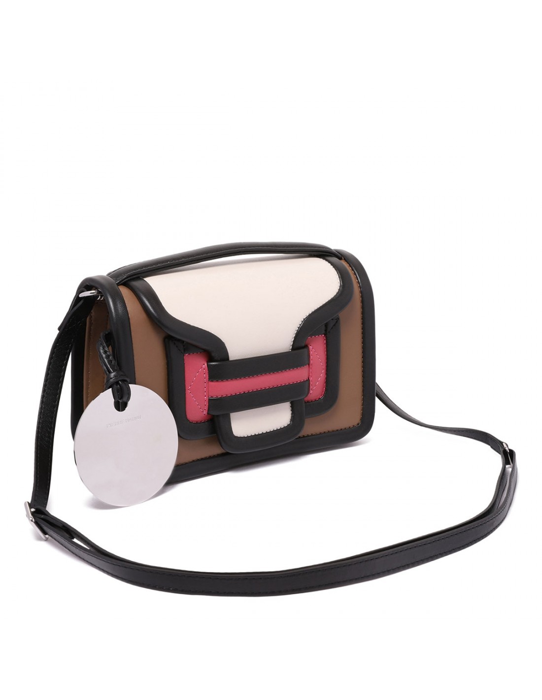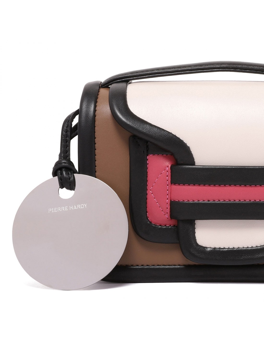 Camel, off white, rosewood hue leather Alpha shoulder bag from Pierre Hardy featuring adjustable and detachable shoulder strap, top handle, front flap with concealed magnetic fastening, pocket at the back, internal small round mirror and slot pocket.