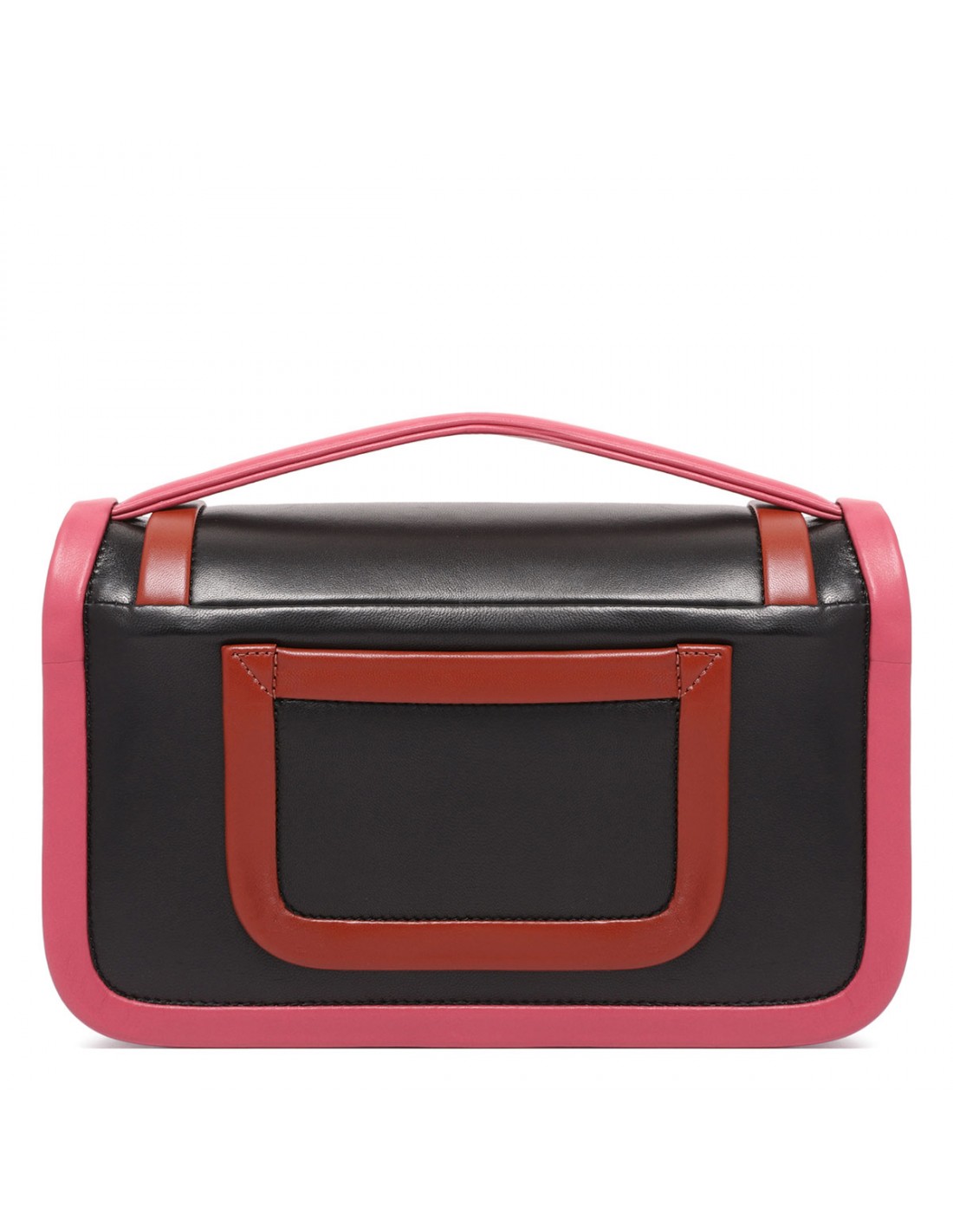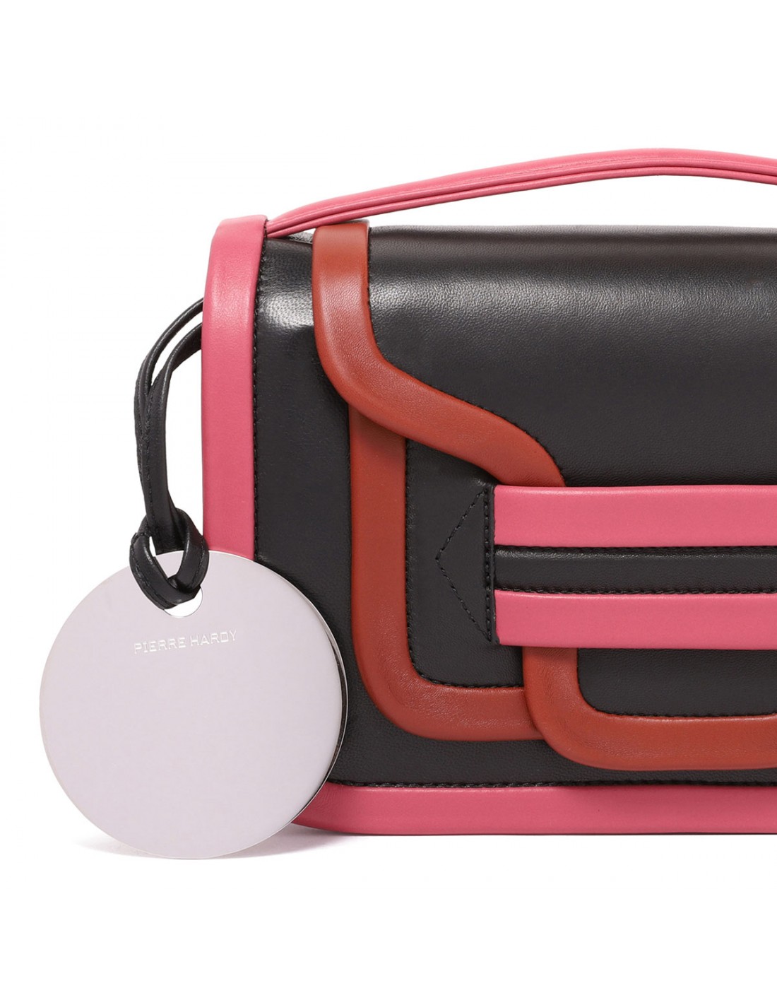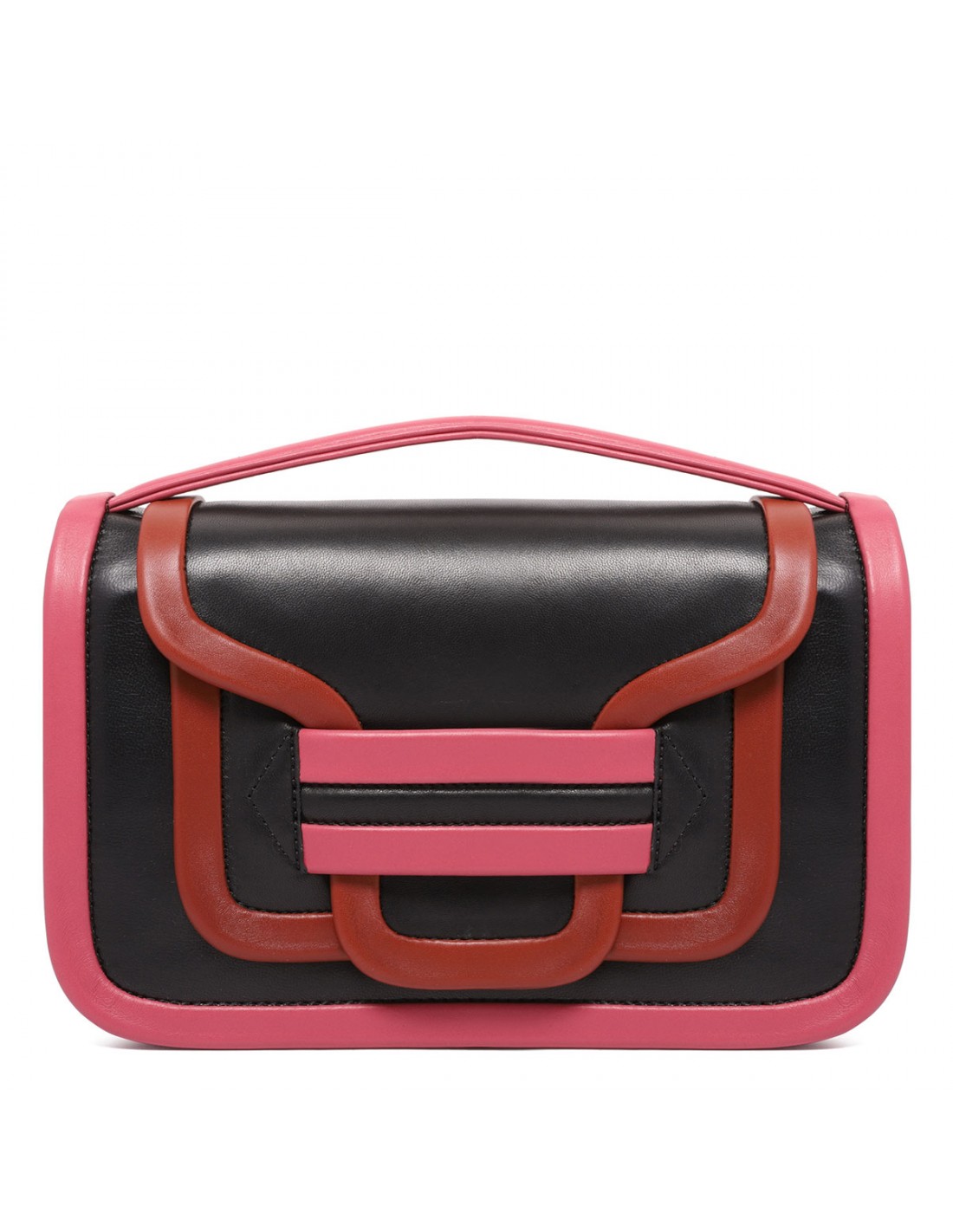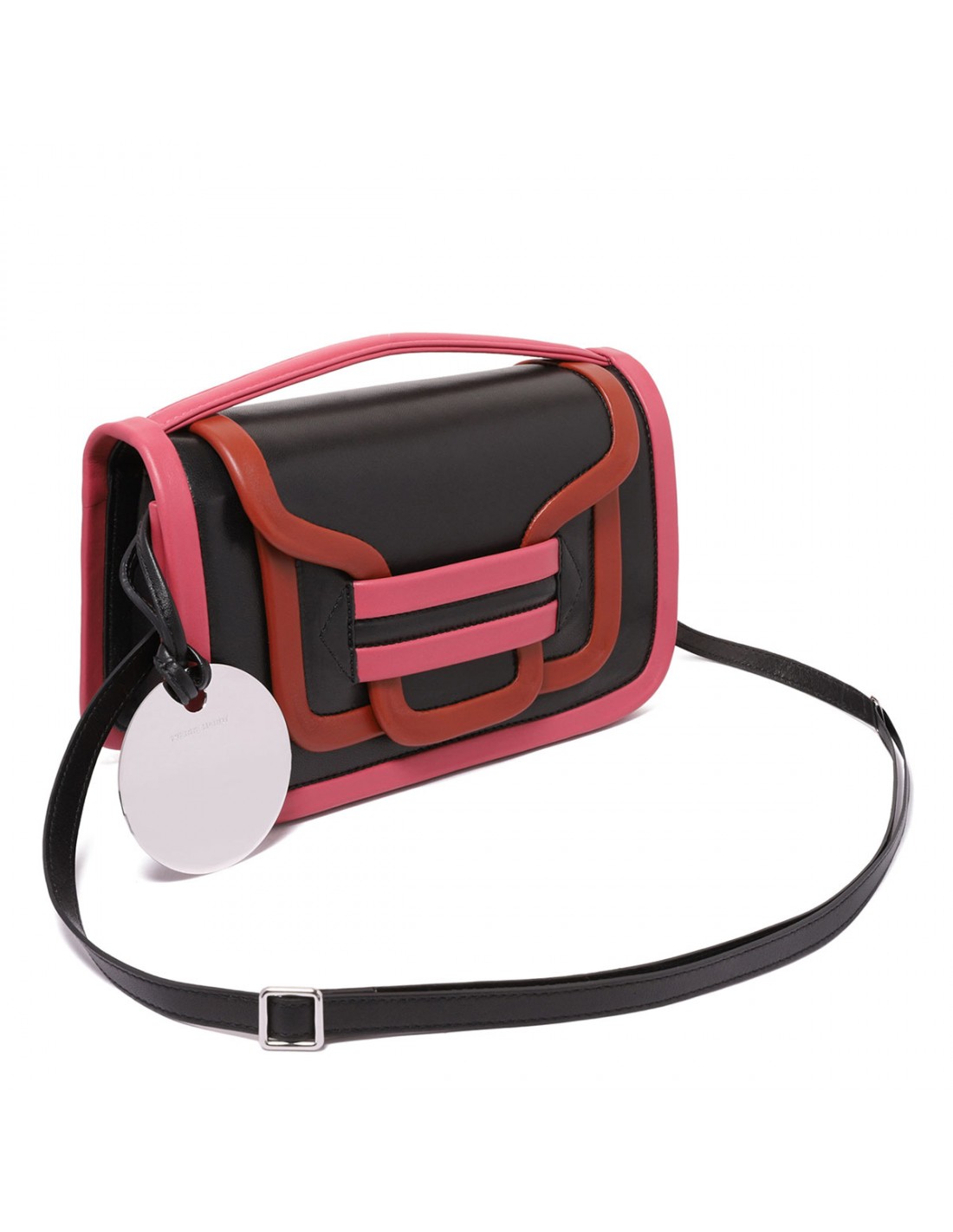 Black, rust and rosewood hue leather Alpha maxi shoulder bag from Pierre Hardy featuring adjustable and detachable shoulder strap, top handle, front flap with concealed magnetic fastening, pocket at the back, internal small round mirror and flat pocket.