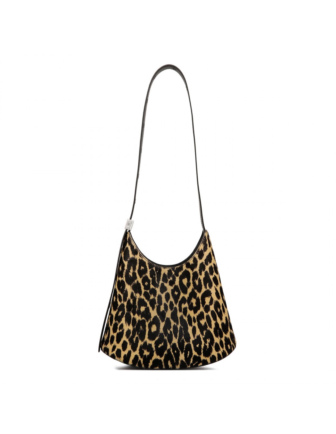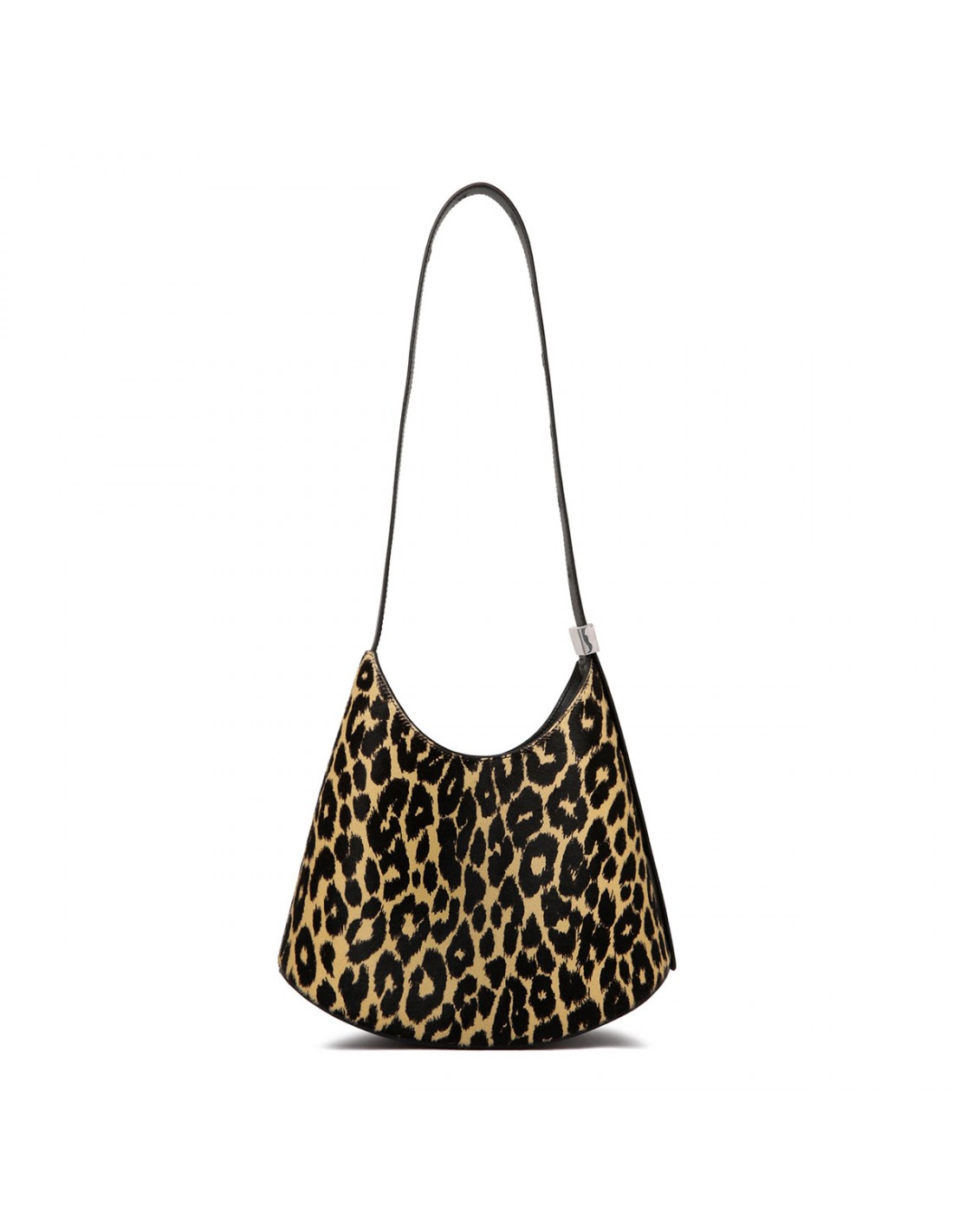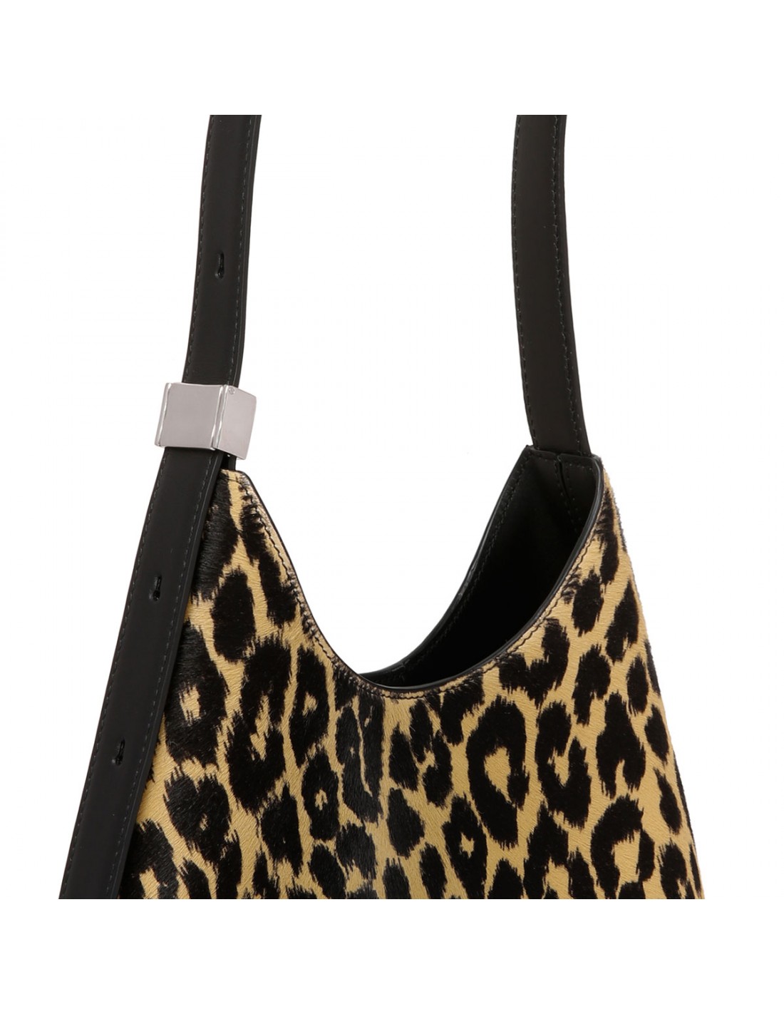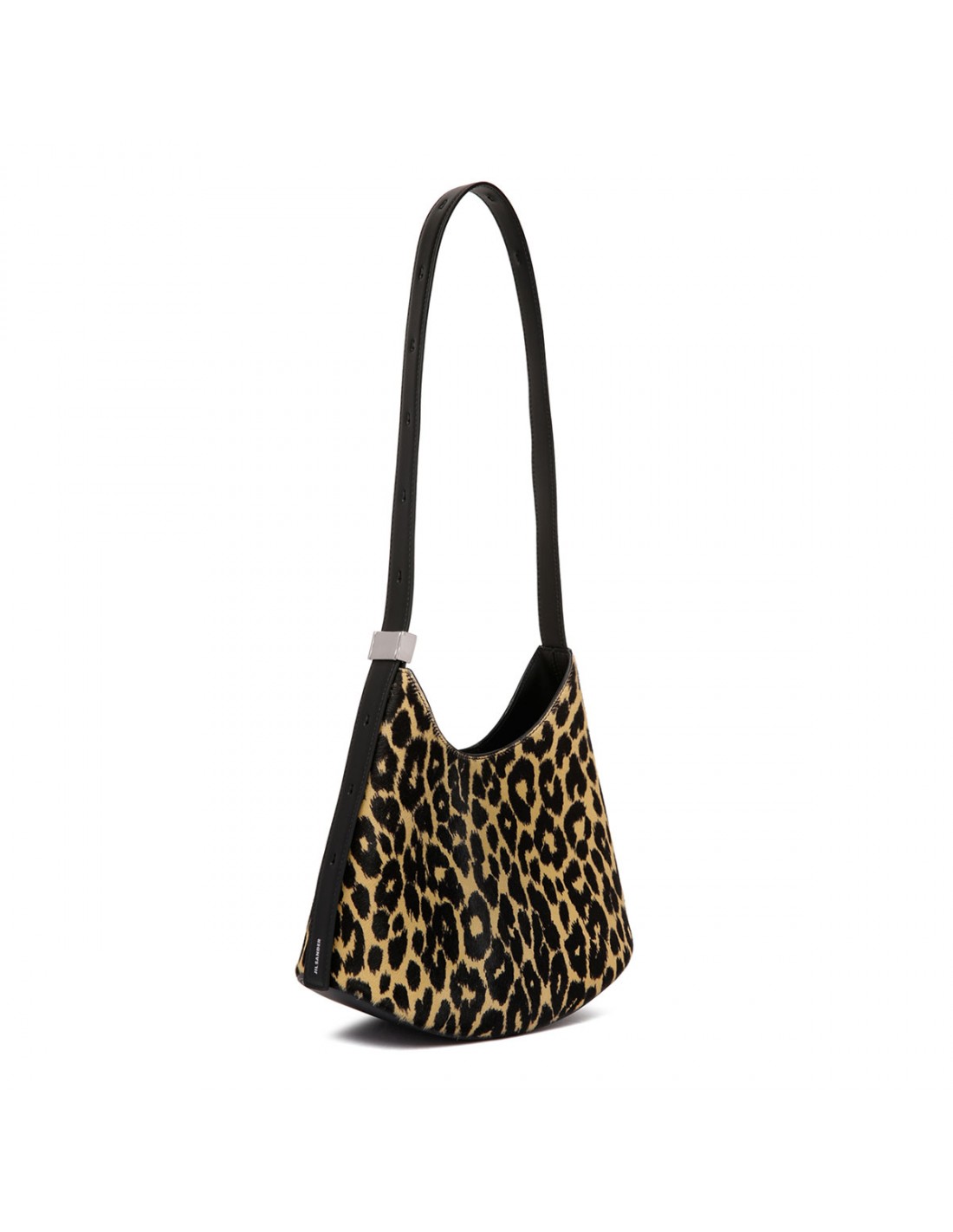 Beige and black calf hair leather Eldorado small shoulder bag from Jil Sander featuring leopard motif printed allover, adjustable leather shoulder strap with metal jewel buckle, contrasting color curved base, embossed Jil Sander logo, magnetic button closure, nappa lining, internal flat leather pocket.