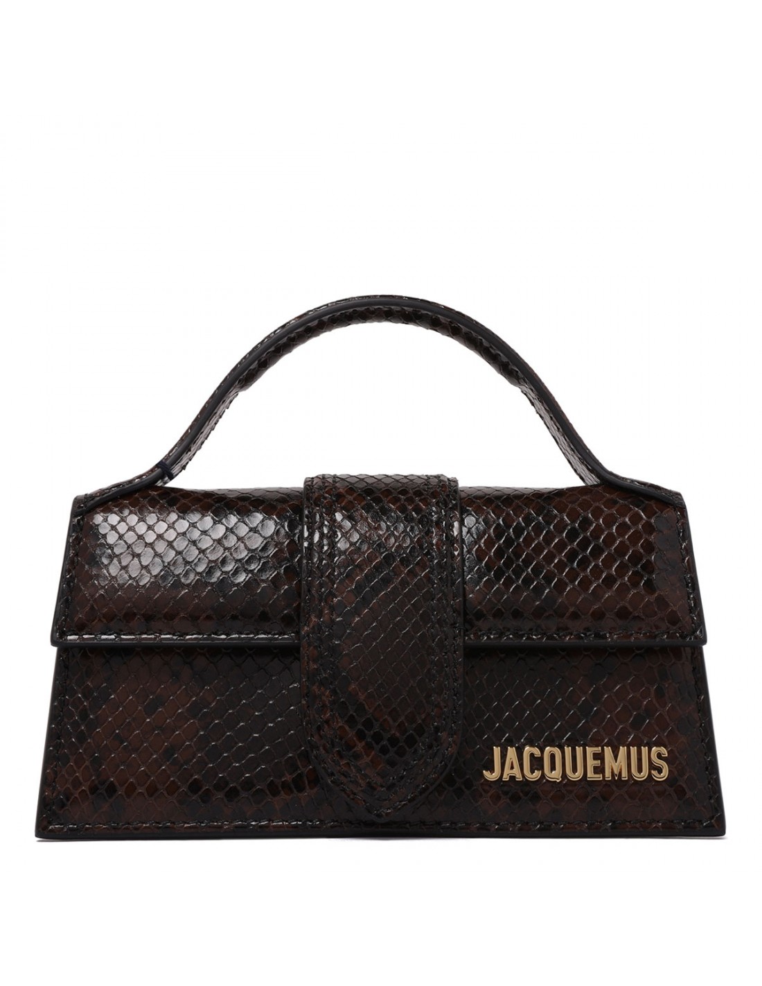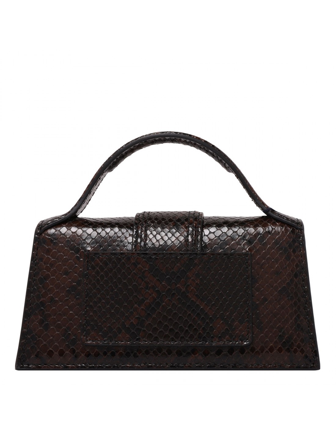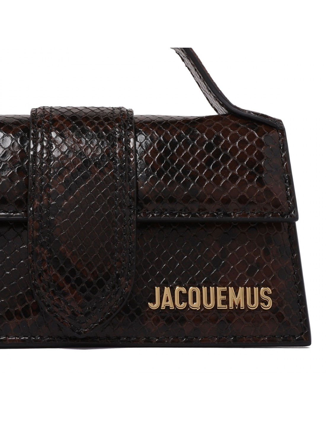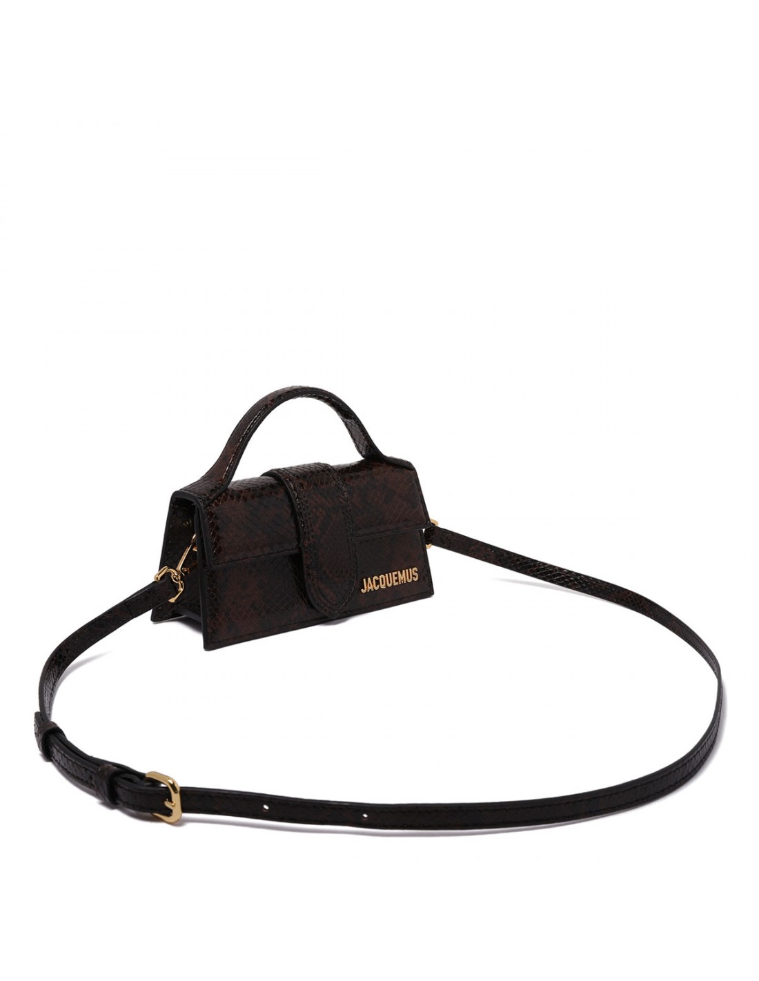 Dark brown python-embossed leather The Bambino bag from Jacquemus featuring structured silhouette, padded top handle, front flap with magnetic tab fastening, long detachable strap, engraved lobster clasp, back patch pocket, topstitching, gold metal logo and hardware.