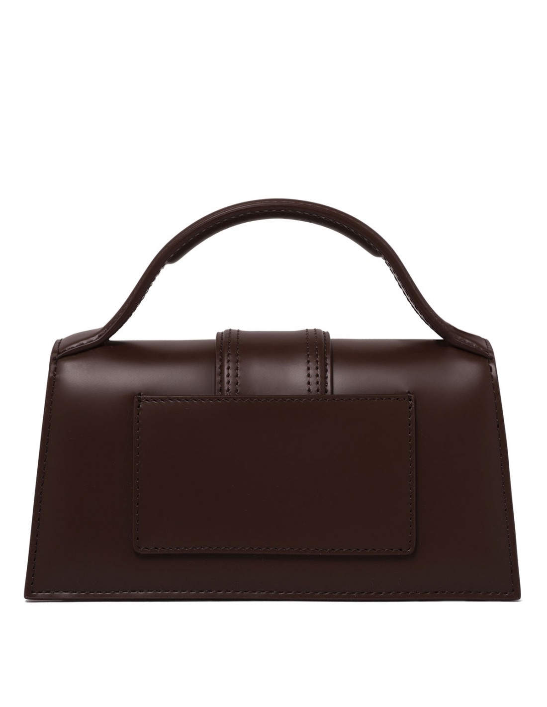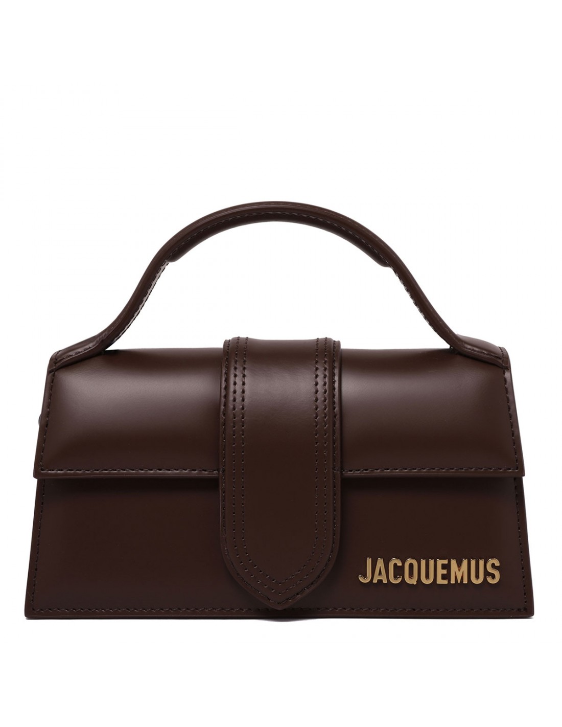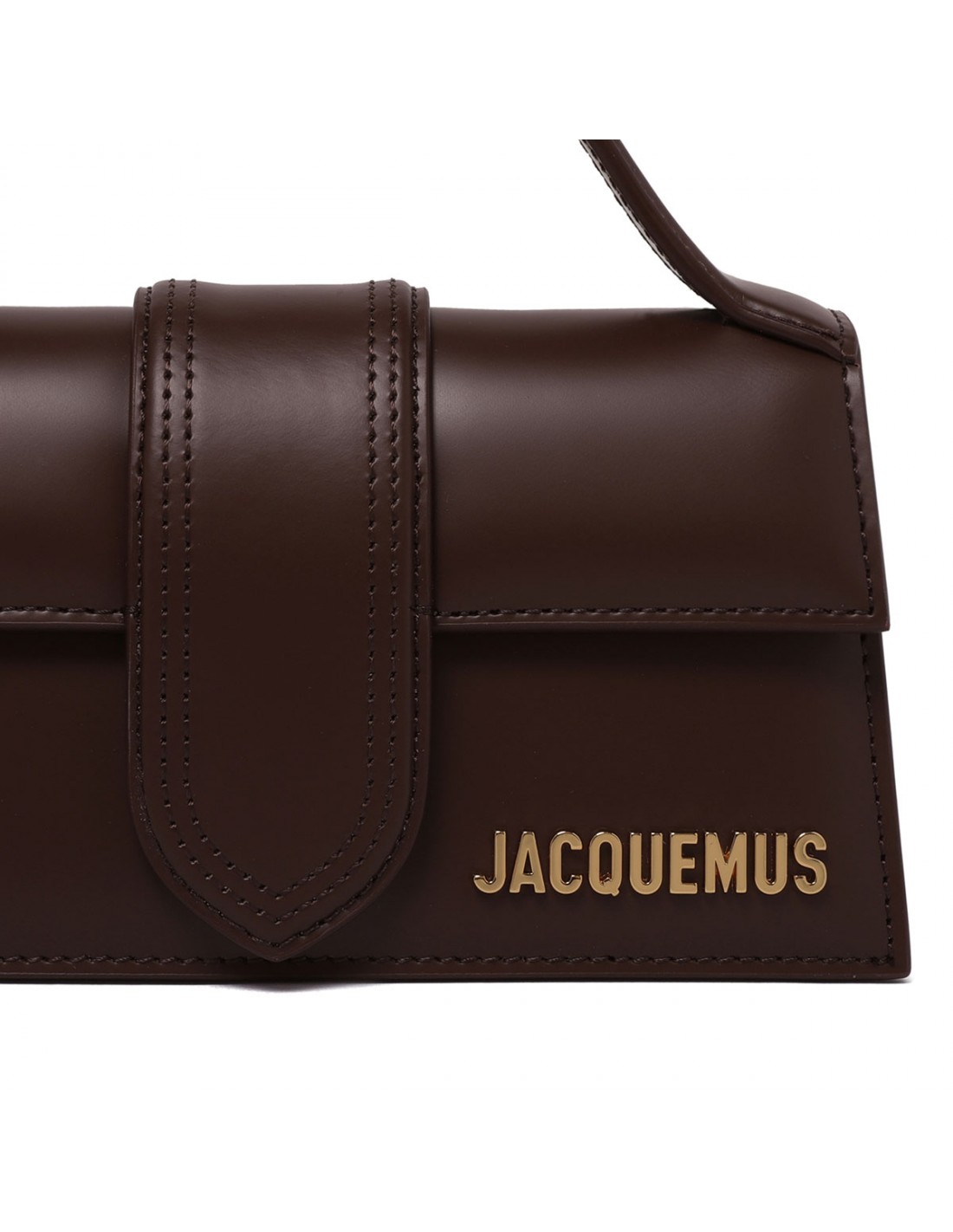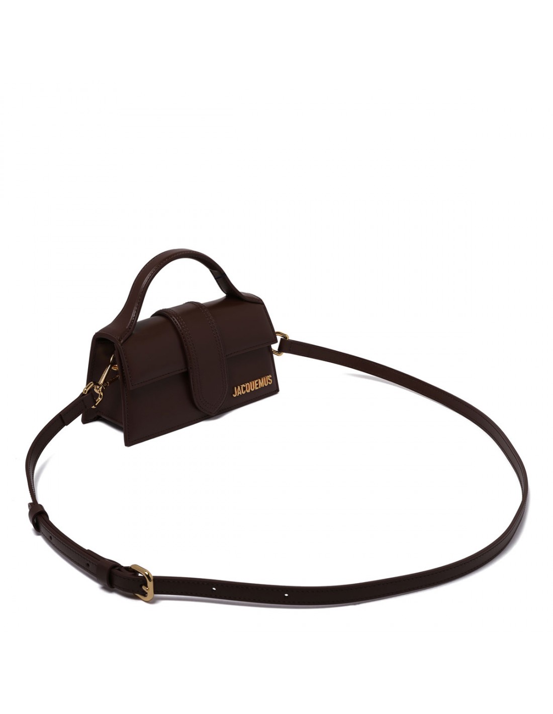 Brown leather The Bambino bag from Jacquemus featuring structured silhouette, padded top handle, front flap with magnetic tab fastening, long detachable strap, engraved lobster clasp, back patch pocket, topstitching, gold metal logo and hardware.