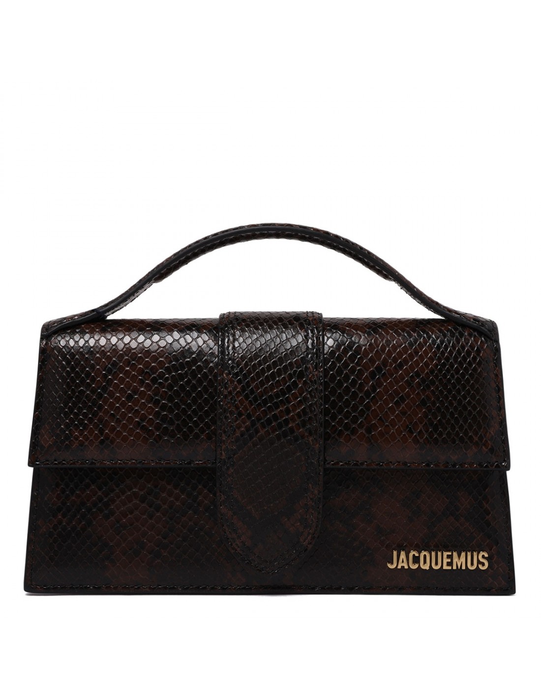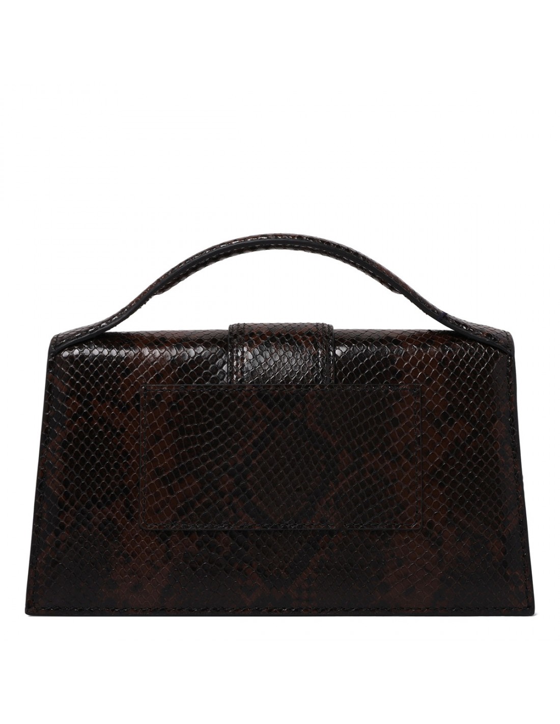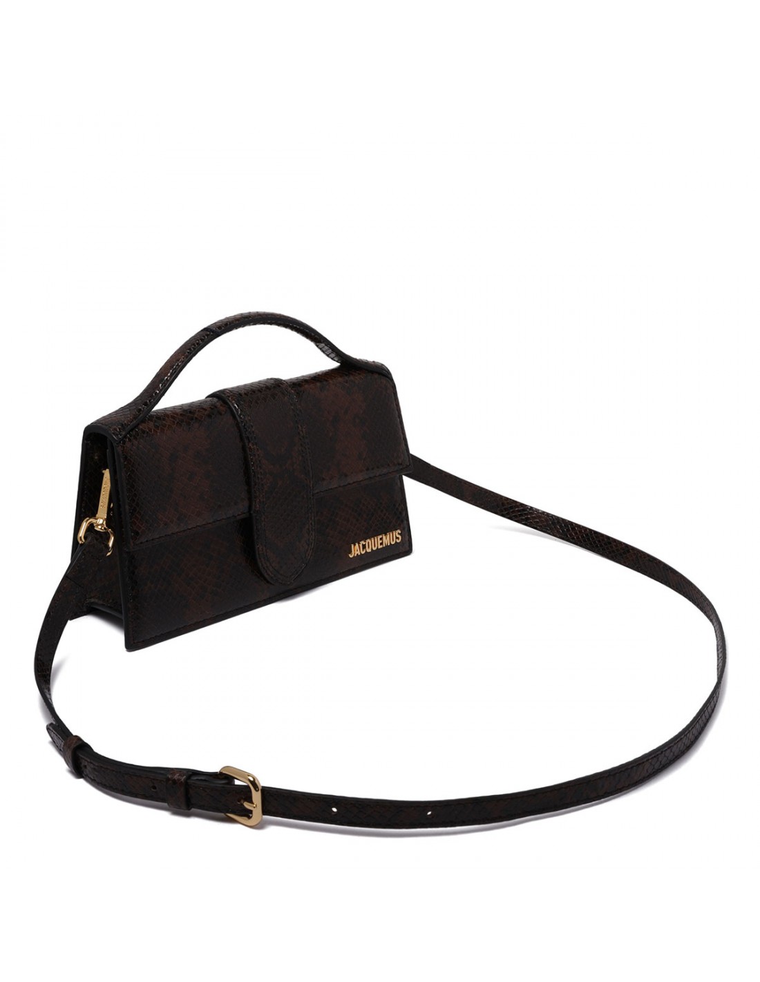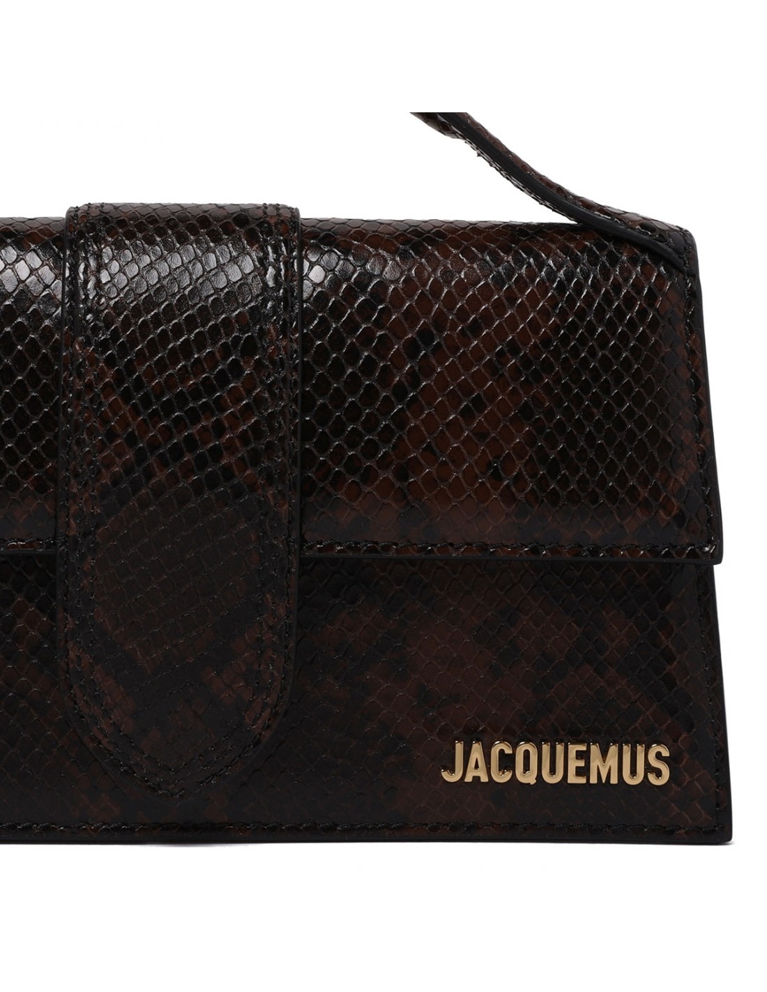 Dark brown python-embossed leather The Bambino large bag from Jacquemus featuring structured silhouette, padded top handle, front flap with magnetic tab fastening, long detachable strap, engraved lobster clasp, back patch pocket, topstitching, gold metal logo and hardware.
