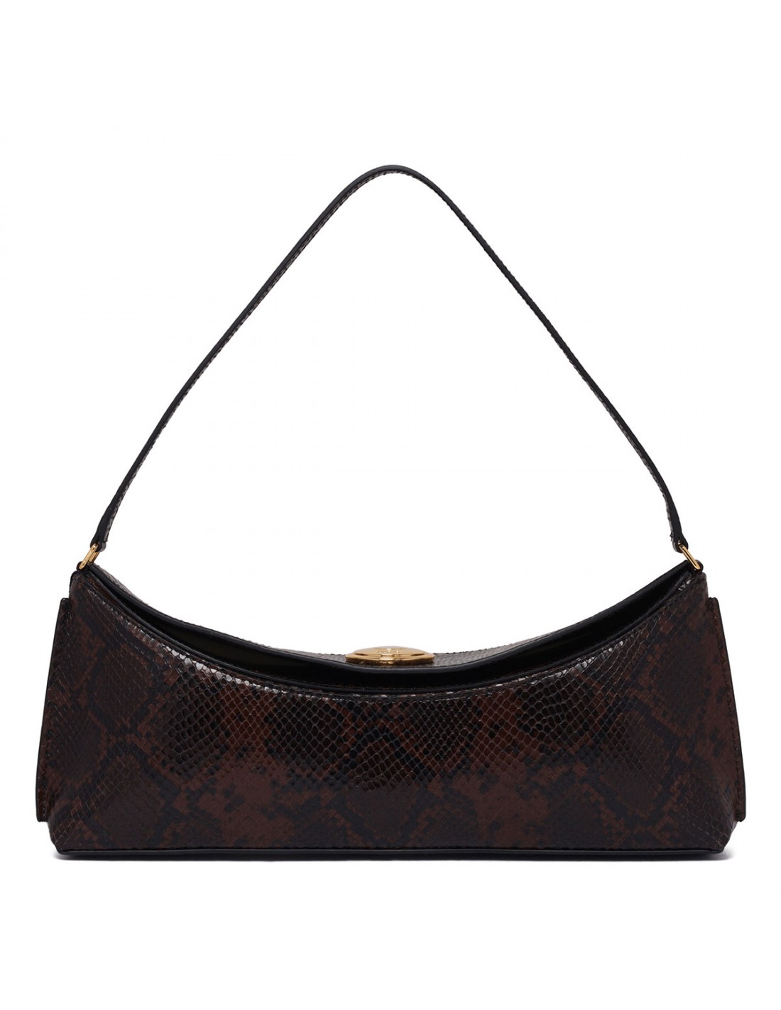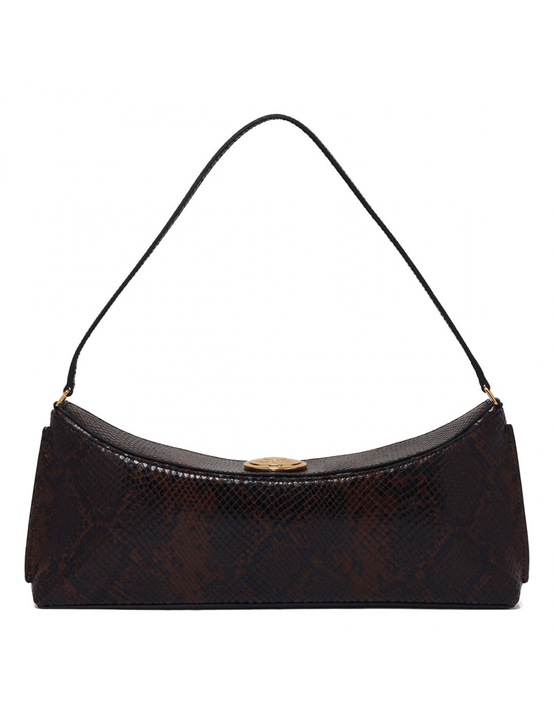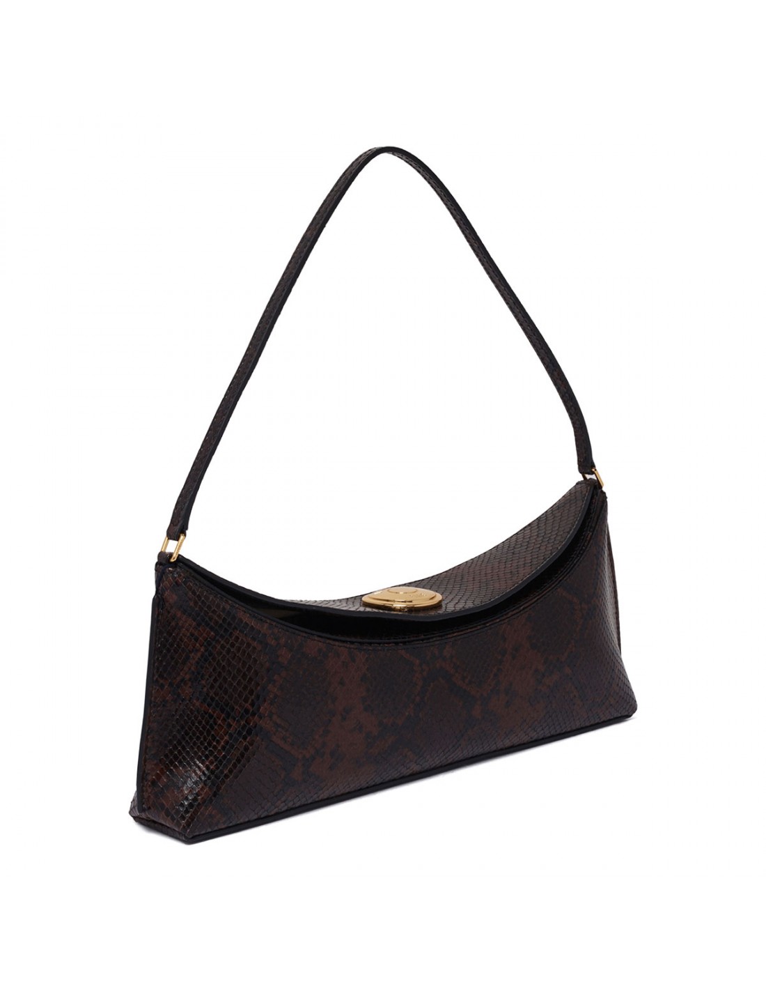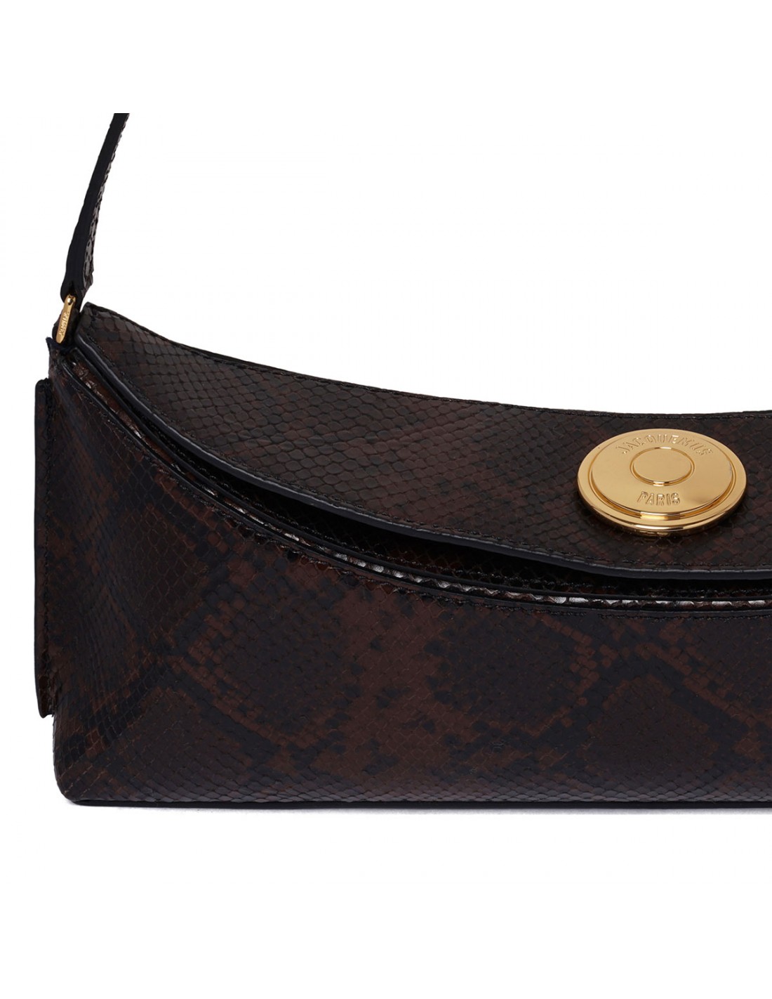 Dark brown python-embossed leather The Ovalo folded shoulder bag from Jacquemus featuring slim shoulder strap, flap with large engraved snap closure, cotton lining, internal card pocket.