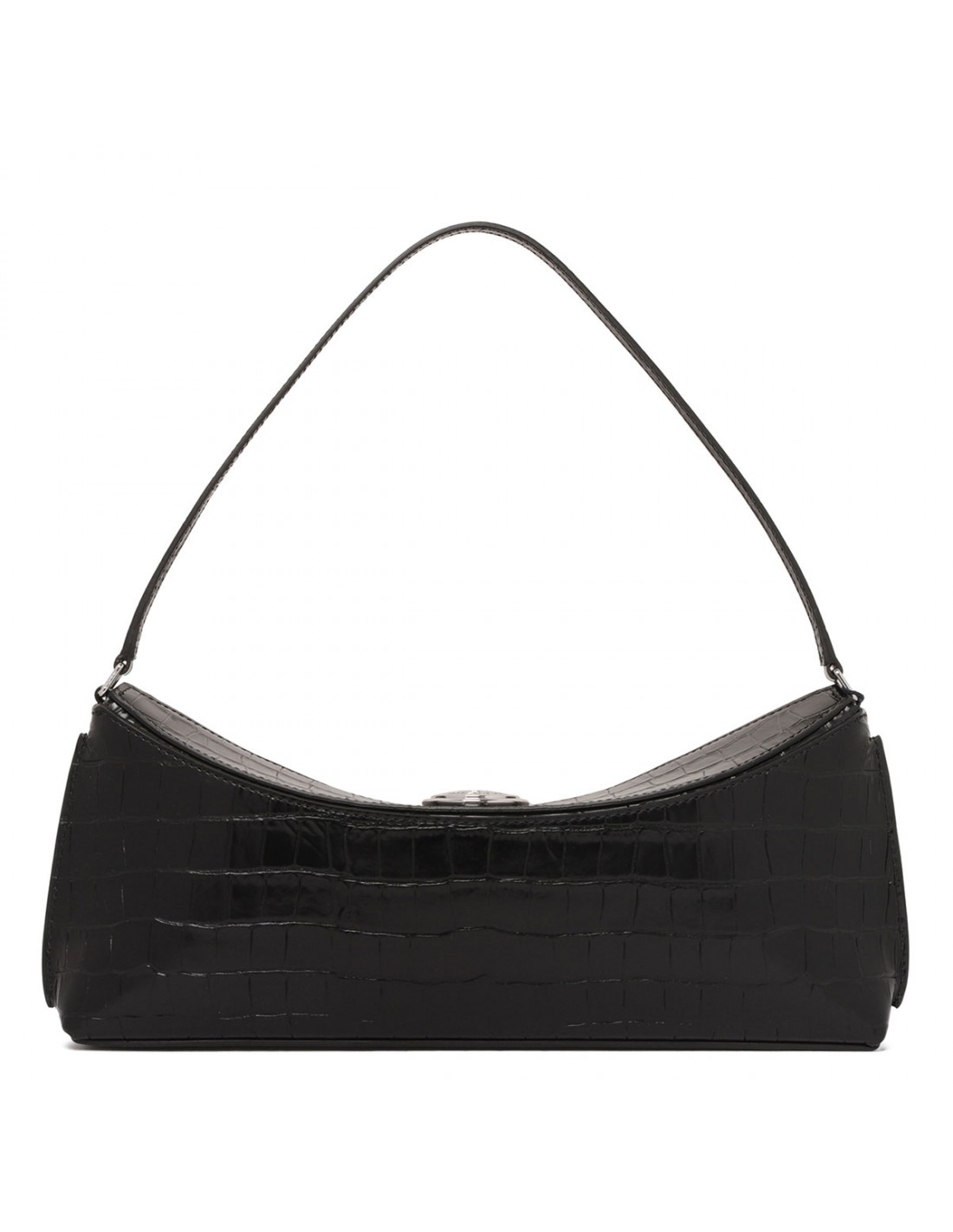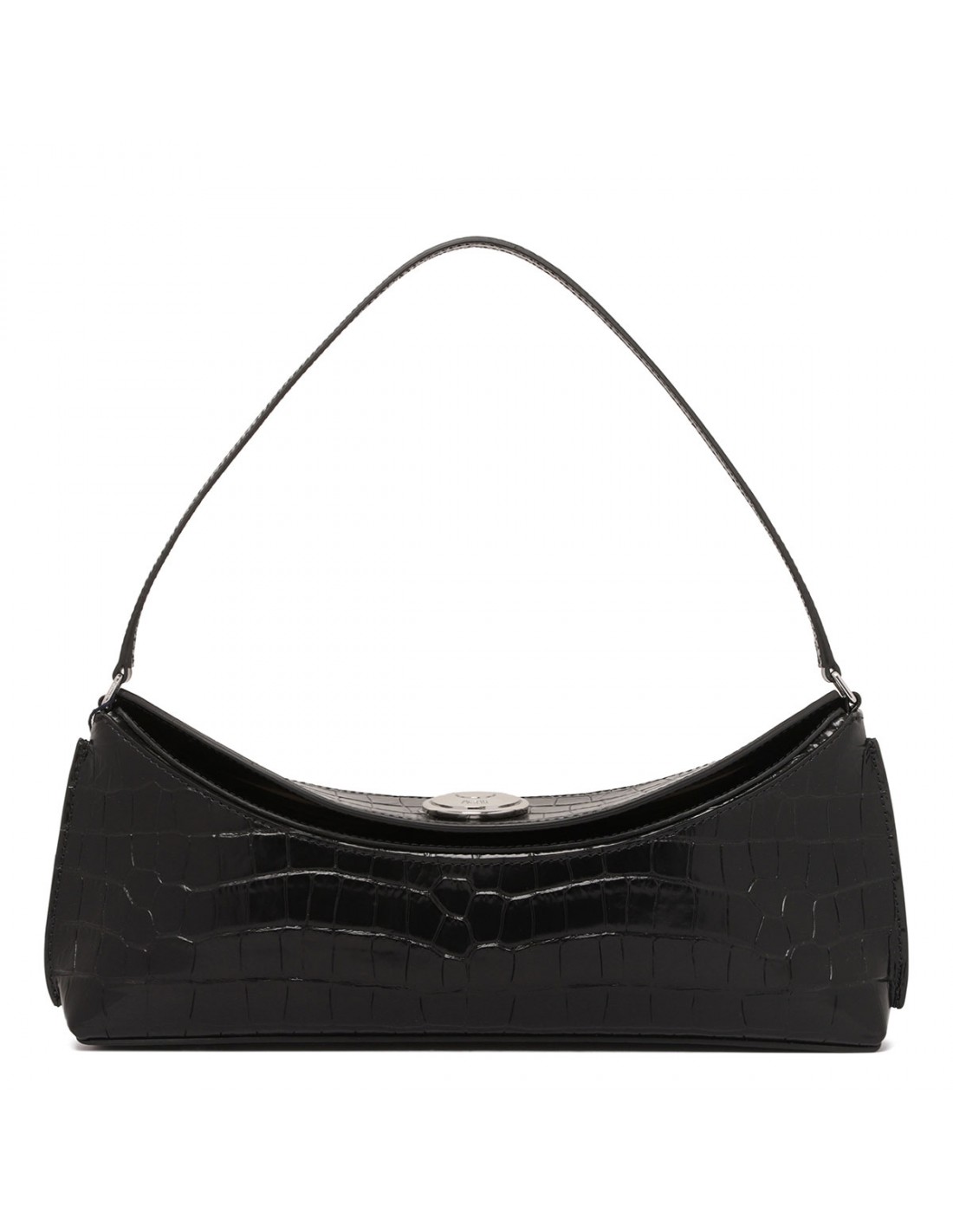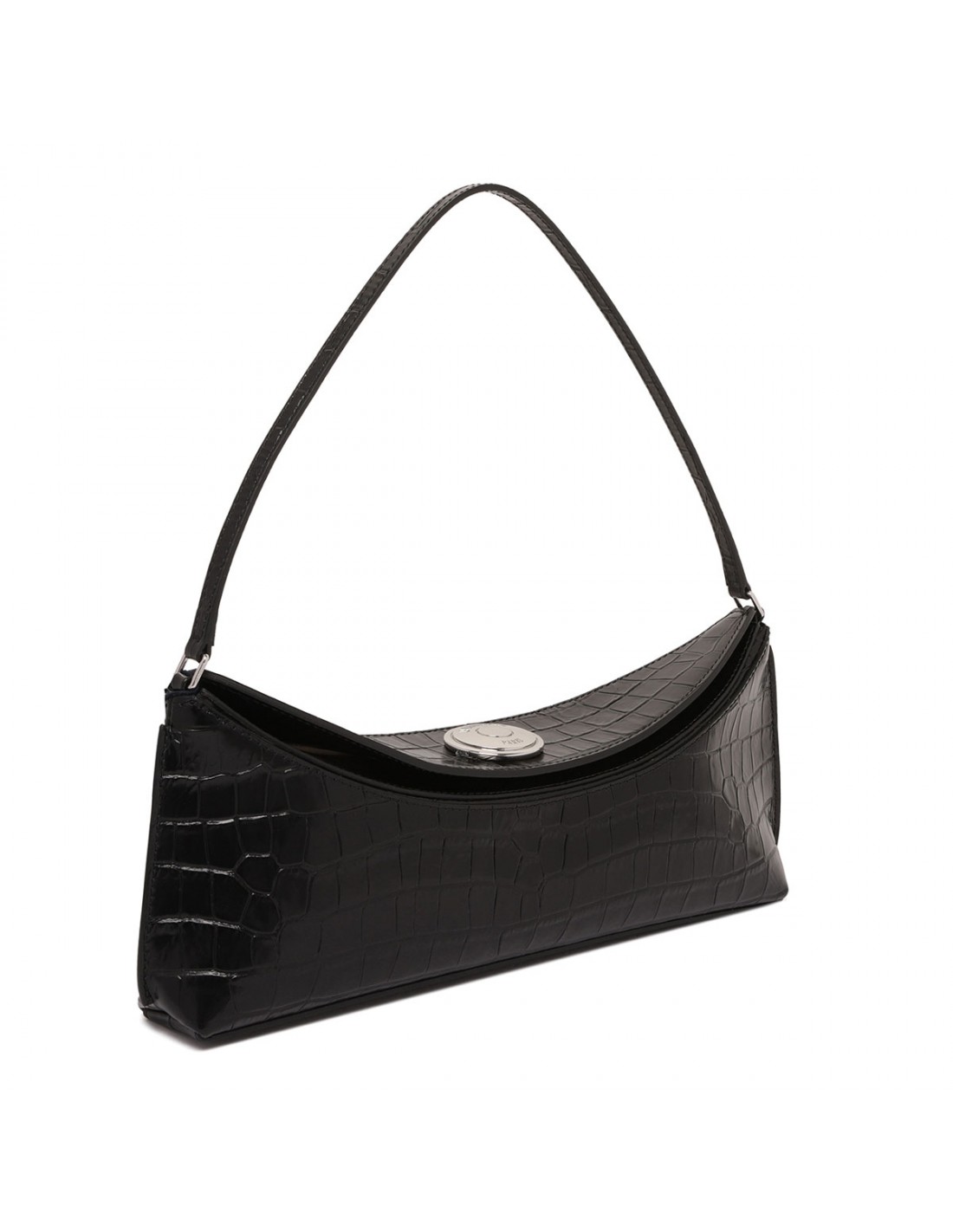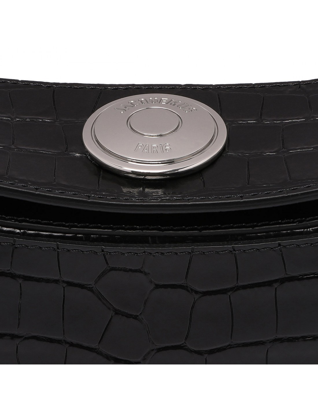 Black croc-embossed leather The Ovalo folded shoulder bag from Jacquemus featuring slim shoulder strap, flap with large engraved snap closure, cotton lining, internal card pocket.