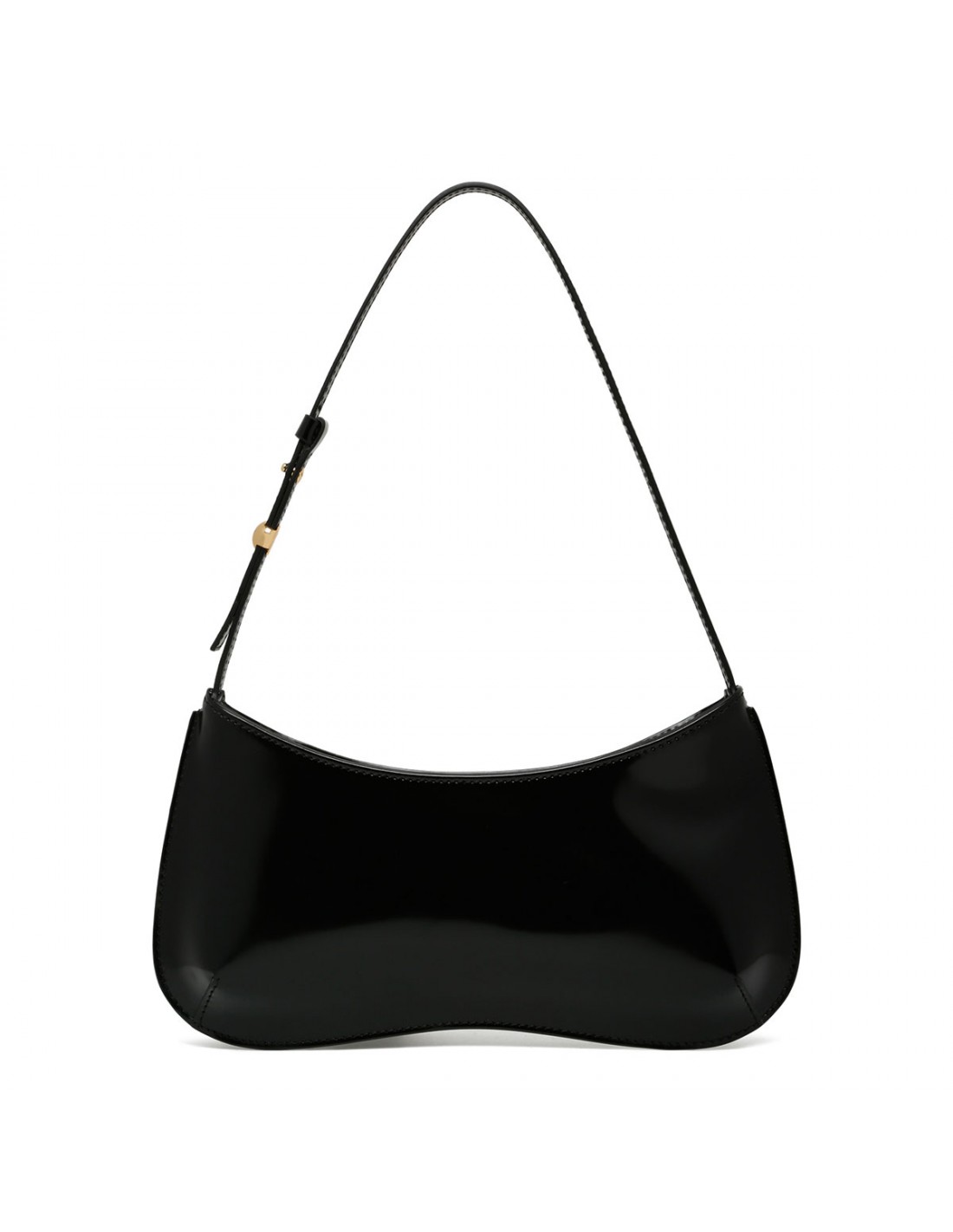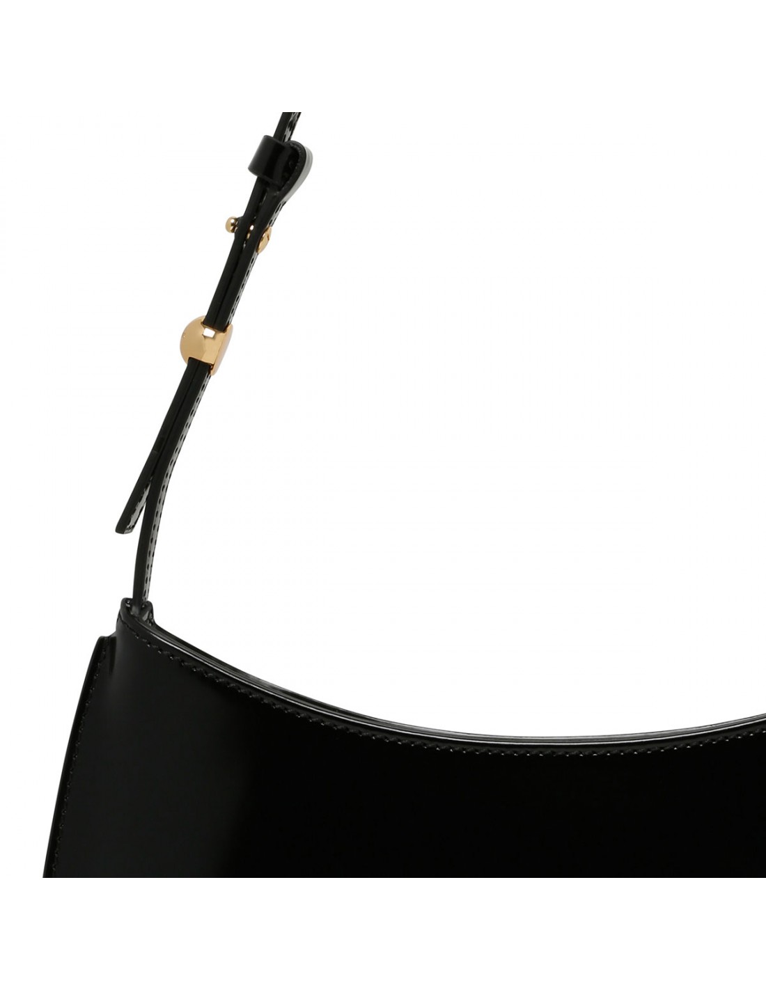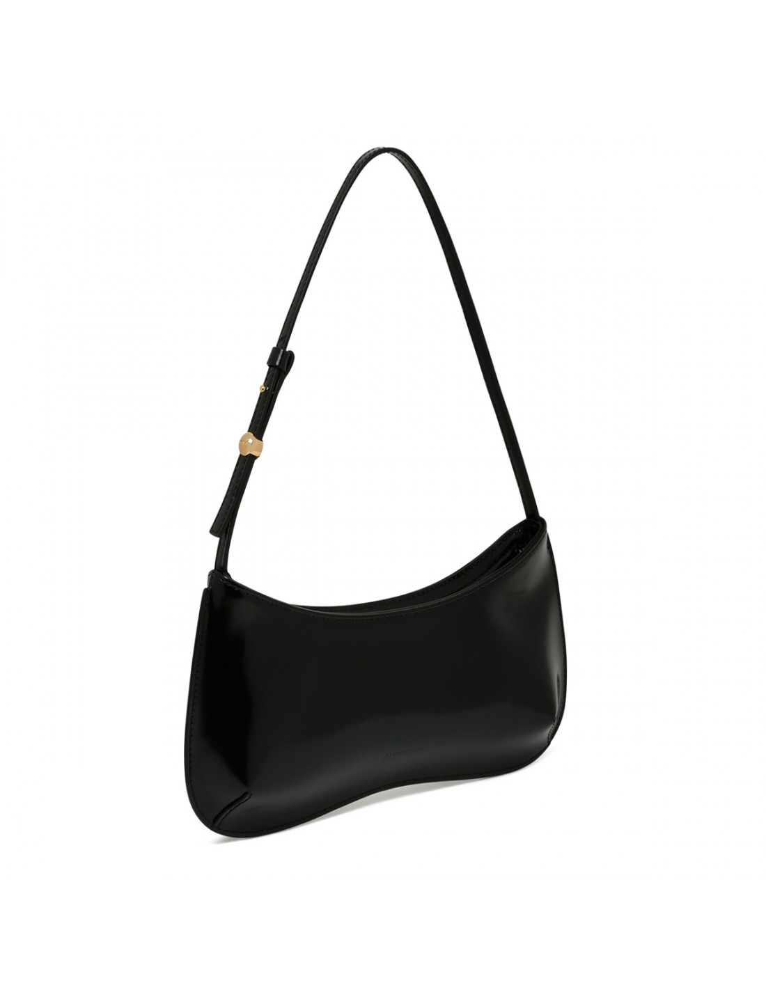 Black glazed calf-leather The Bisou shoulder bag from Jacquemus featuring adjustable buckled leather strap with engraved metal bead, zip fastening along top, edge-to-edge construction, logo embossed, gold metal hardware, internal patch pocket.