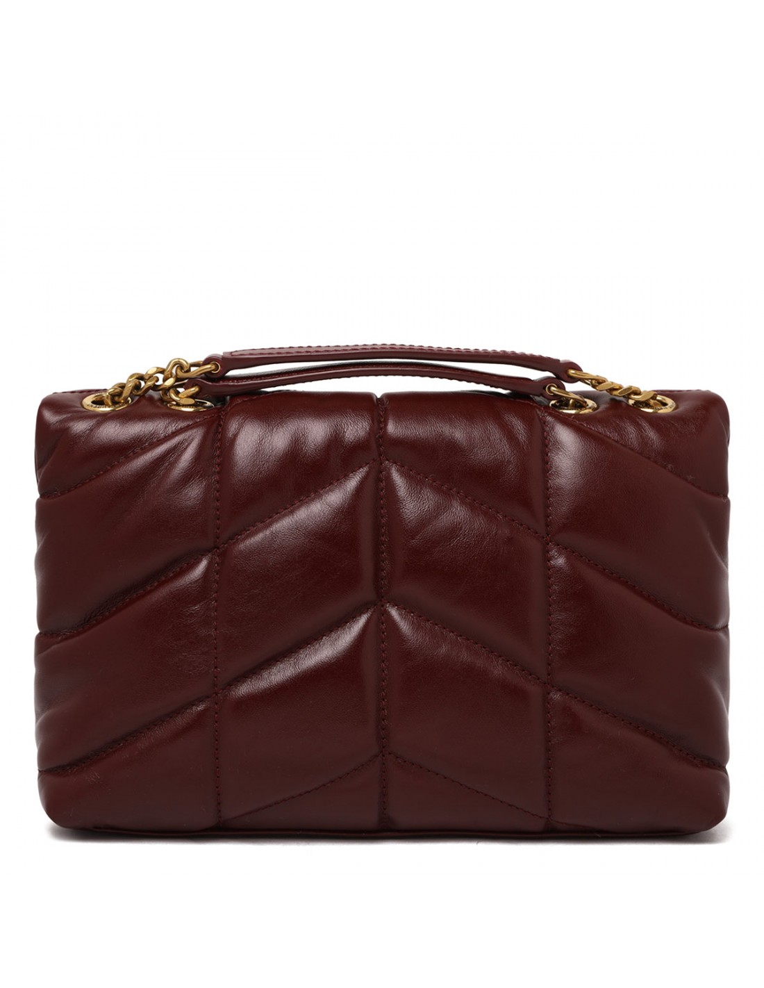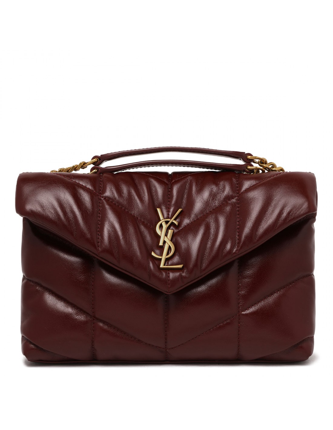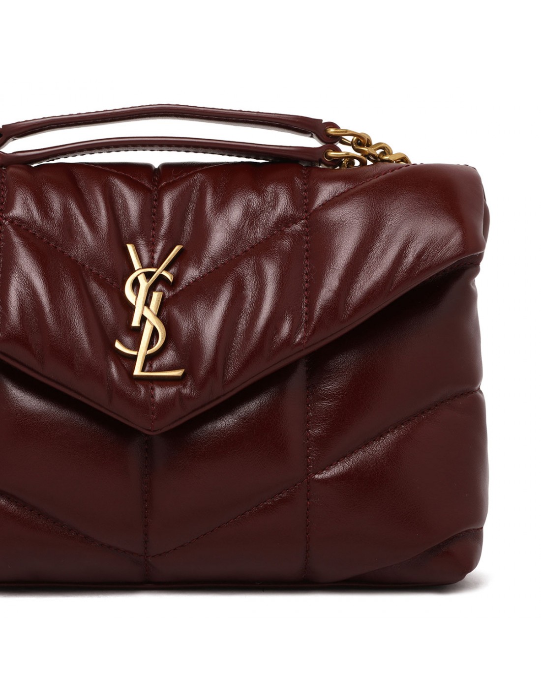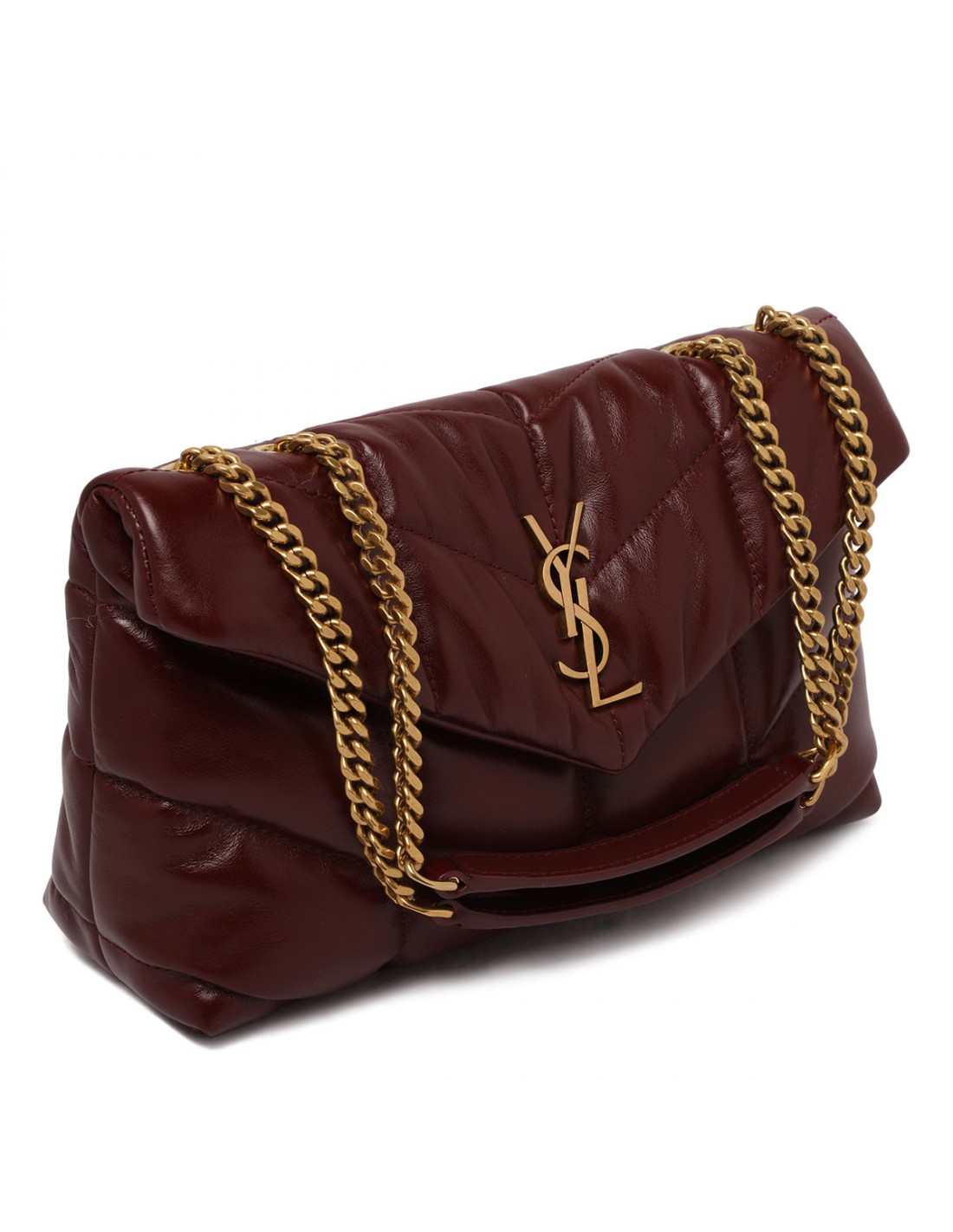 Dark ruby hue shiny chevron leather Loulou toy puffer bag from Saint Laurent featuring bronze-tone YSL logo and hardware, sliding chain shoulder strap, magnetic snap fastening, grosgrain lining, one zip pocket, two card slots.