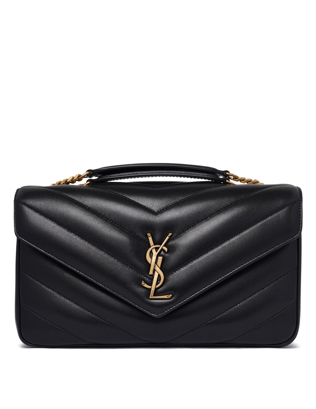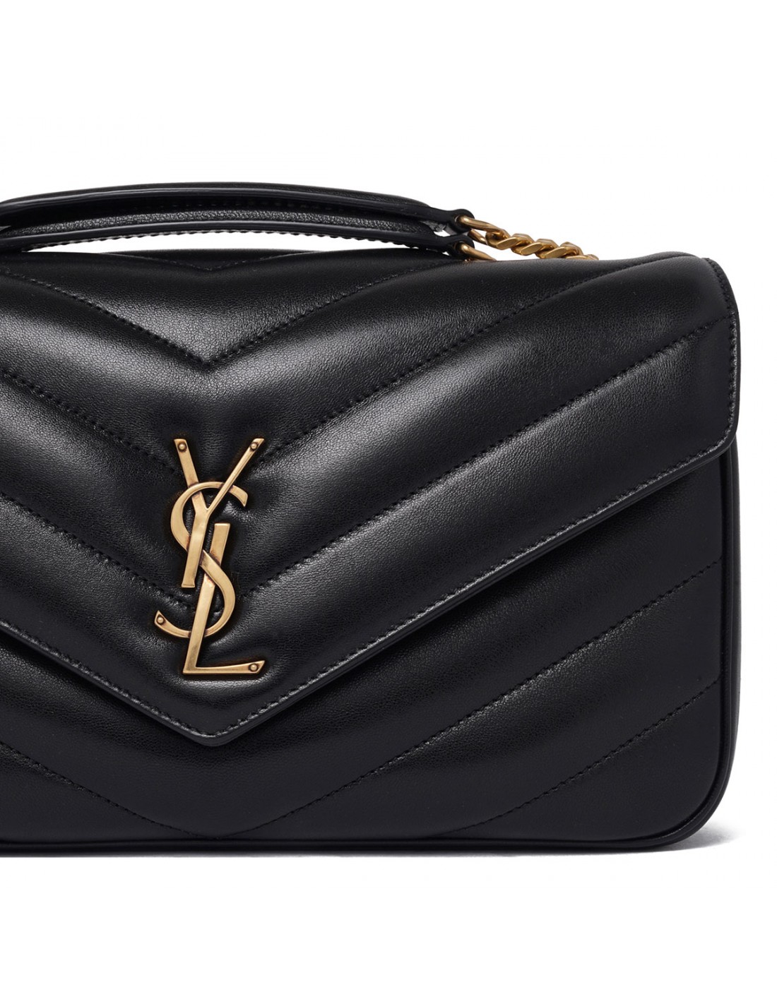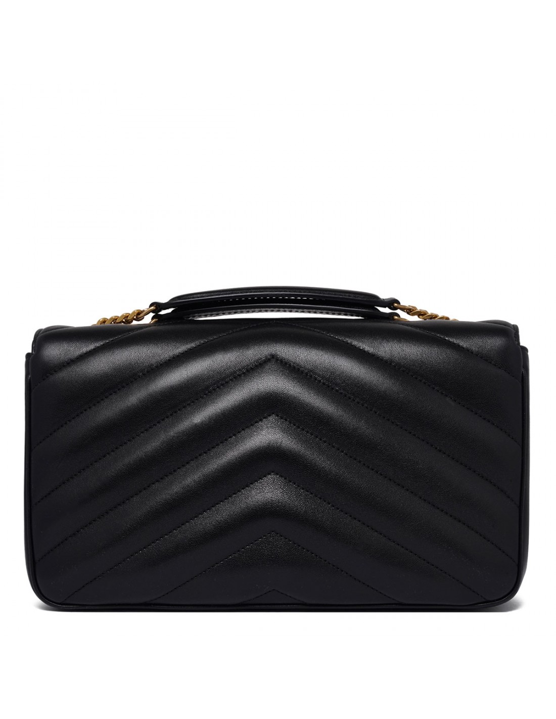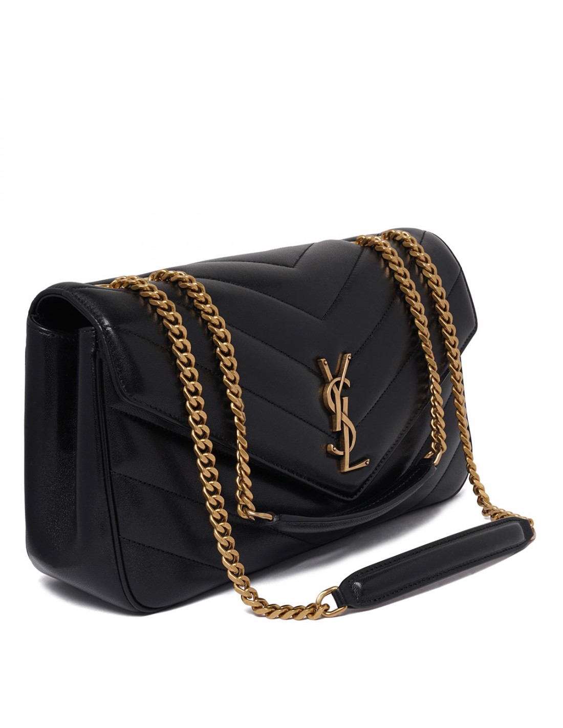 Black matelassé Y leather Loulou medium shoulder bag from Saint Laurent featuring golden metal interlocking YSL logo, sliding chain shoulder strap with leather detail, front flap with magnetic fastening, cotton lining, one flat pocket.