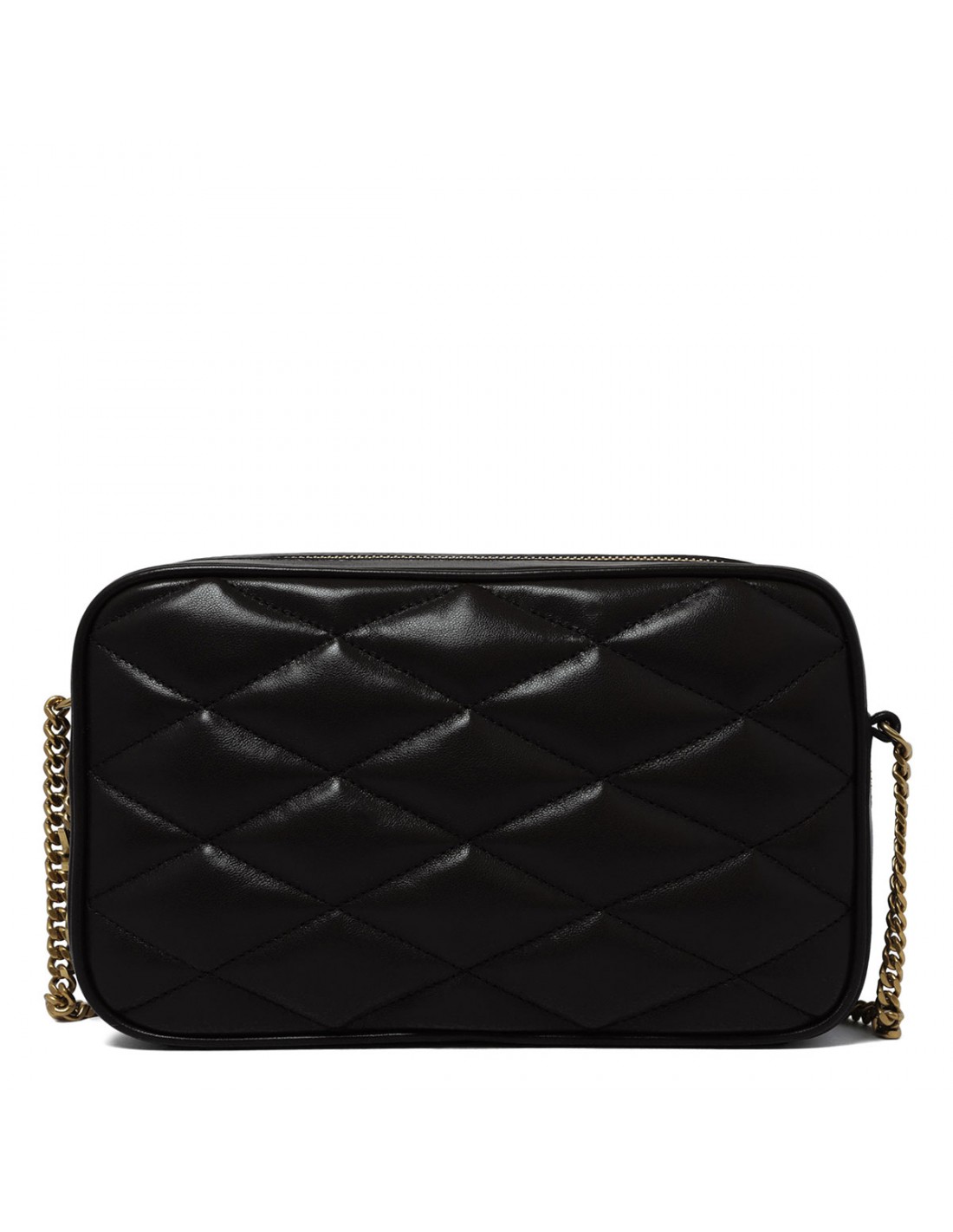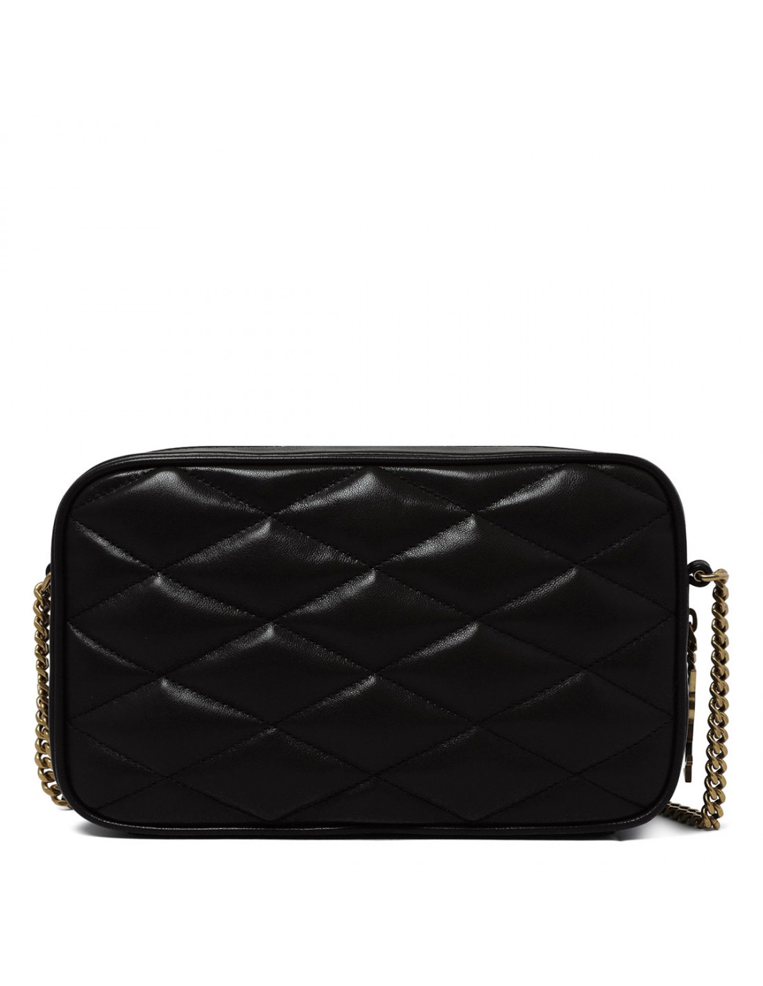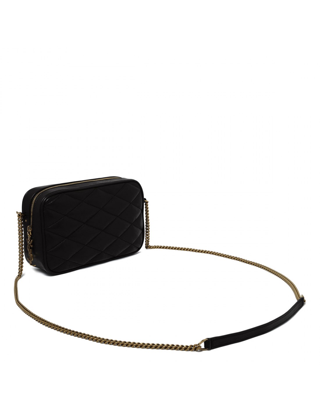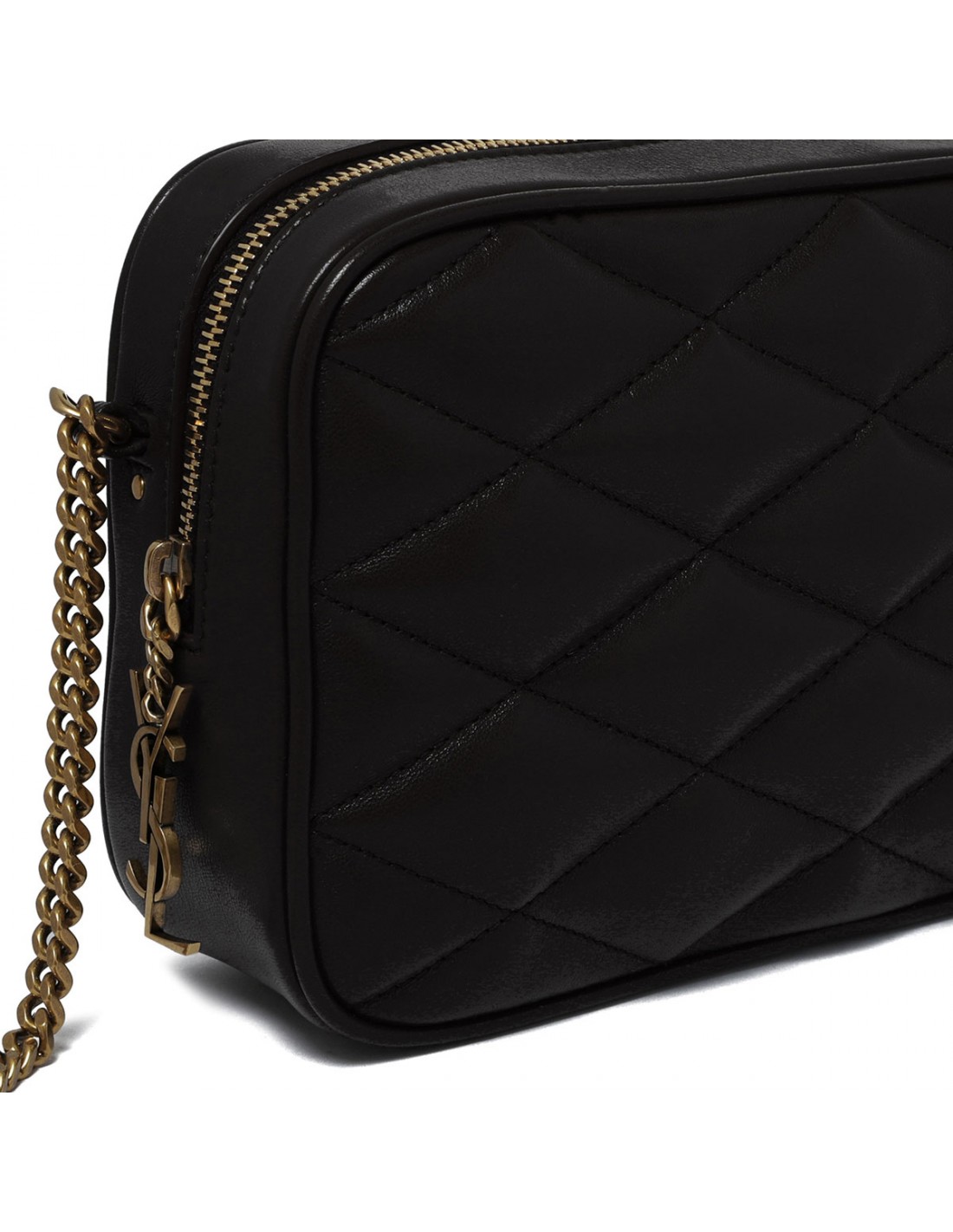 Black matelassé leather camera bag from Saint Laurent featuring quilted topstitching, chain shoulder strap with leather shoulder pad, zip fastening with Cassandre zipper pull, zip fastening along top.