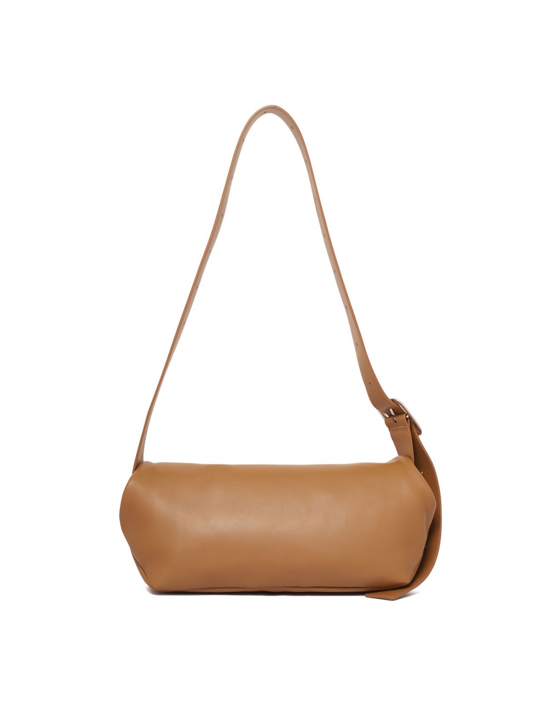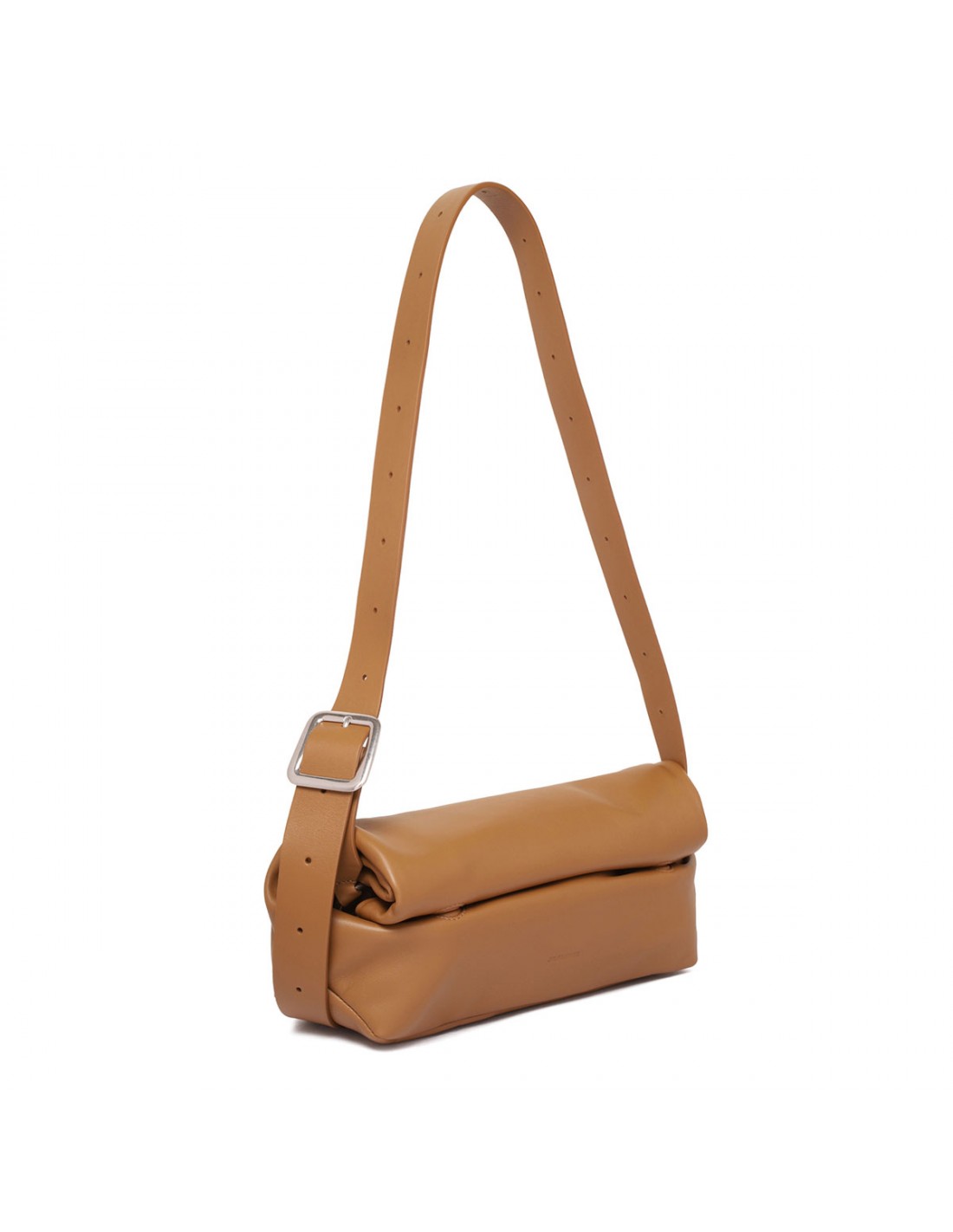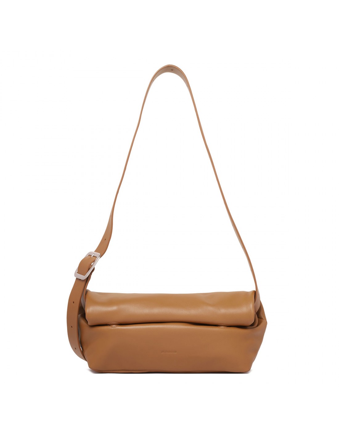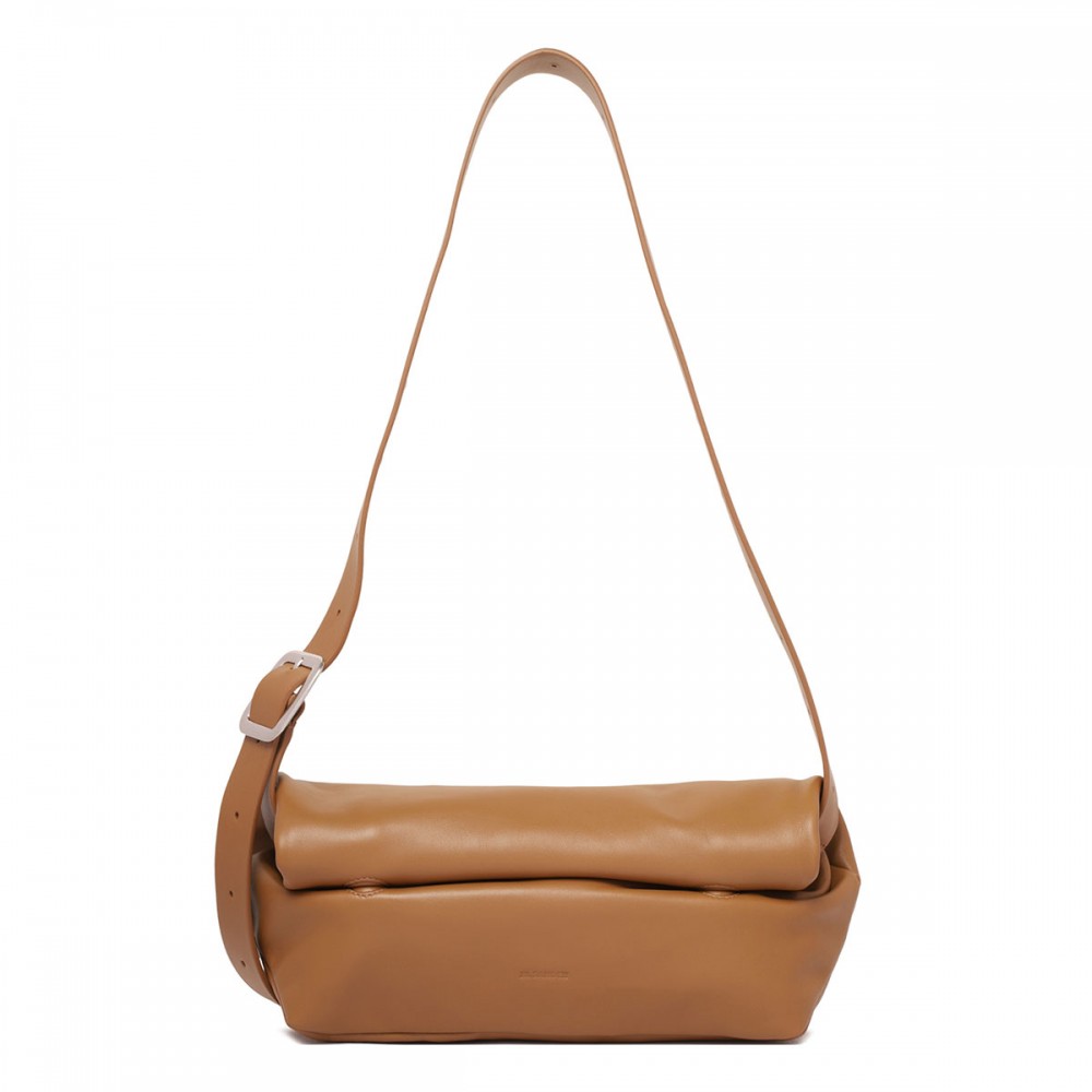 Hazel hue leather Rollup medium shoulder bag from Jil Sander featuring roll-up flap with magnetic closure, adjustable leather shoulder strap, embossed Jil Sander logo, soft shap, nappa lining, internal zipped pocket.