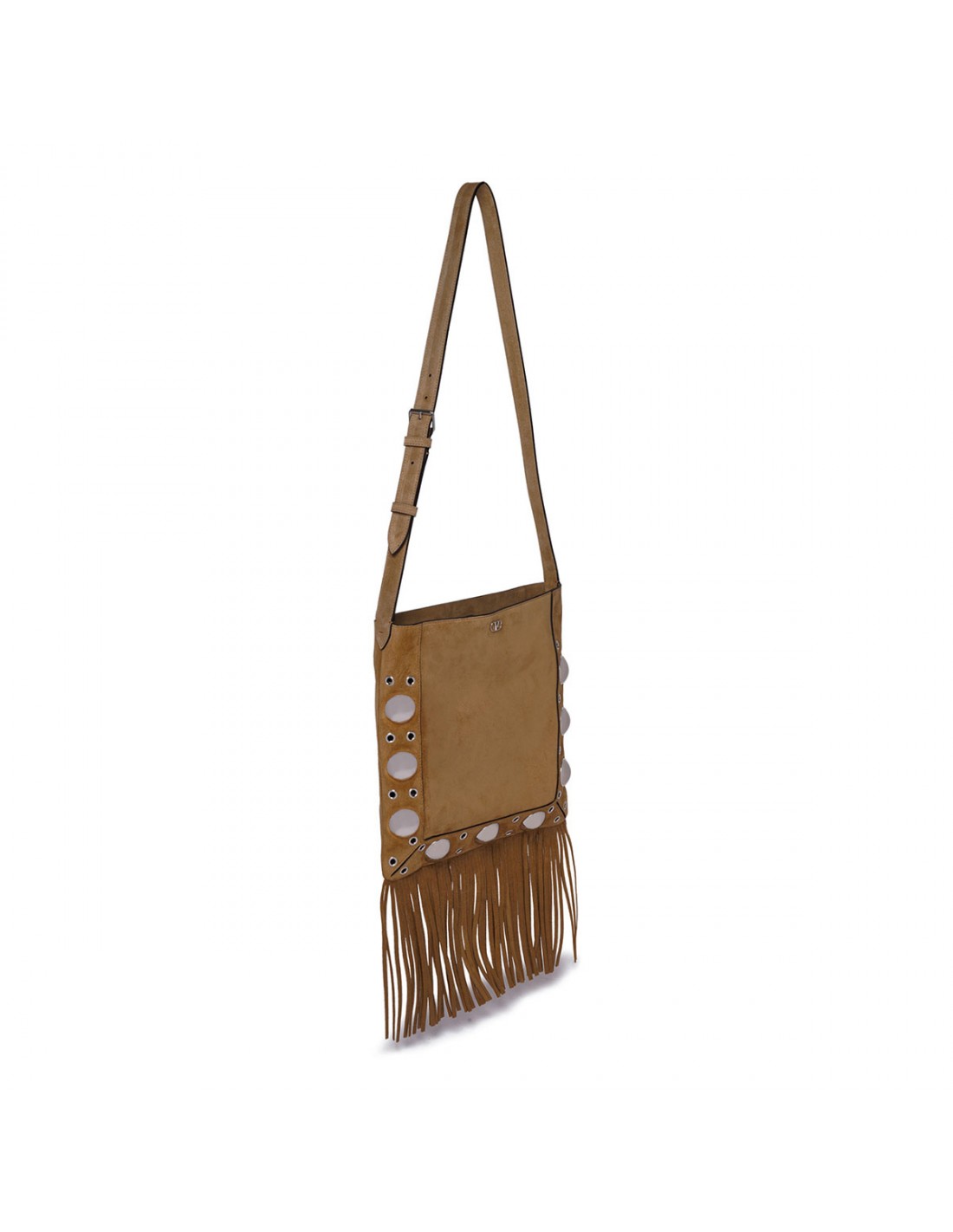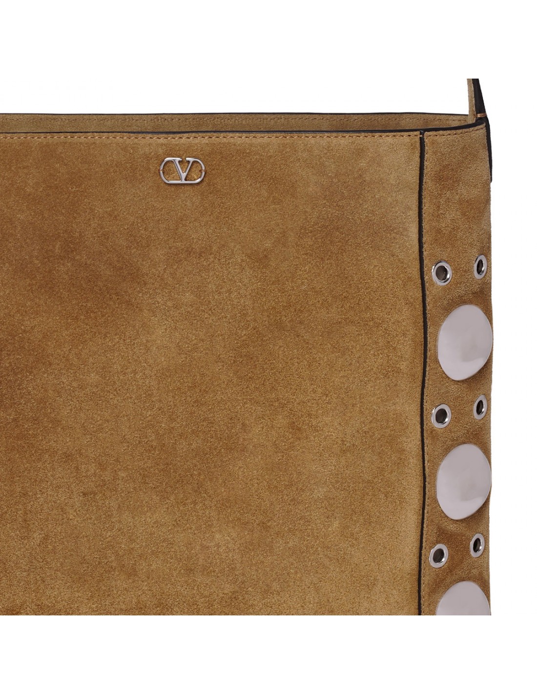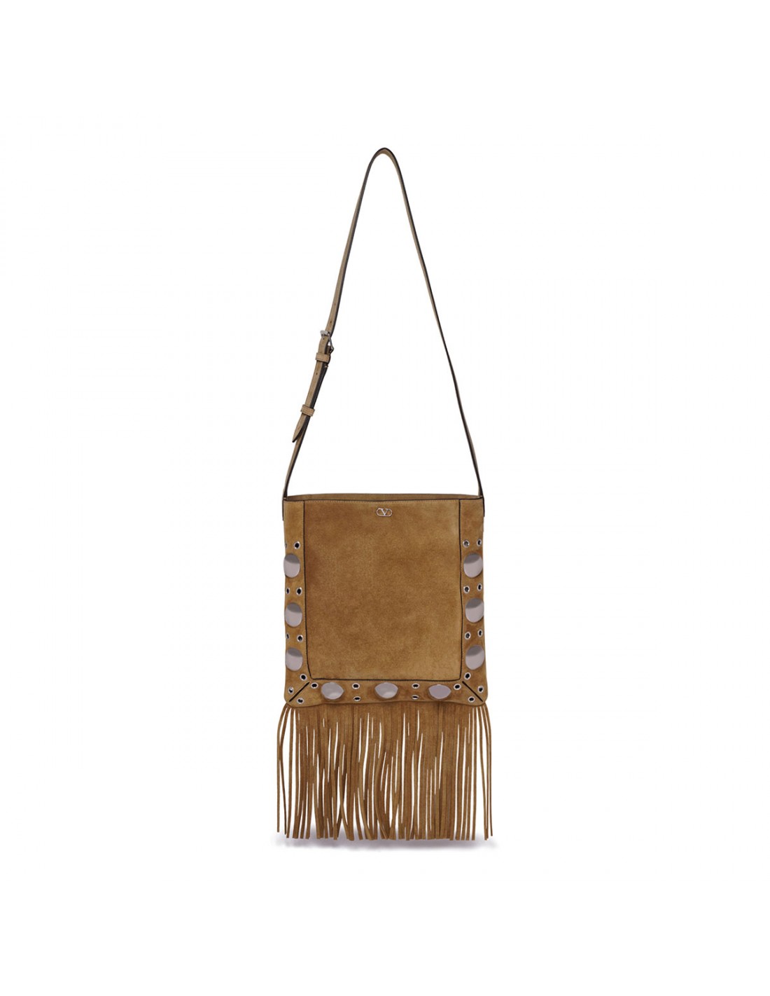 Havana beige suede leather Nellcôte shoulder bag from Valentino Garavani featuring ball studs and rivets decoration, fringed trims, adjustable suede shoulder strap, metallic detail with VLogo Signature, palladium-finish hardware.