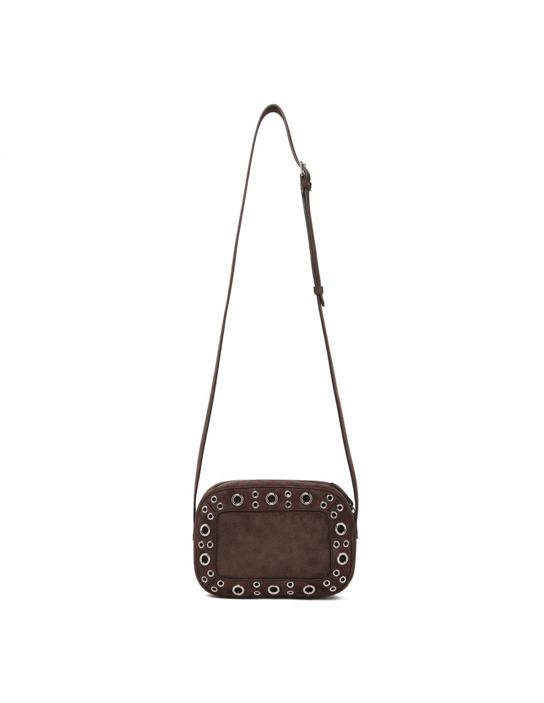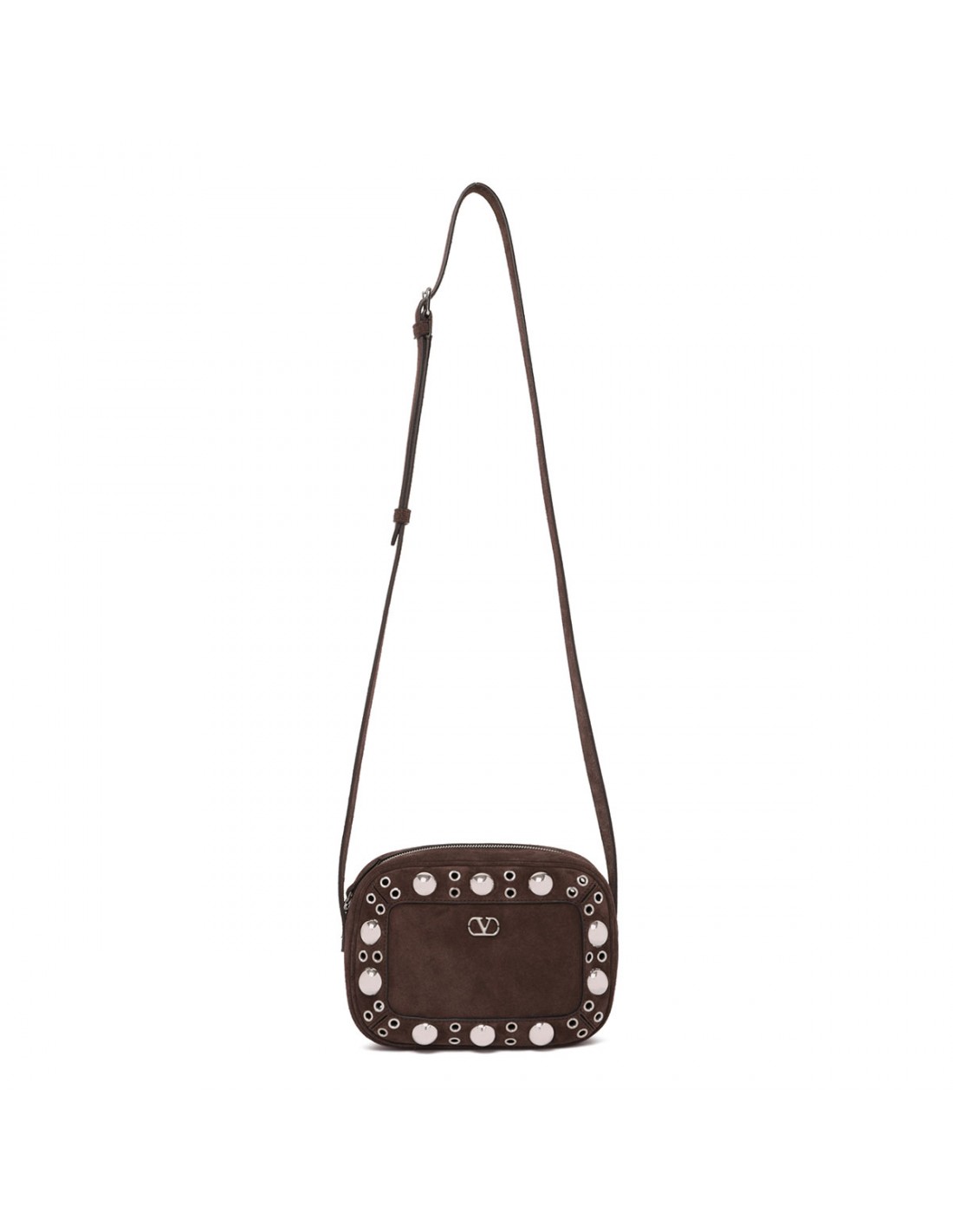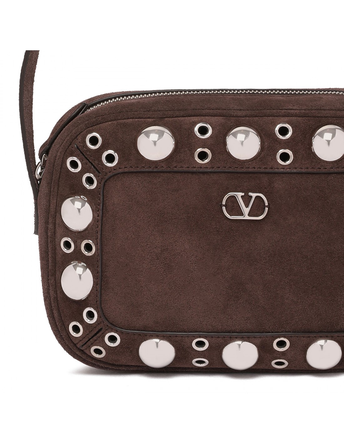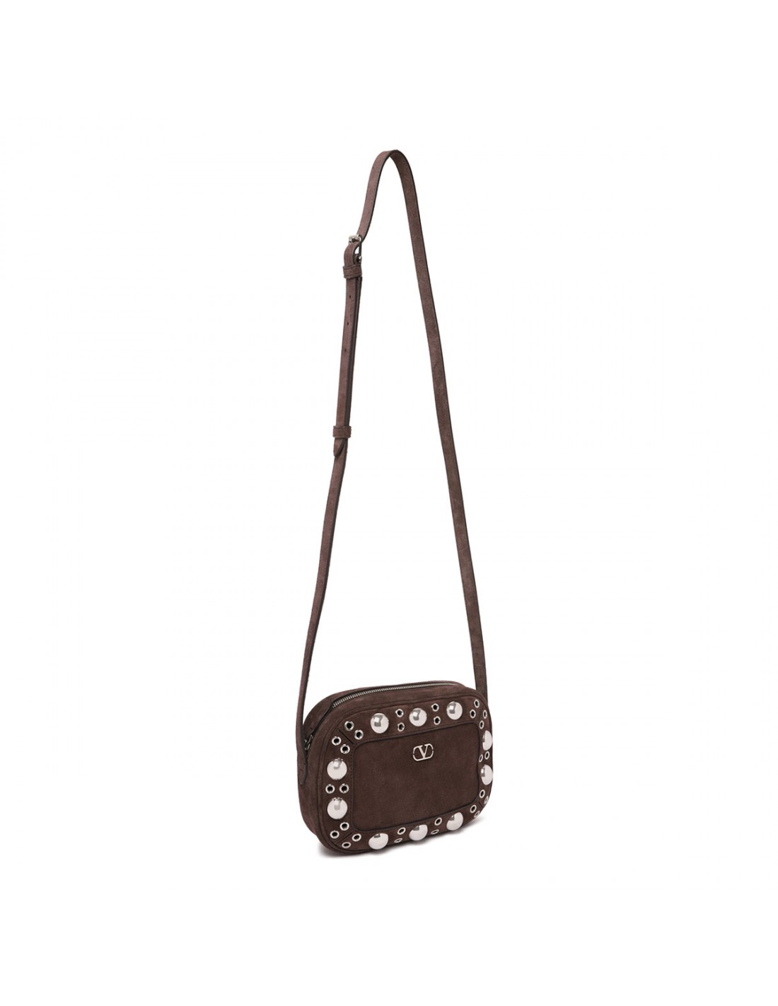 Dark brown suede Nellcôte shoulder bag from Valentino Garavani featuring ball studs and rivets, adjustable leather shoulder strap, zip fastening along top, palladium-finish hardware, small metallic detail with VLogo Signature, suede lining, internal card pocket.