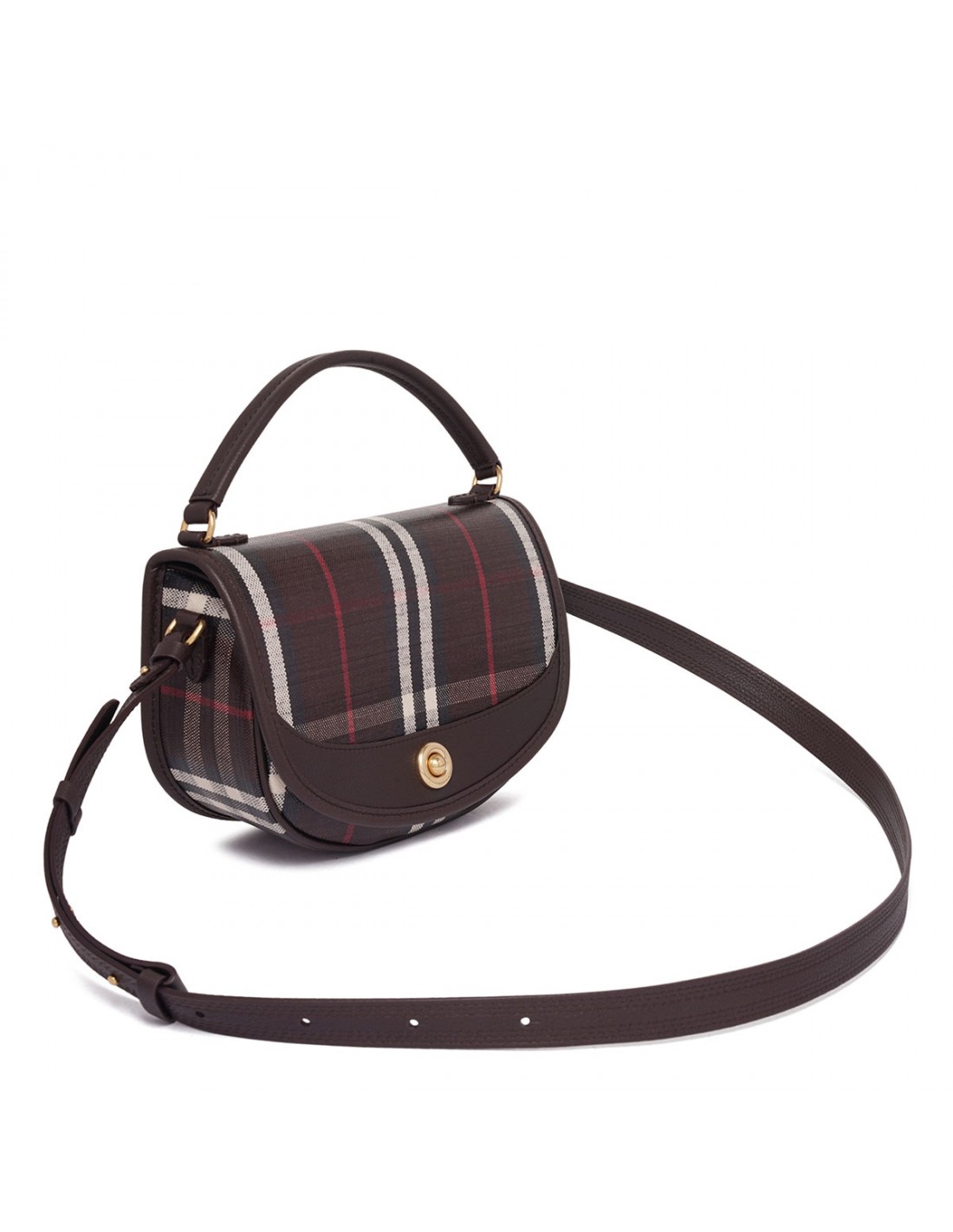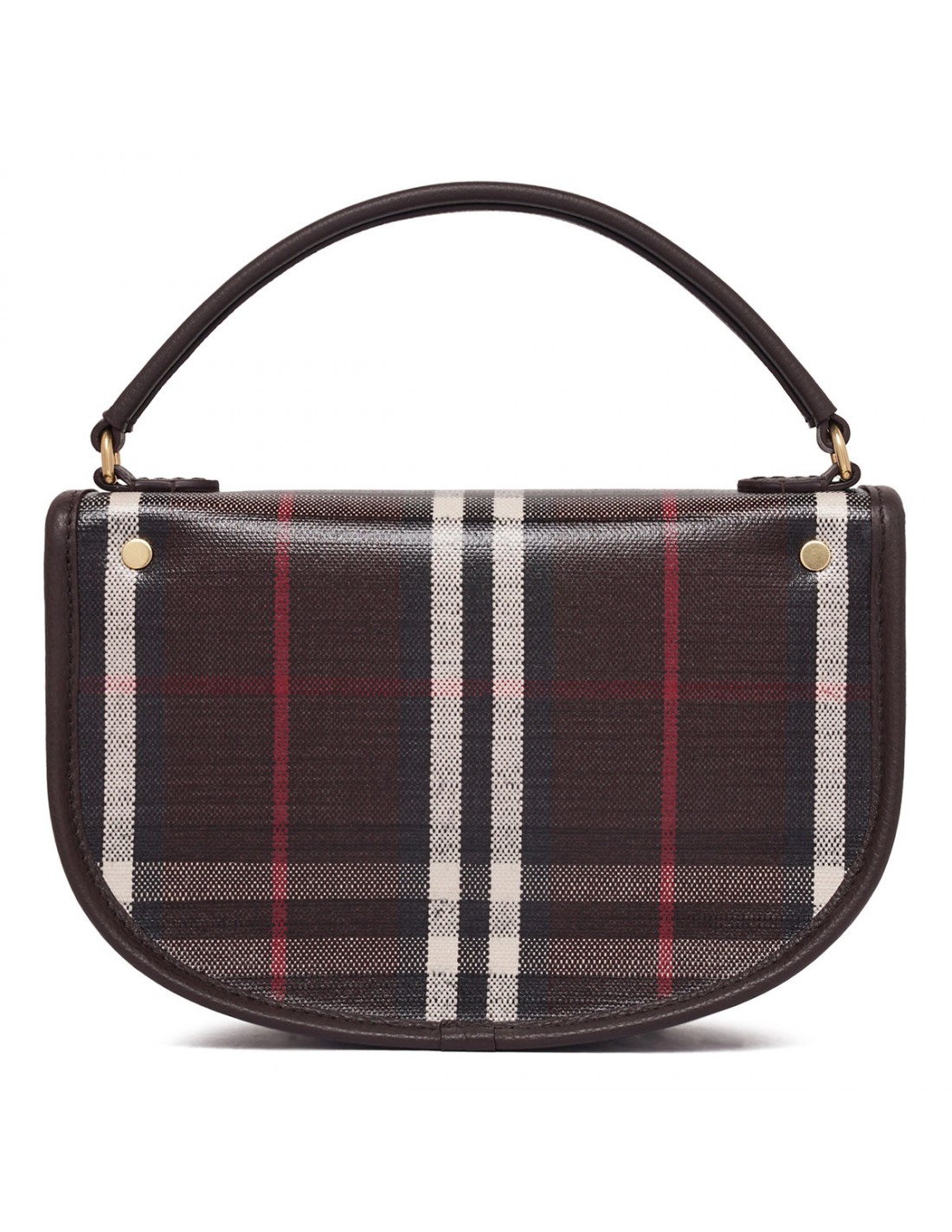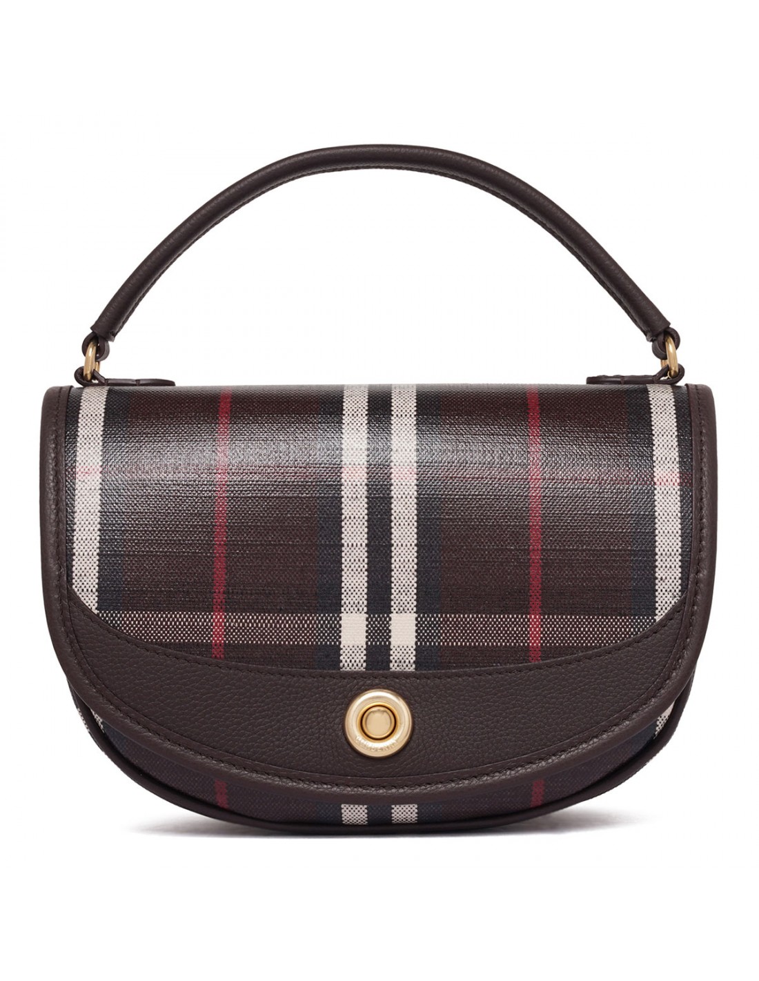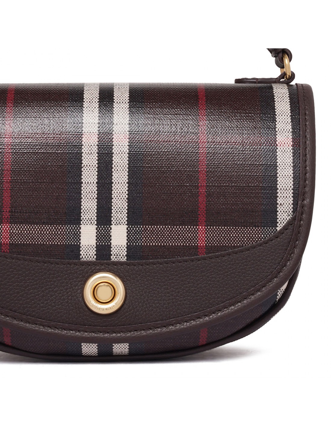Mahogany coated cotton linen blend Highlands crossbody bag from Burberry featuring grainy calf leather trims, Burberry Check motif, detachable and adjustable leather strap, leather top handle, magnetic push-button closure with logo engraved, hand-painted edges, cotton lining and internal slip pocket.