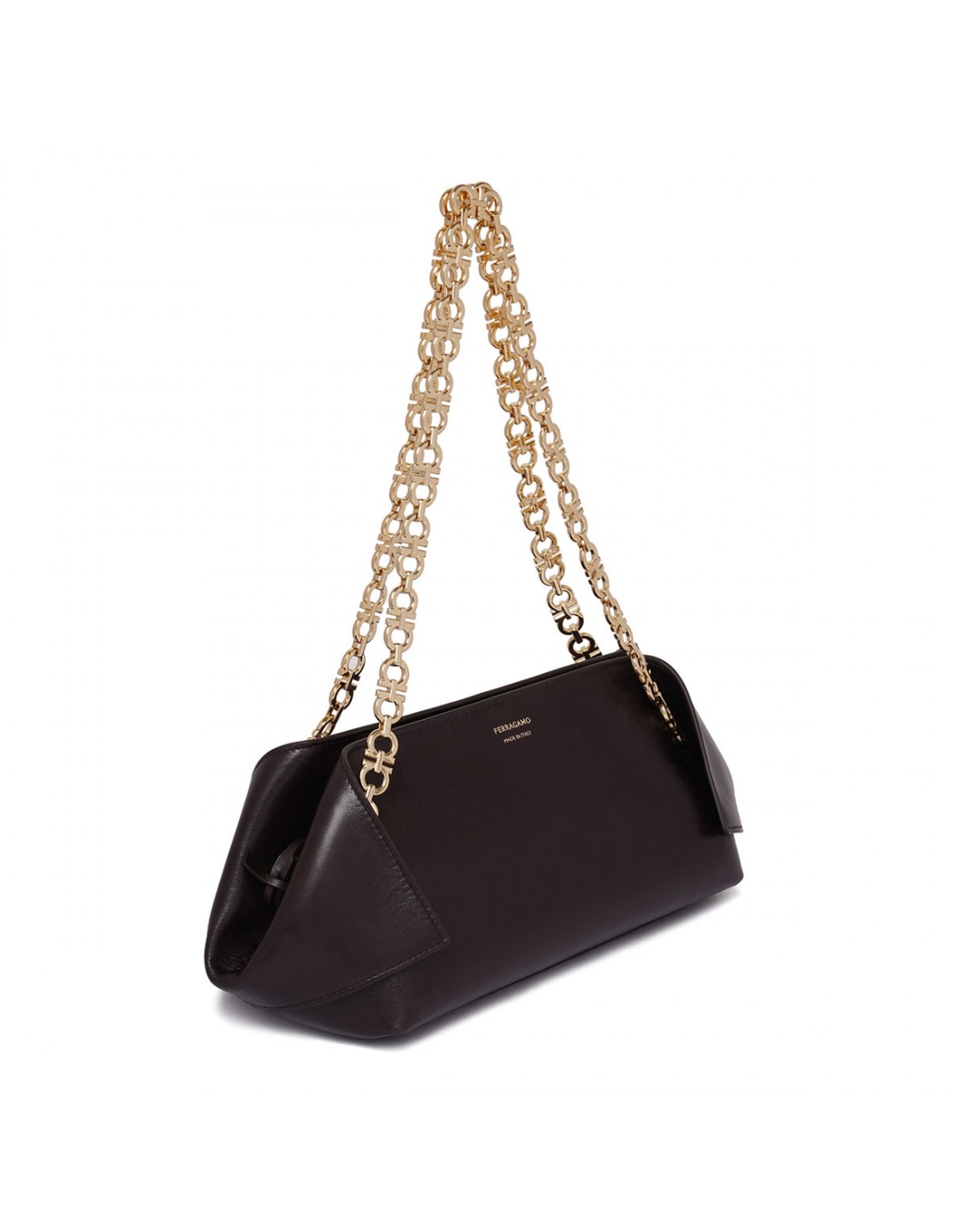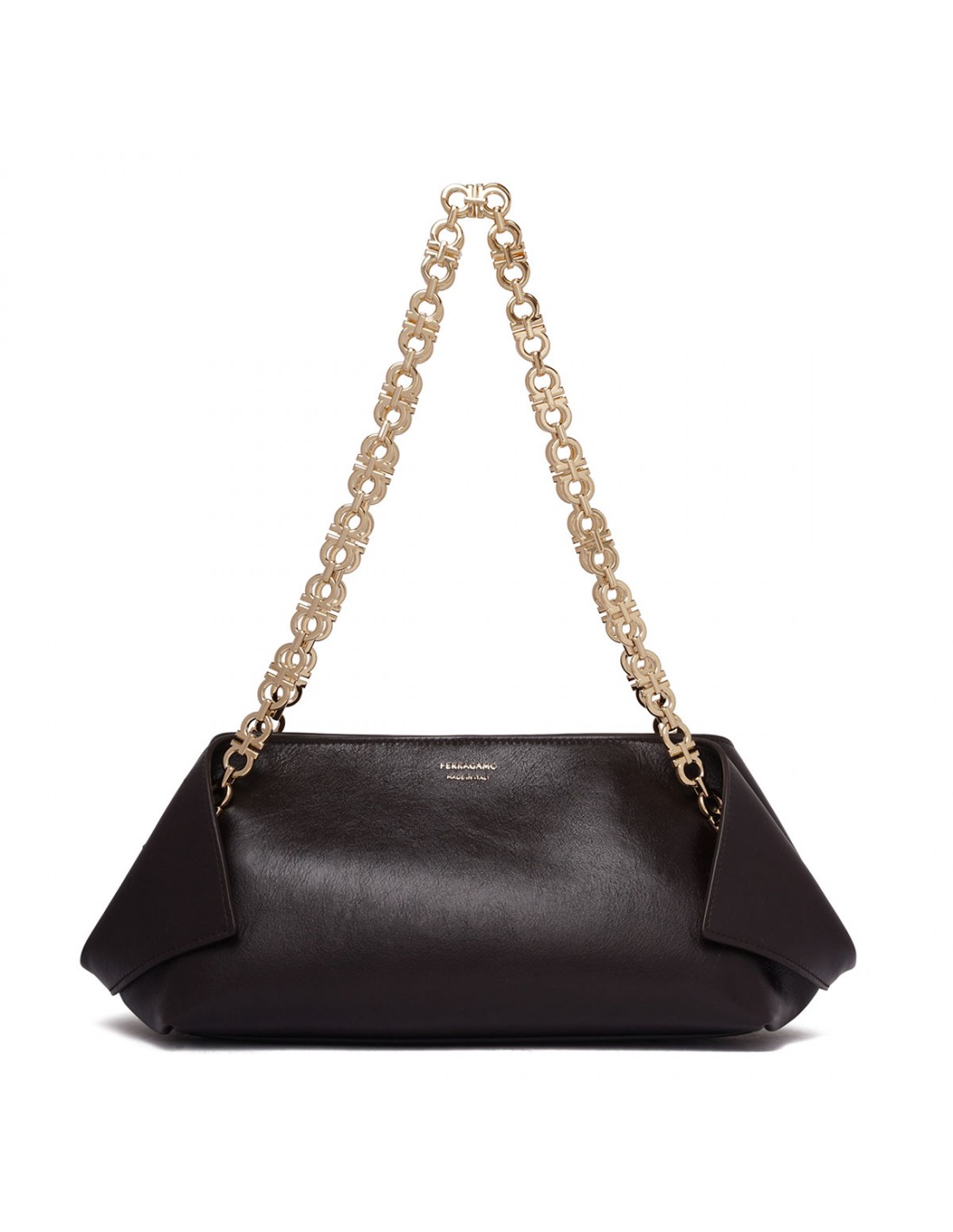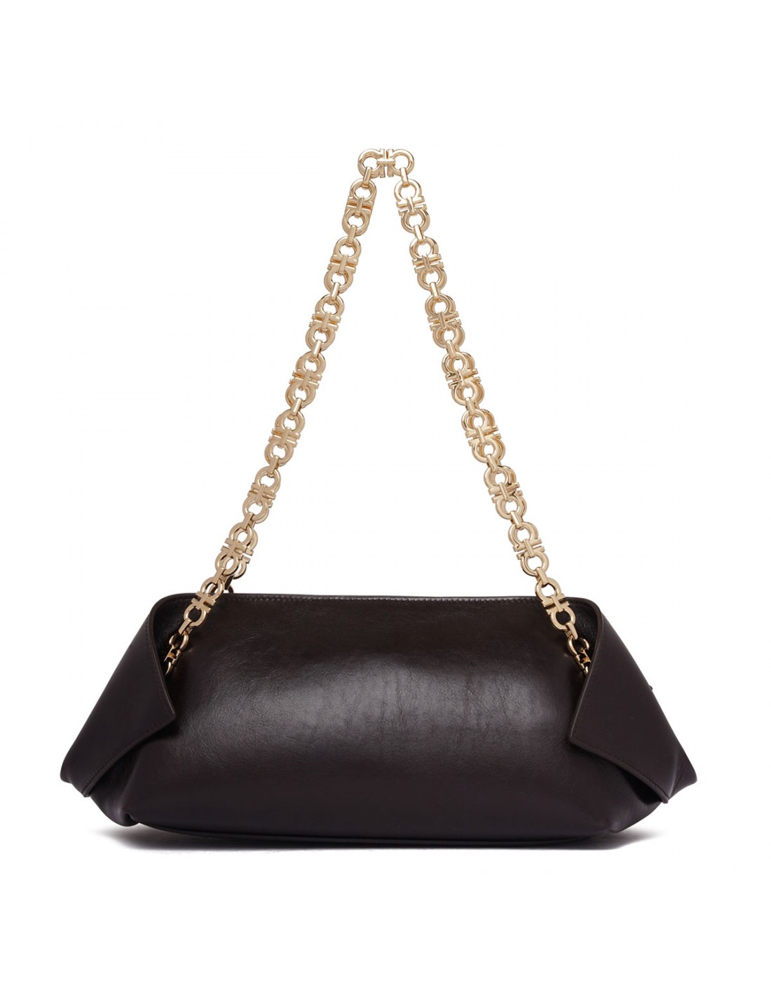 Black leather shoulder bag from Ferragamo featuring folded corners, Gancini chain shoulder strap, golden hardware, double slider zip closure, small custom charm and covered key fob, leather lining and internal zip pocket.