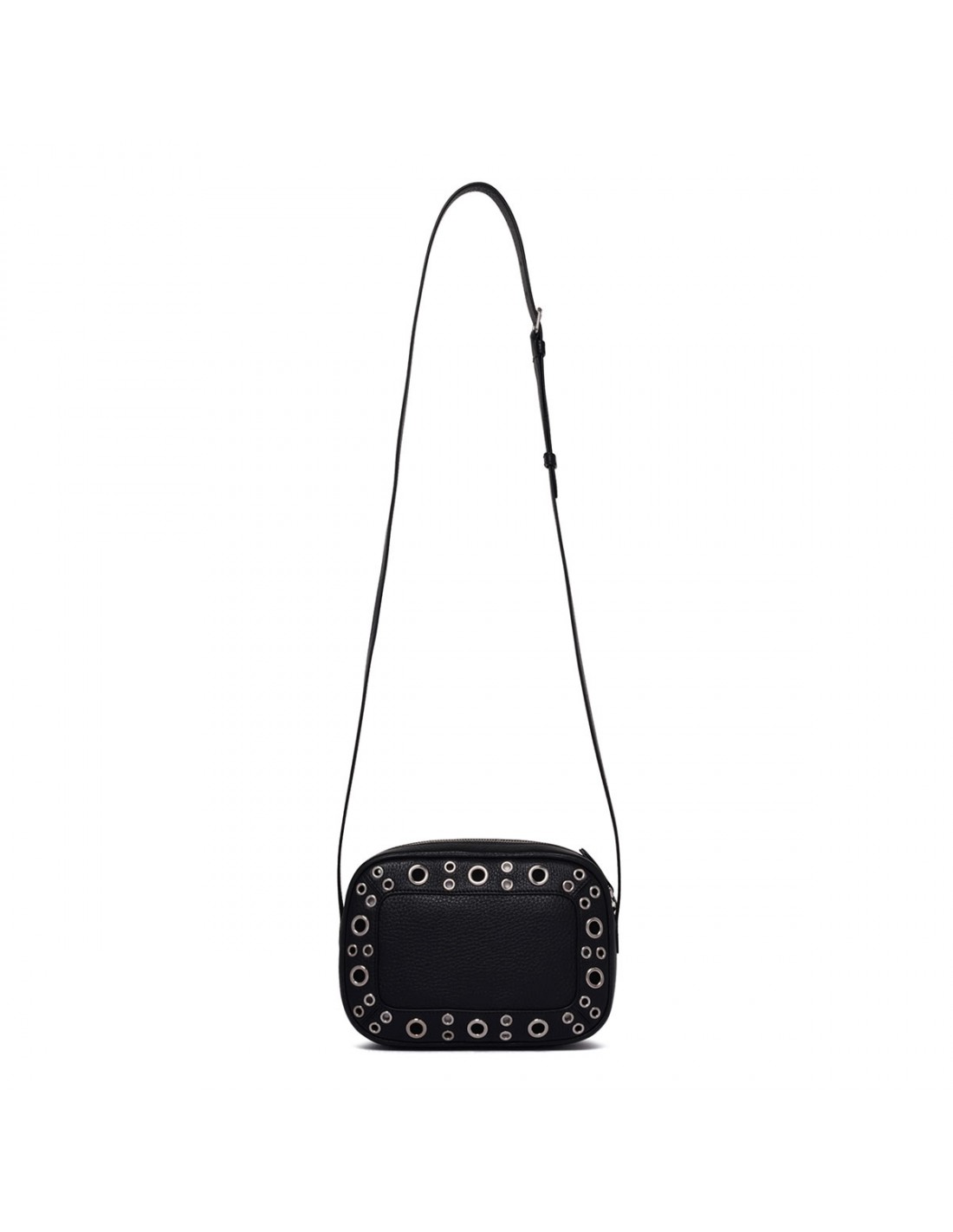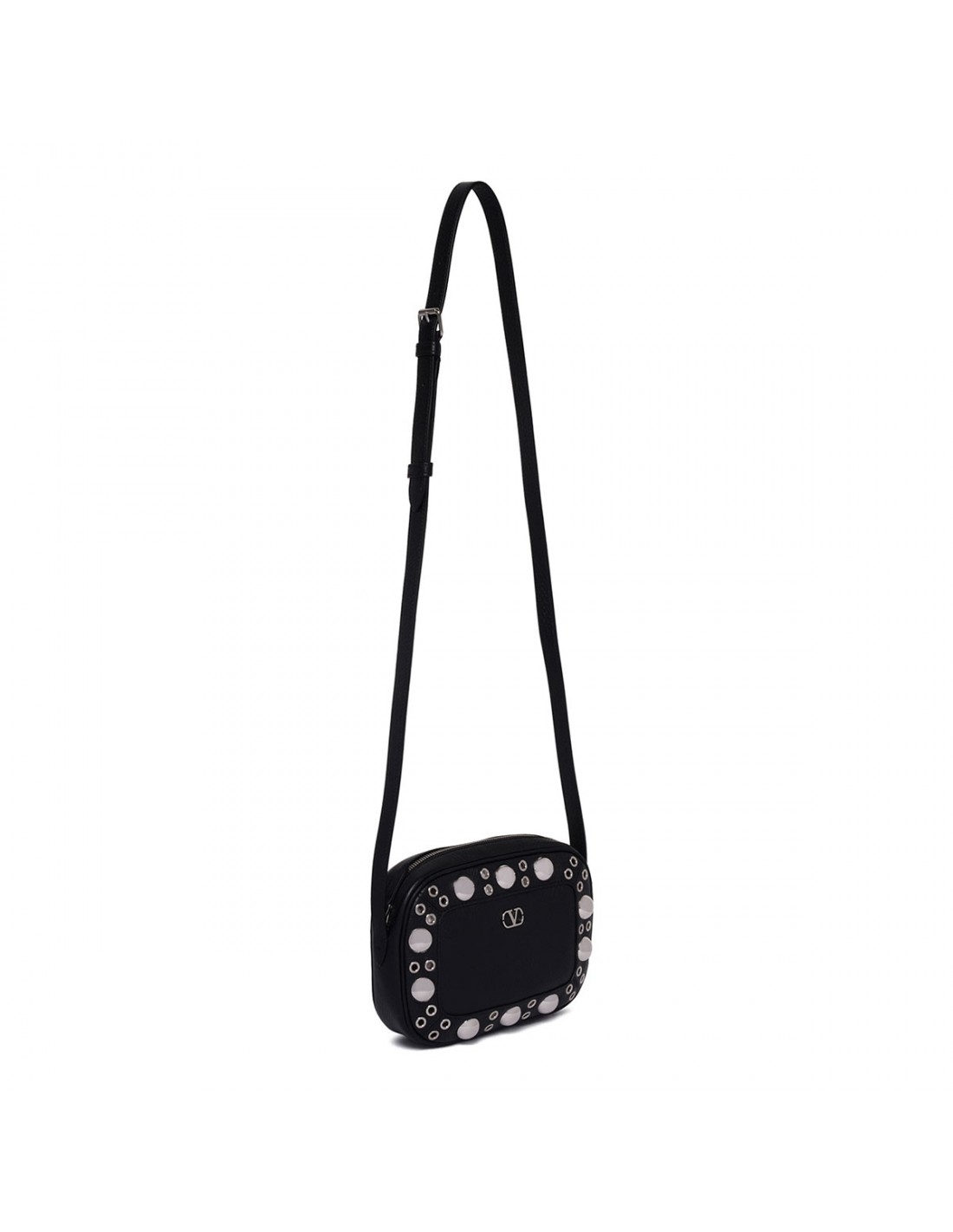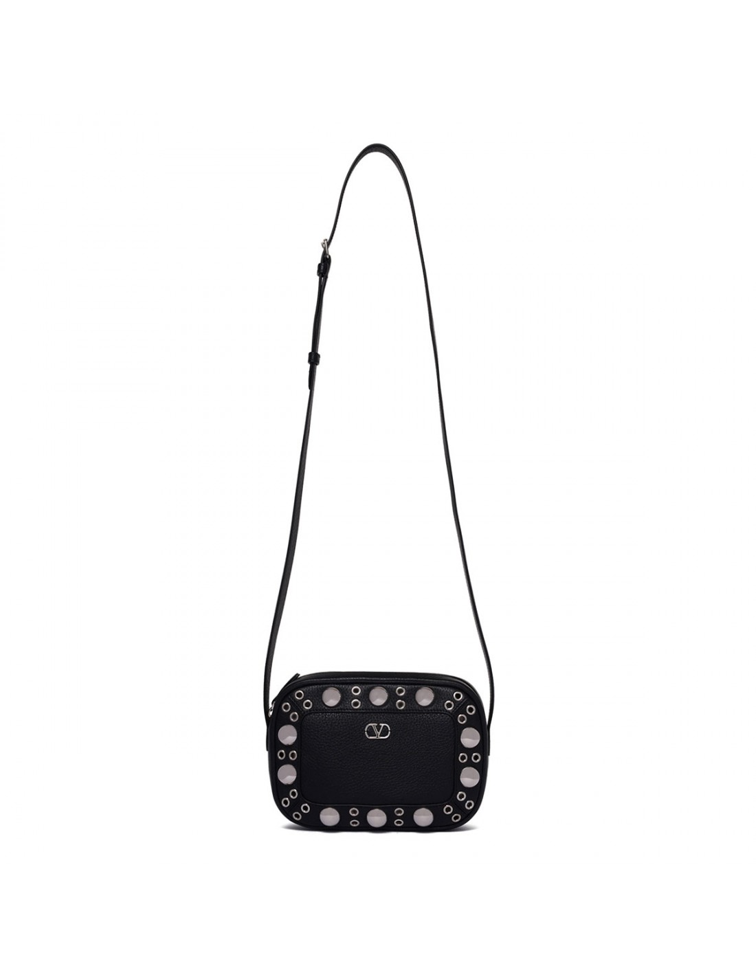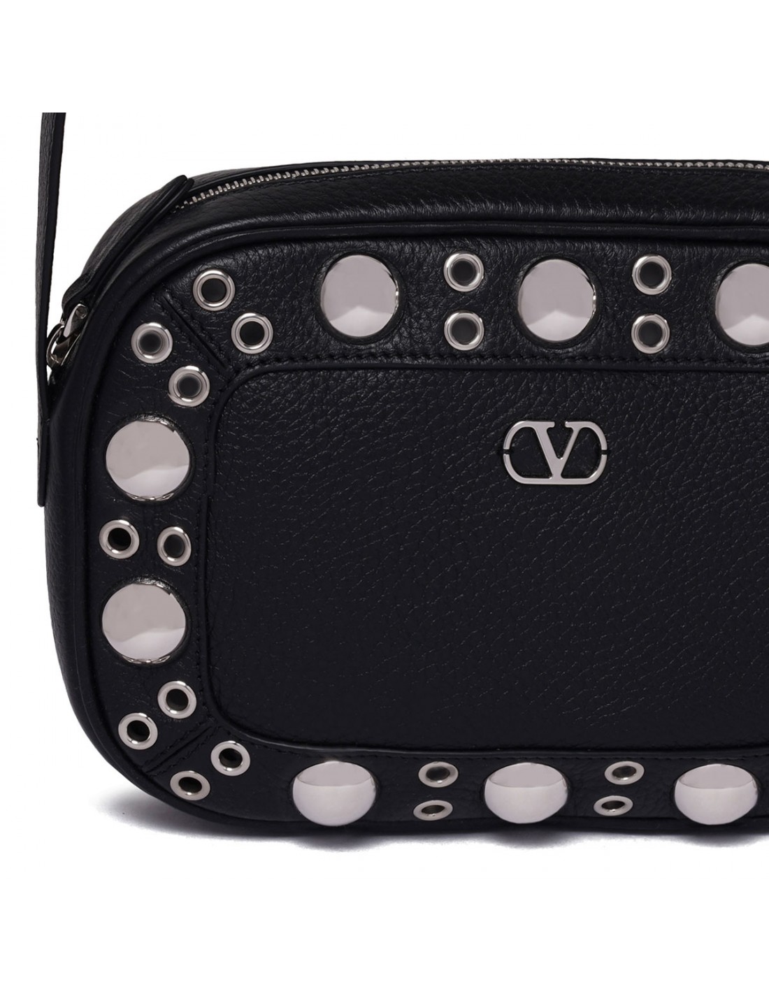 Black grainy leather Nellcôte shoulder bag from Valentino Garavani featuring ball studs and rivets, adjustable leather shoulder strap, zip fastening along top, palladium-finish hardware, small metallic detail with VLogo Signature, suede lining, internal card pocket.