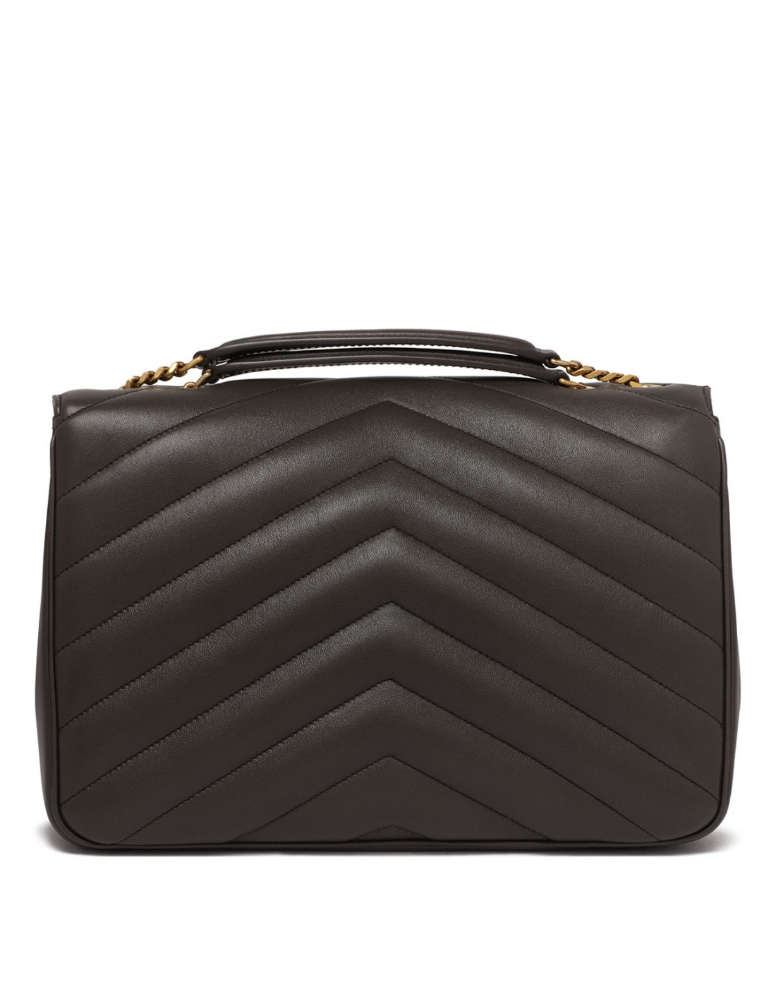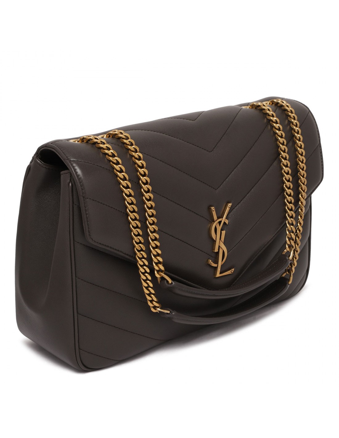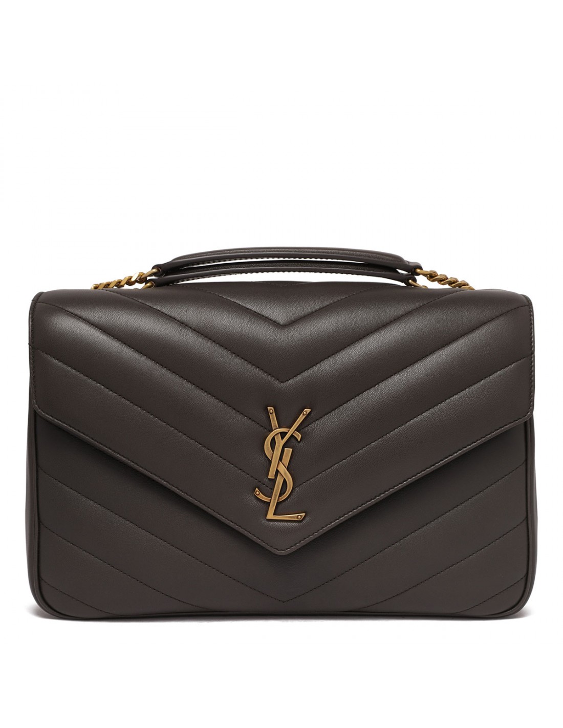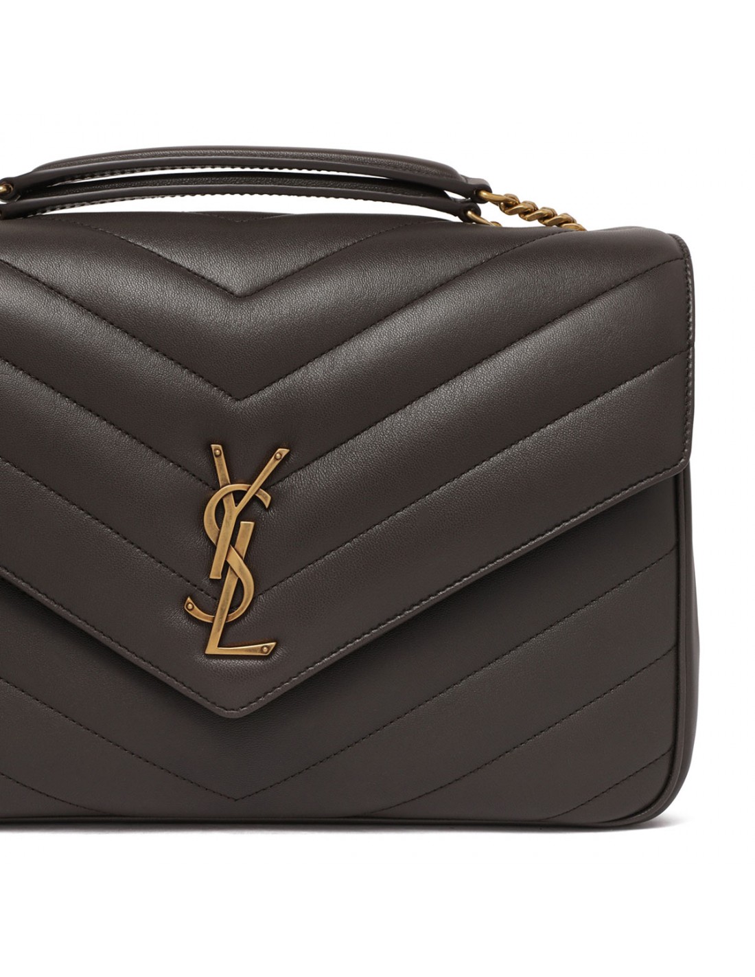 Gray matelassé Y leather Loulou large shoulder bag from Saint Laurent featuring golden metal interlocking YSL logo, sliding chain shoulder strap with leather detail, front flap with magnetic fastening, leather lining, detachable leather pouch and pocket mirror.