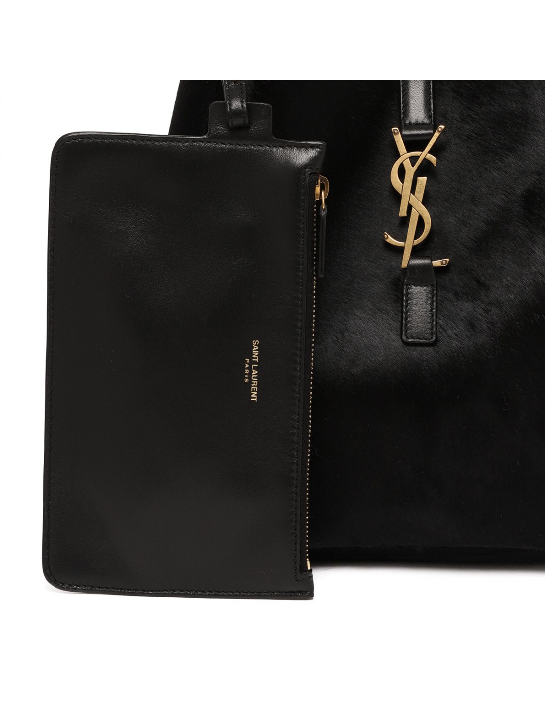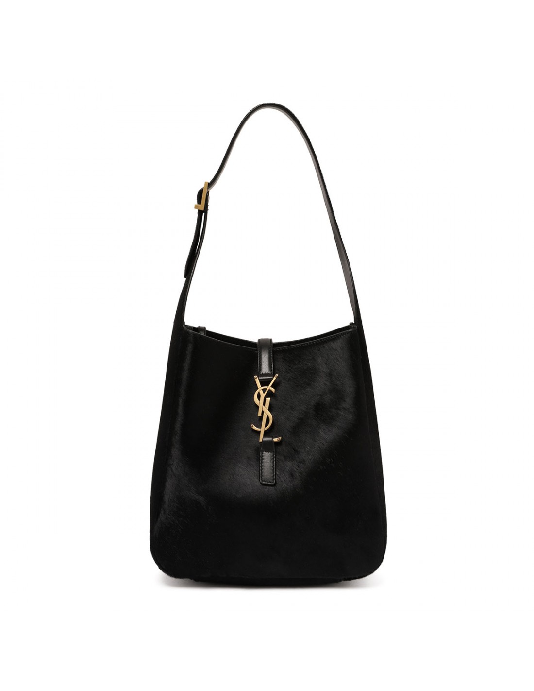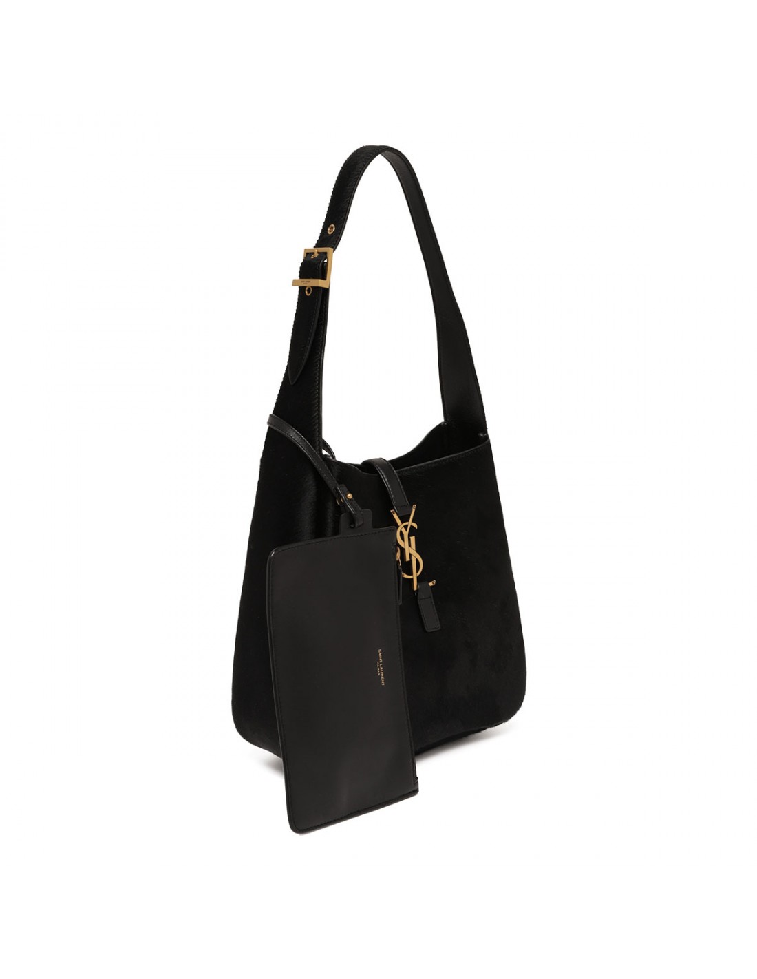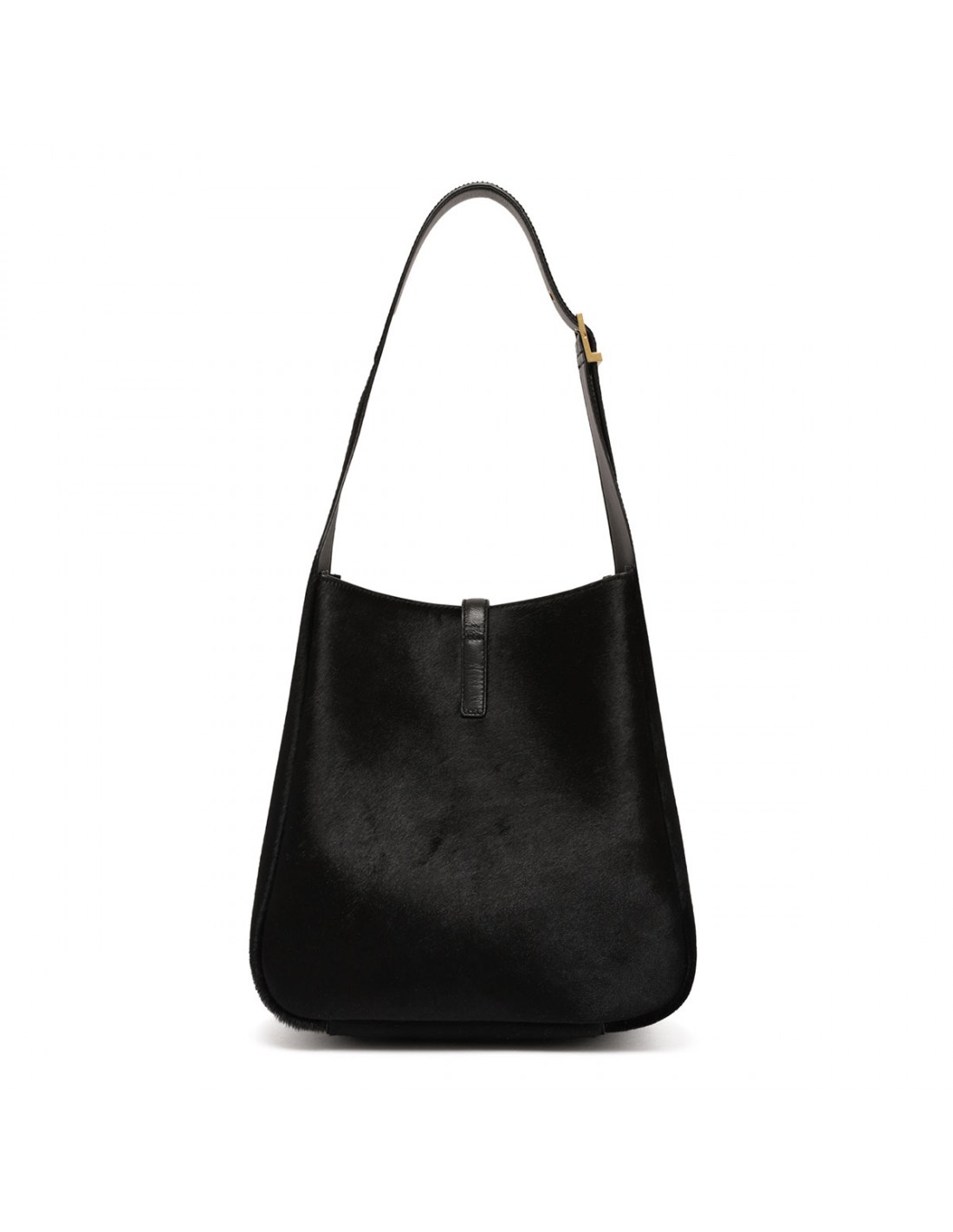 Black calf-hair leather Le 5 à 7 small shoulder bag from Saint Laurent featuring detachable smooth leather zipped pouch, leather tab with hook closure and Cassandre decoration, adjustable shoulder strap, bronze-tone hardware, cotton lining.