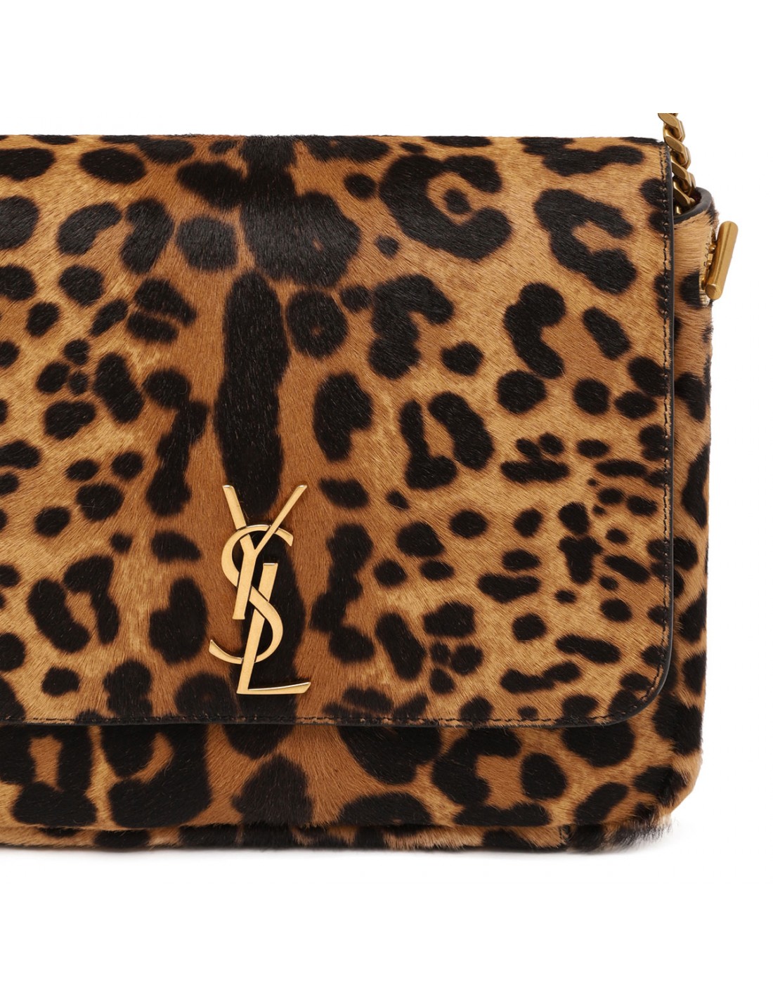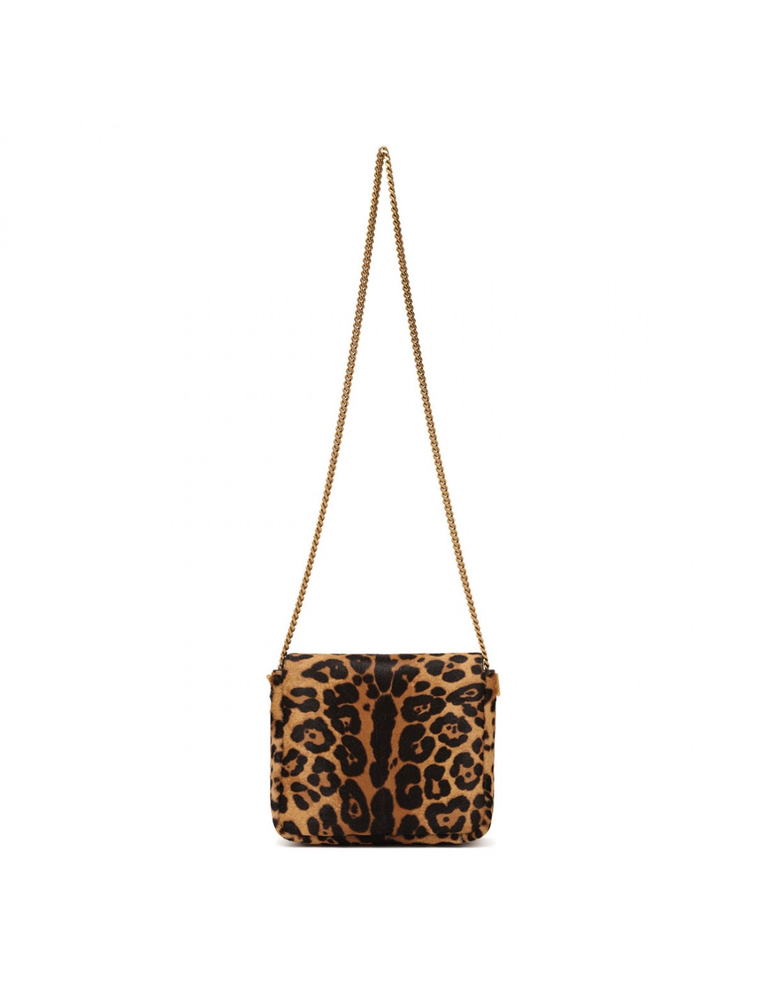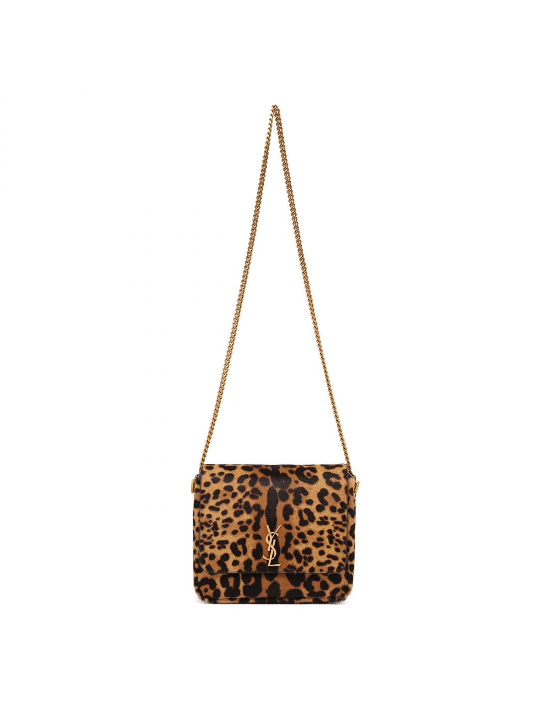 Dark brown and camel hue calf hair leather Kate supple bag from Saint Laurent featuring animalier motif, front flap with magnetic closure and interlaced YSL logo, gold-tone chain shoulder strap and hardware, lining.