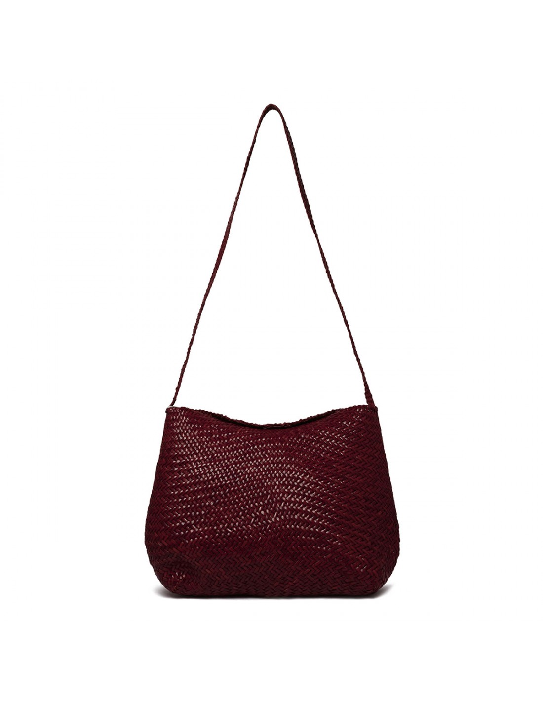 Bordeaux woven buffalo leather Santa Marta shoulder bag from Dragon Diffusion featuring distinctive diagonal weave, front flap with magnetic closure, leather shoulder strap, antiqued St. Christopher medal charm hand-sewn inside the bag.