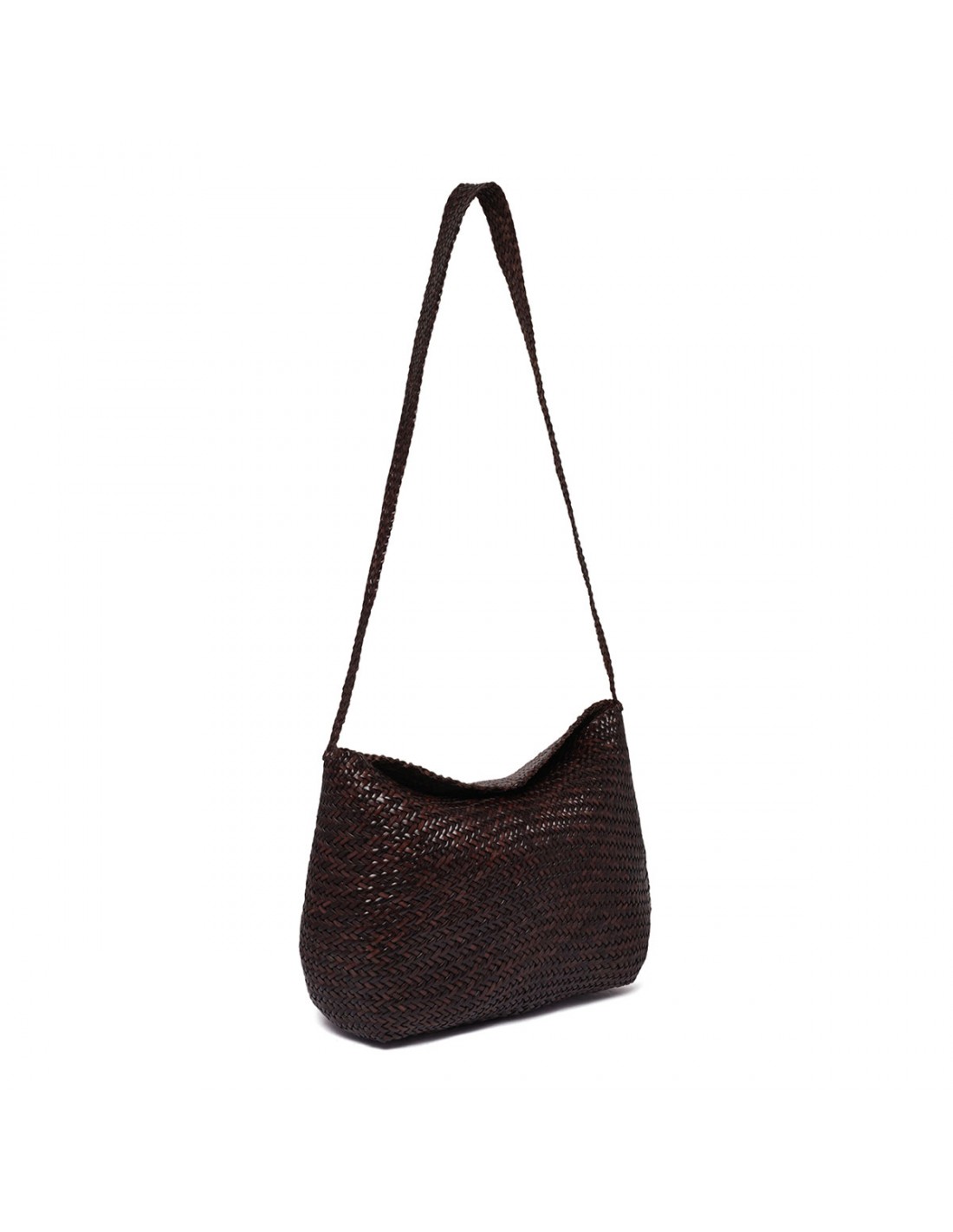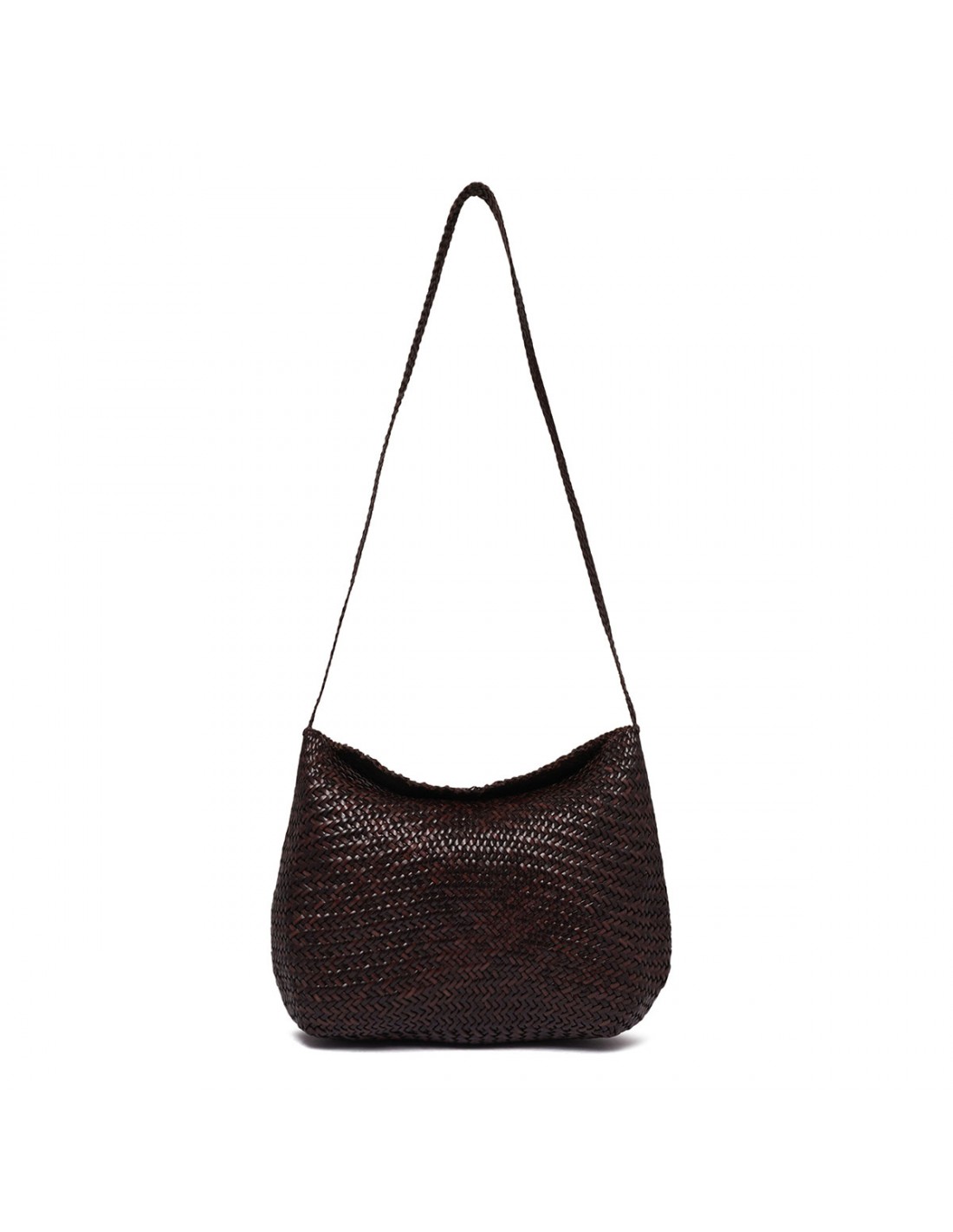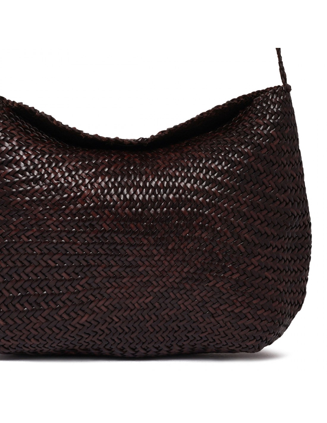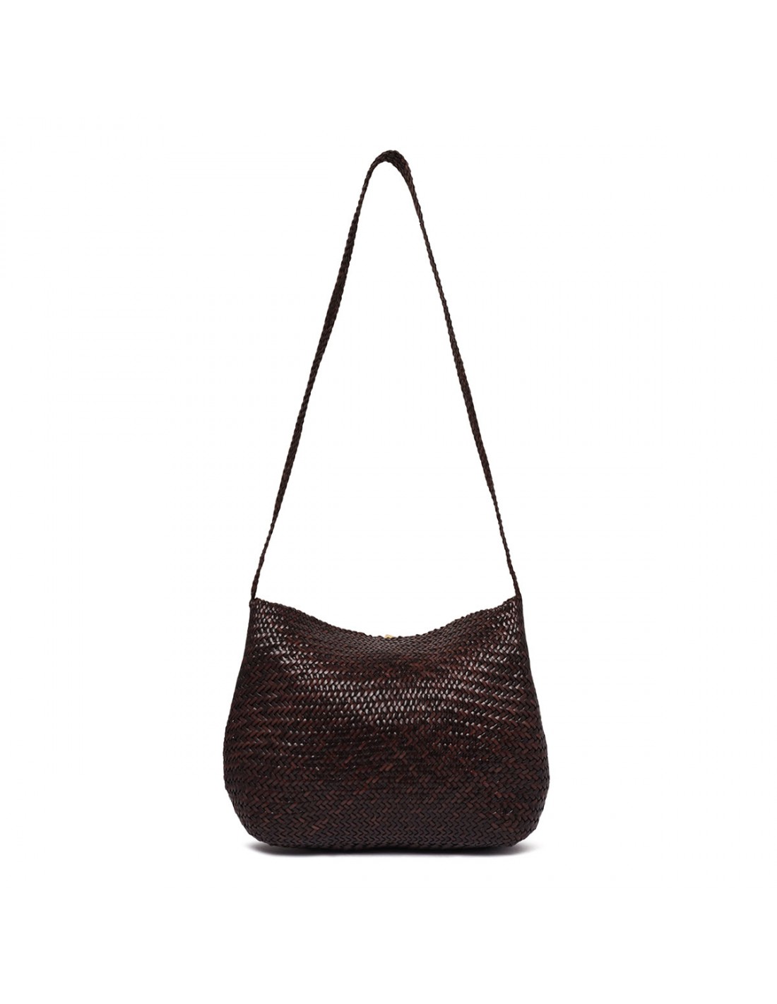 Dark brown woven buffalo leather Santa Marta shoulder bag from Dragon Diffusion featuring distinctive diagonal weave, front flap with magnetic closure, leather shoulder strap, antiqued St. Christopher medal charm hand-sewn inside the bag.