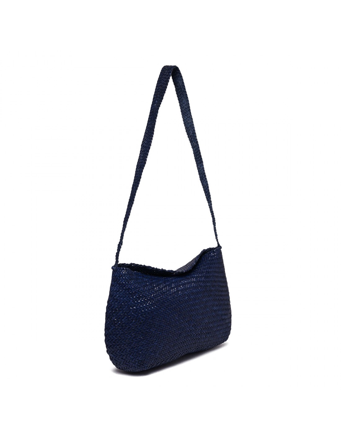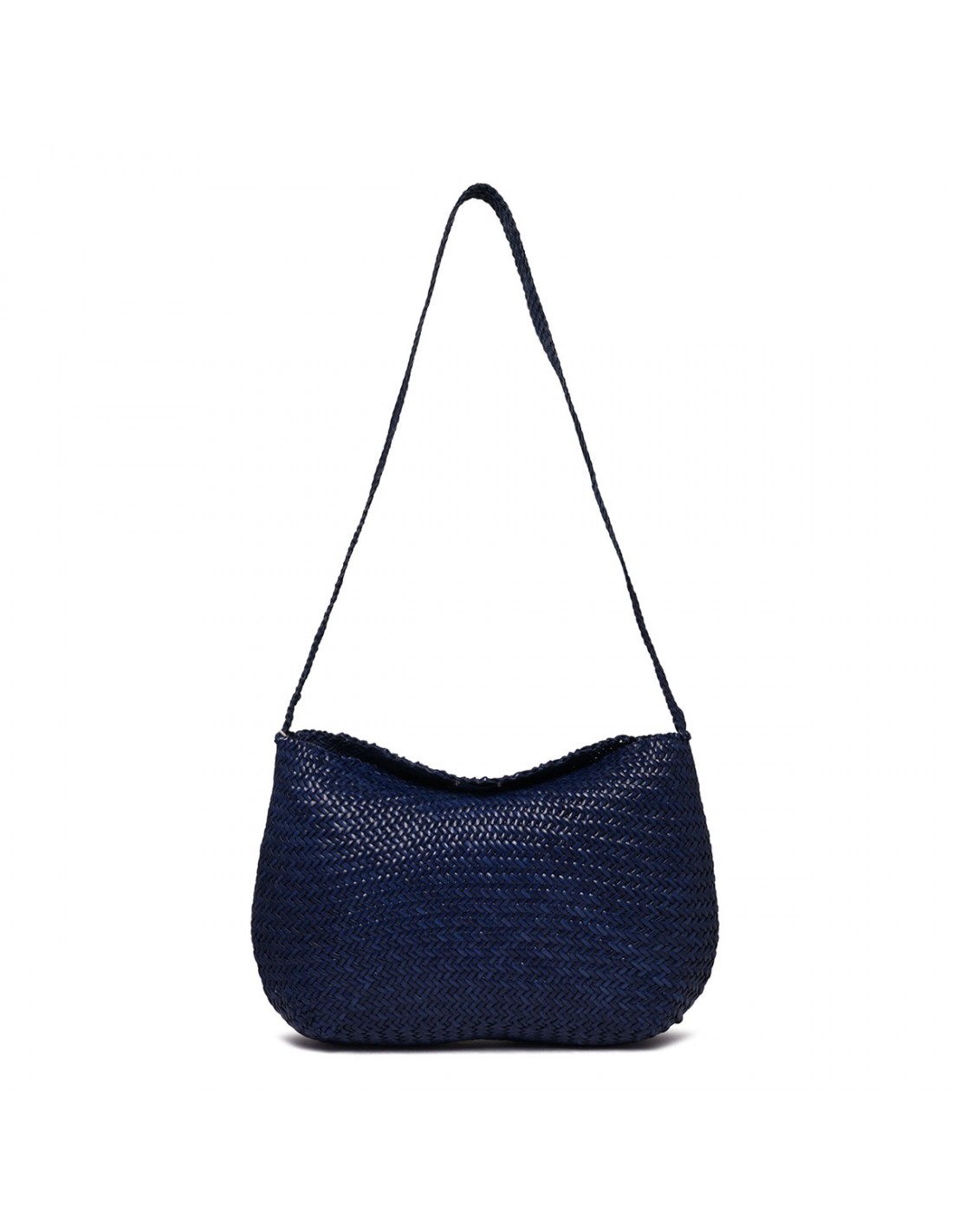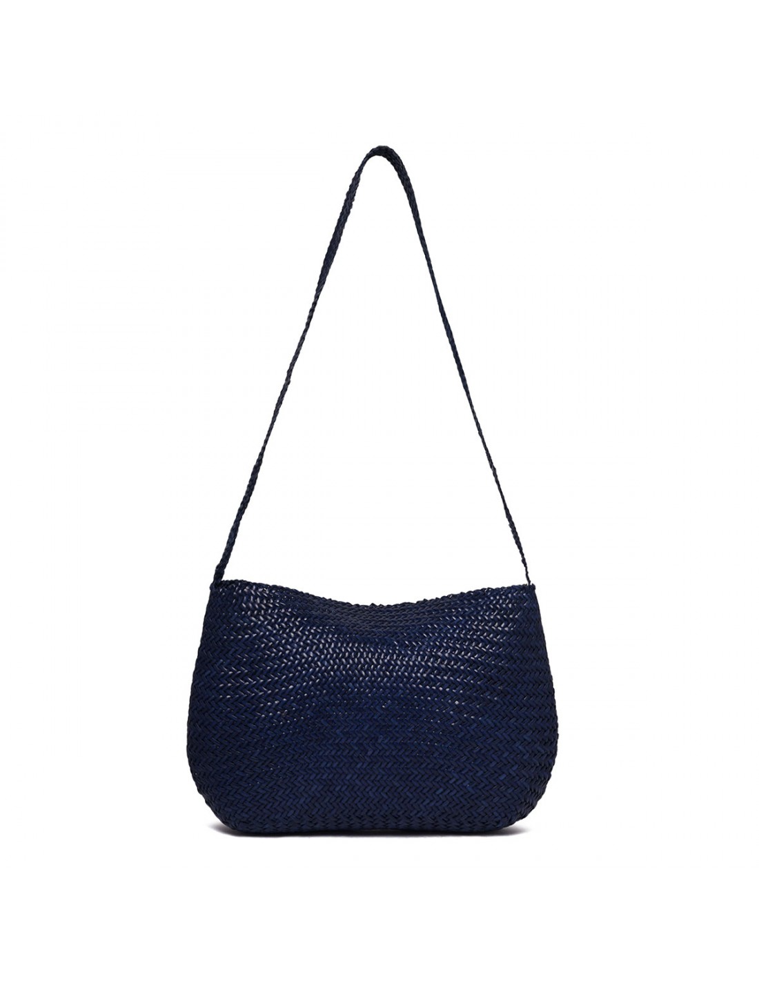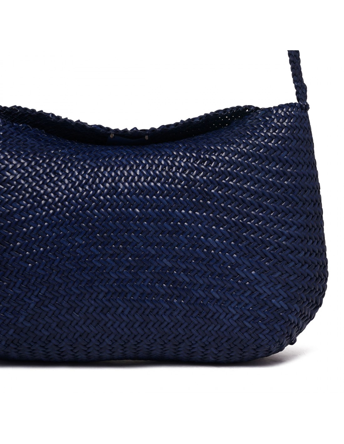 Navy blue woven buffalo leather Santa Marta shoulder bag from Dragon Diffusion featuring distinctive diagonal weave, front flap with magnetic closure, leather shoulder strap, antiqued St. Christopher medal charm hand-sewn inside the bag.