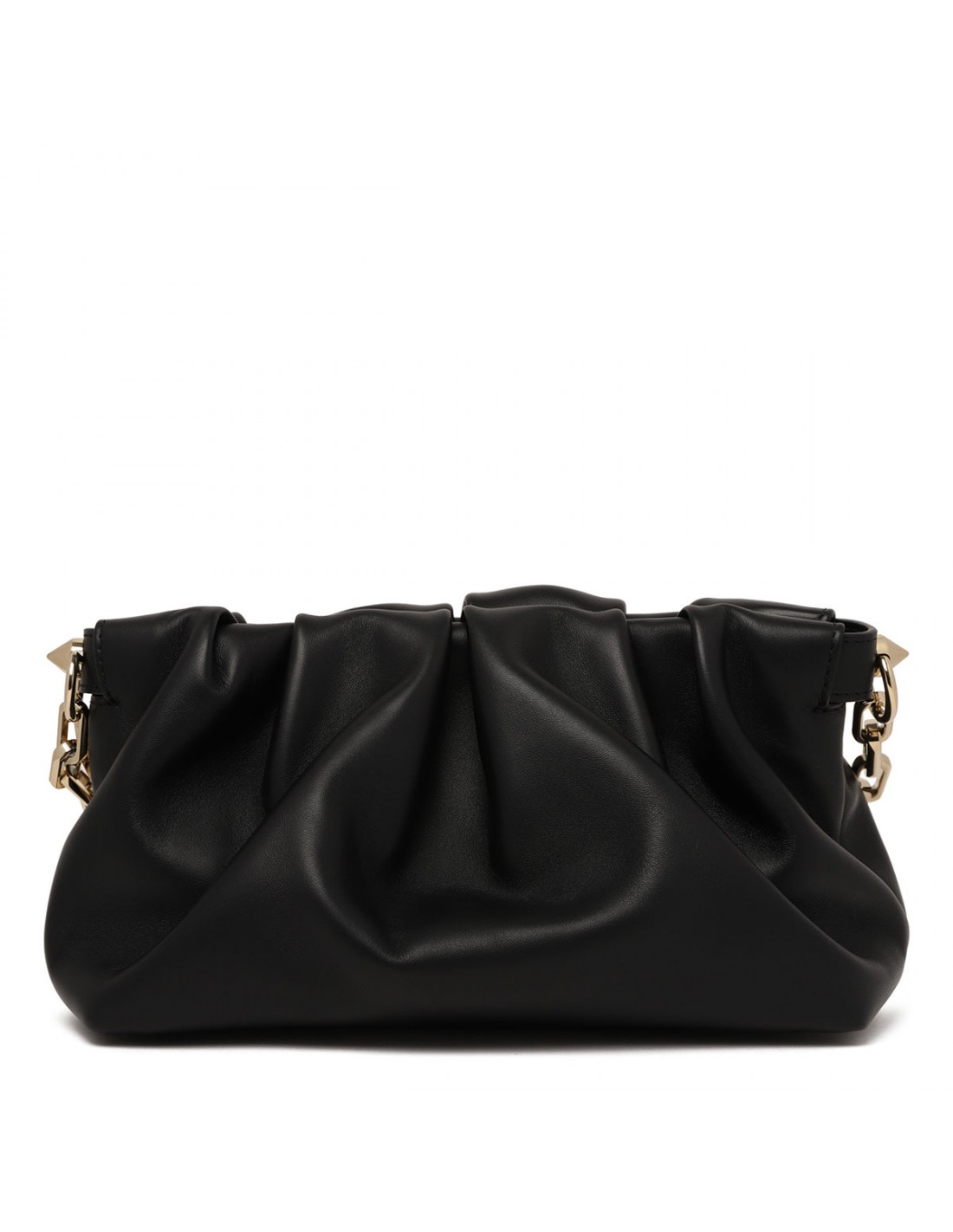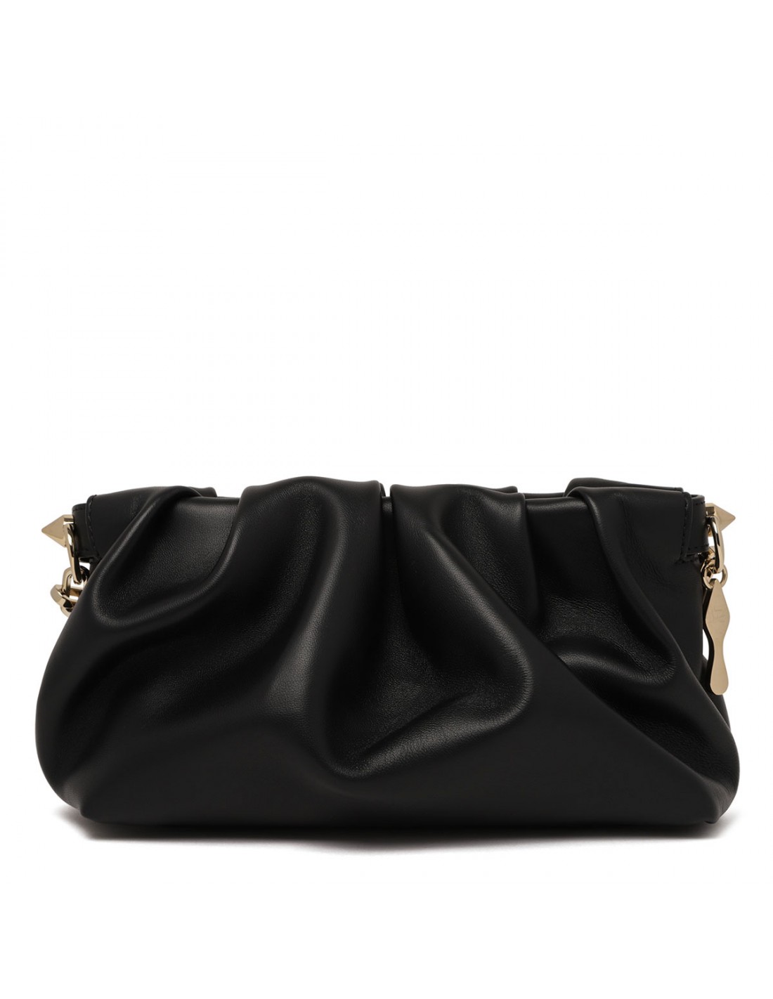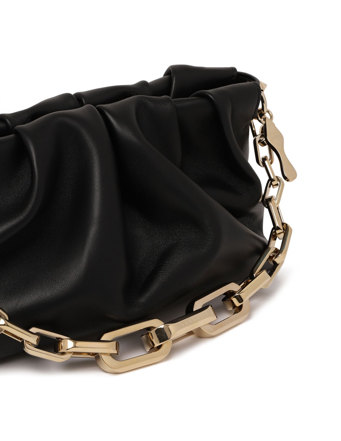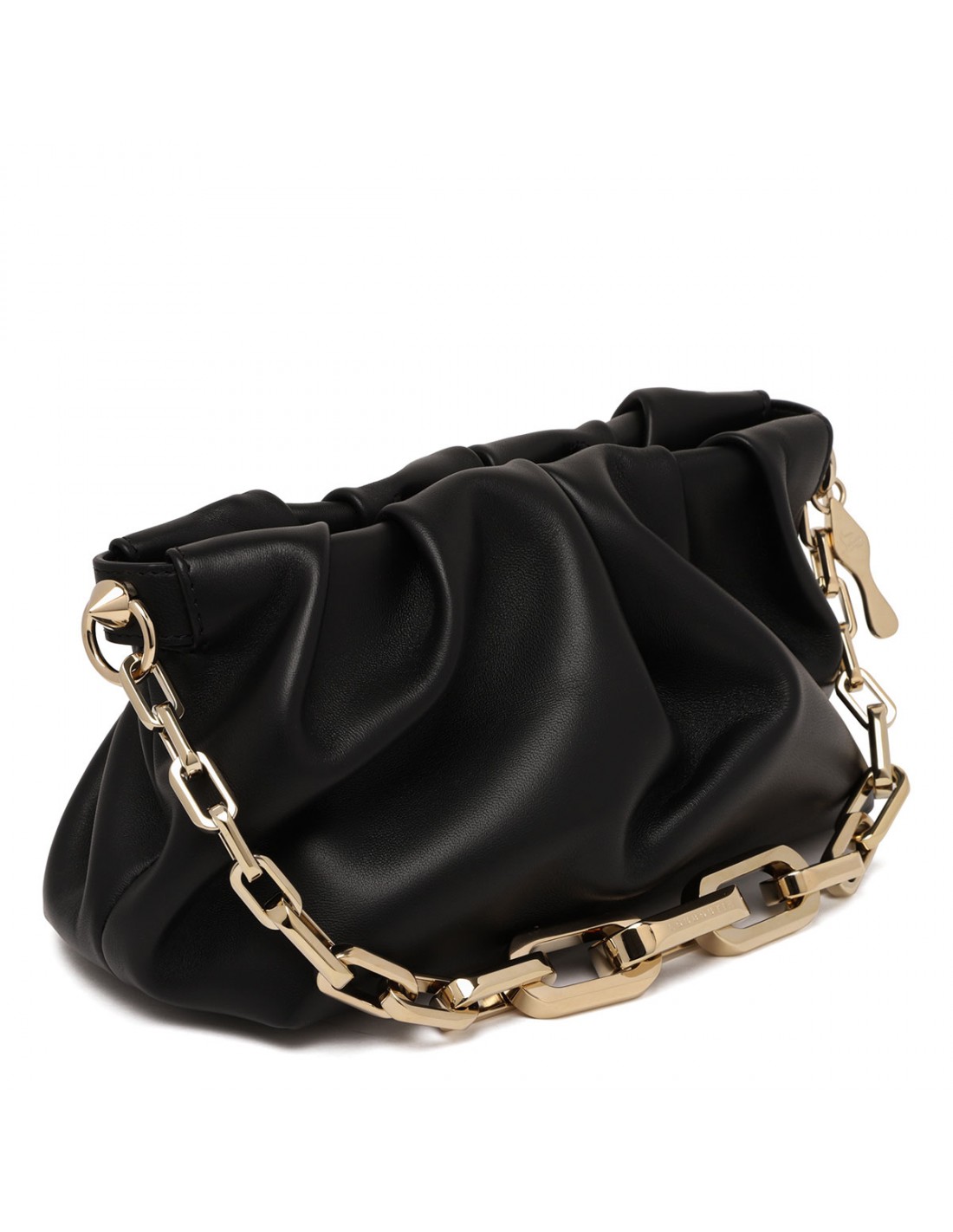 Black lamb nappa leather Eva small shoulder bag from Christian Louboutin featuring pleated shape, spikes, iconic sole charm, magnetic fastening, chain shoulder strap, one main compartment, one internal zipped pocket.