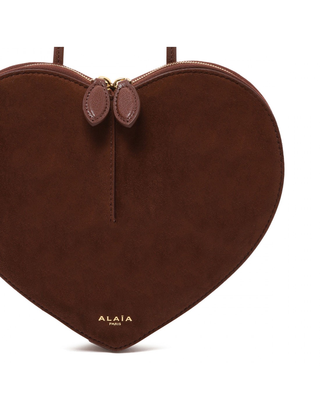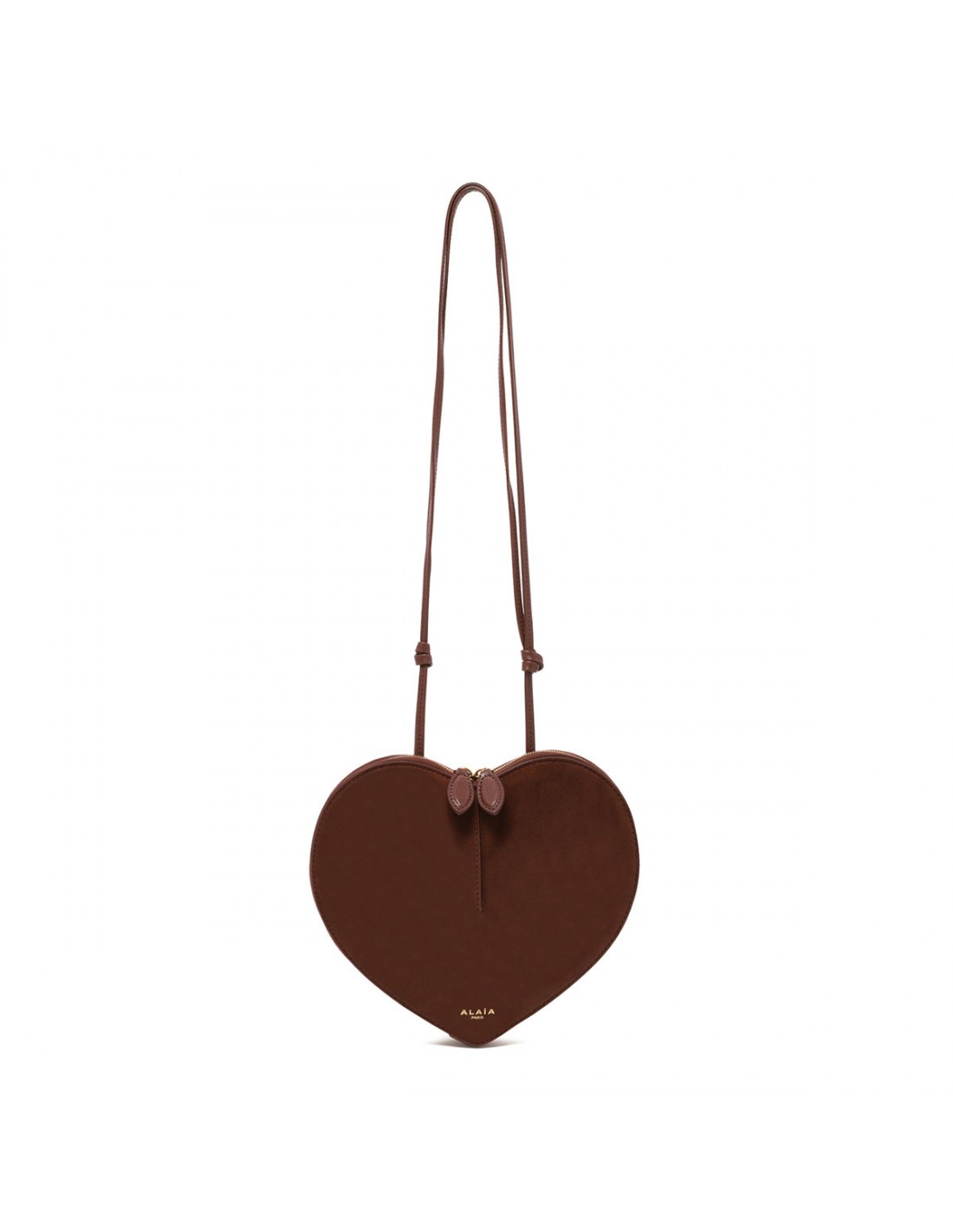 Brown suede leather Le Coeur bag from Alaia featuring heart-shape, two-way zip fastening and adjustable shoulder strap.