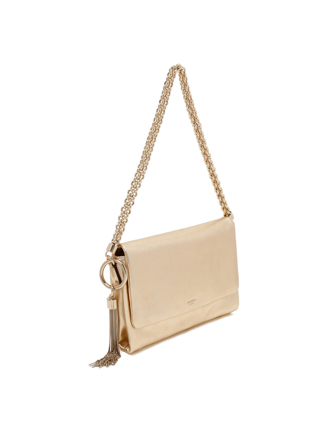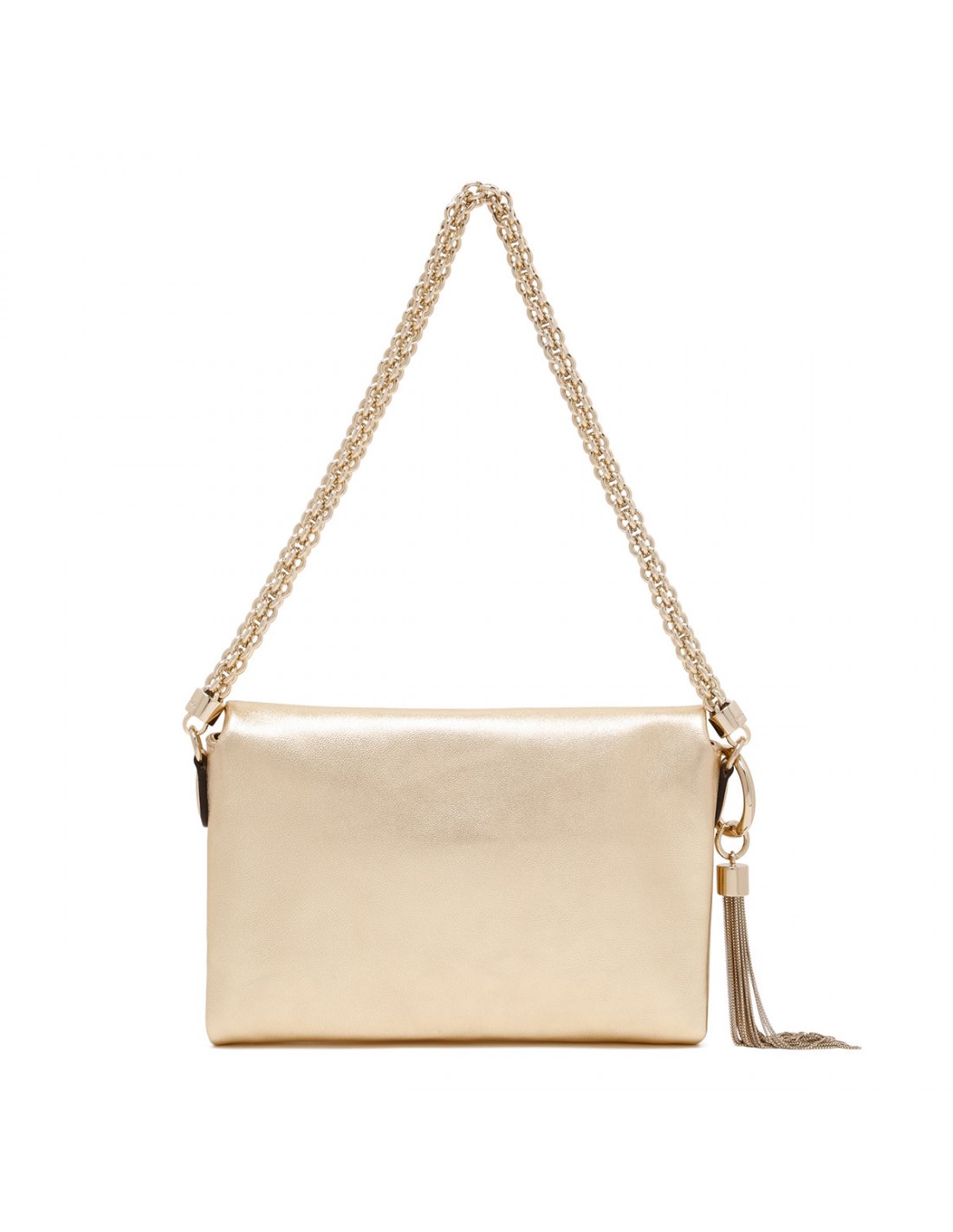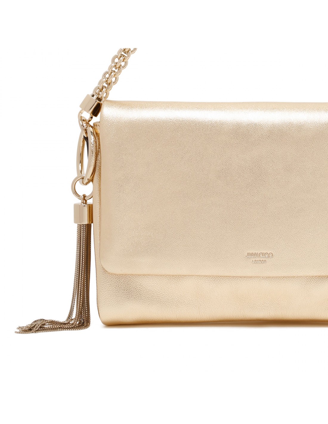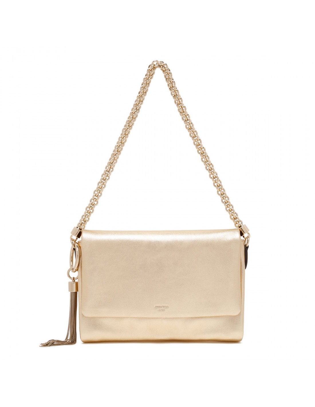 Metallic gold leather Callie Flap shoulder bag from Jimmy Choo featuring sculptural folds, gold-tone chain shoulder strap, front flap with magnetic closure, signature tassel hardware, engraved logo, internal pocket.