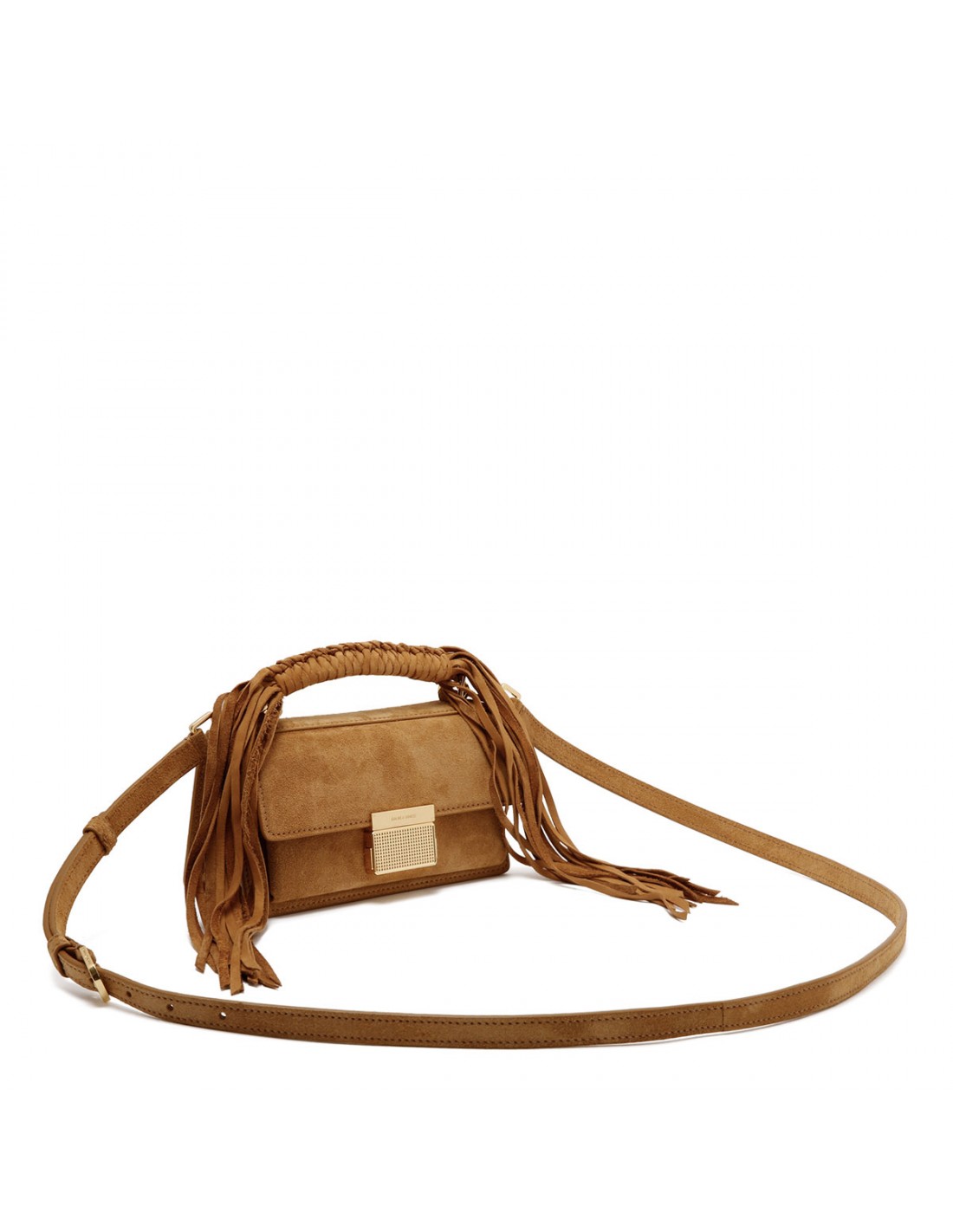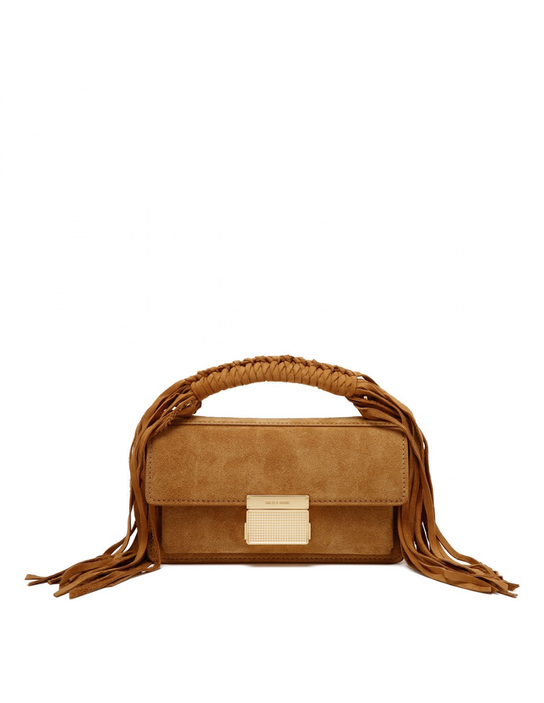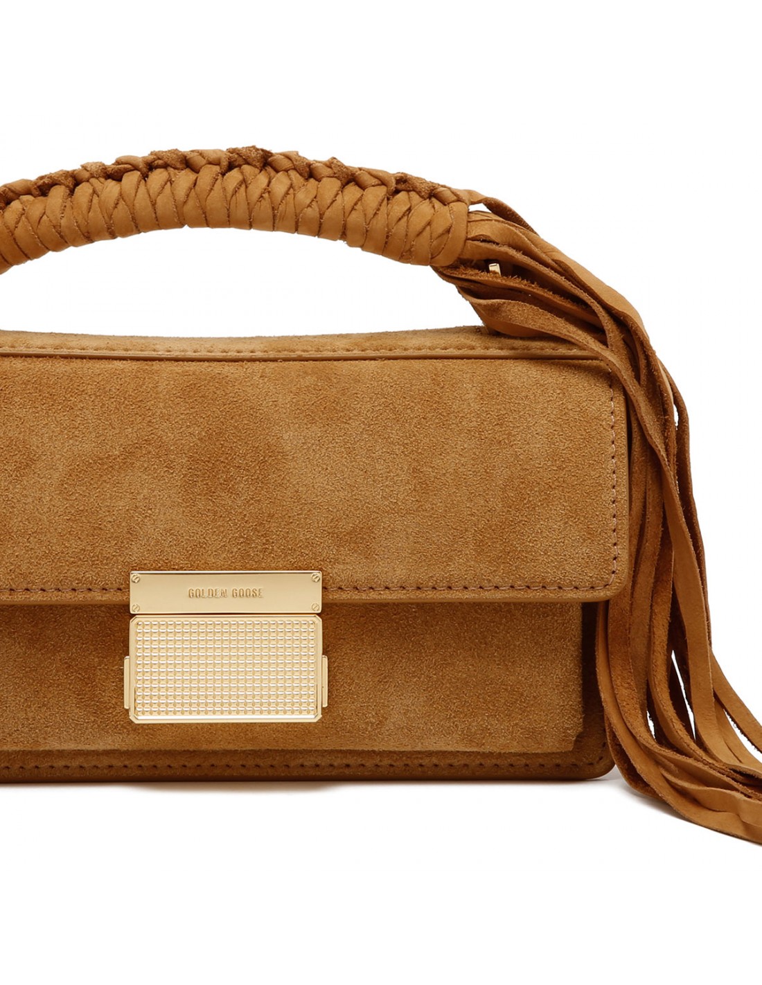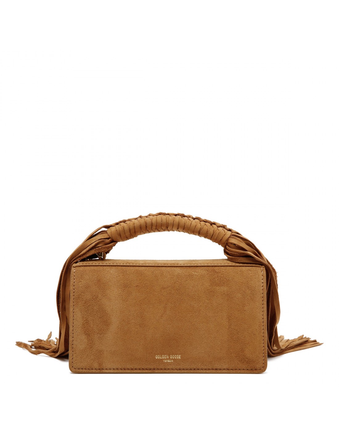 Camel suede leather Venezia small bag from Golden Goose featuring braided top handle with fringes, gold buckle fastening with side buttons, top handle, adjustable shoulder strap with snap hook, logo on the back, double inside pocket, internal card holder.