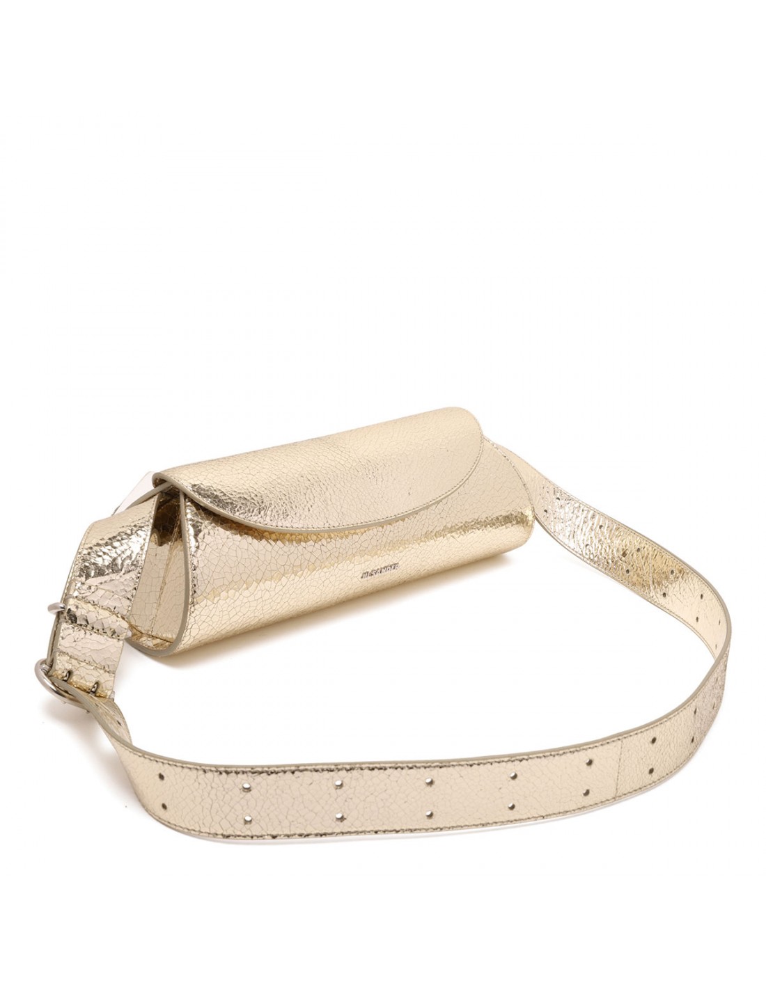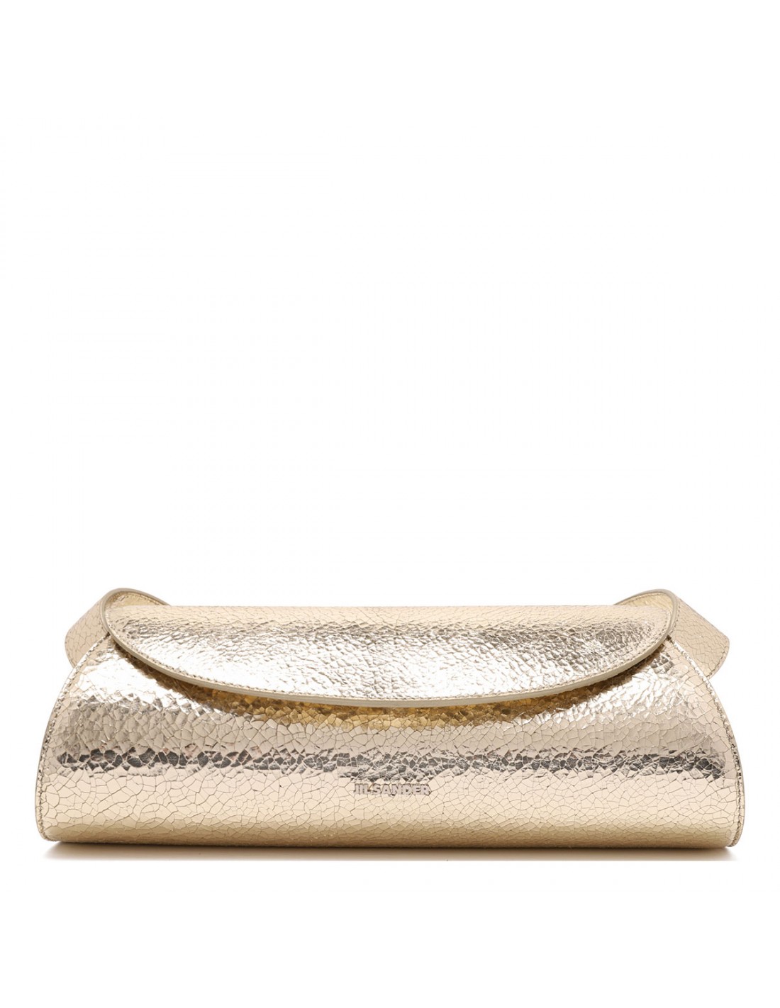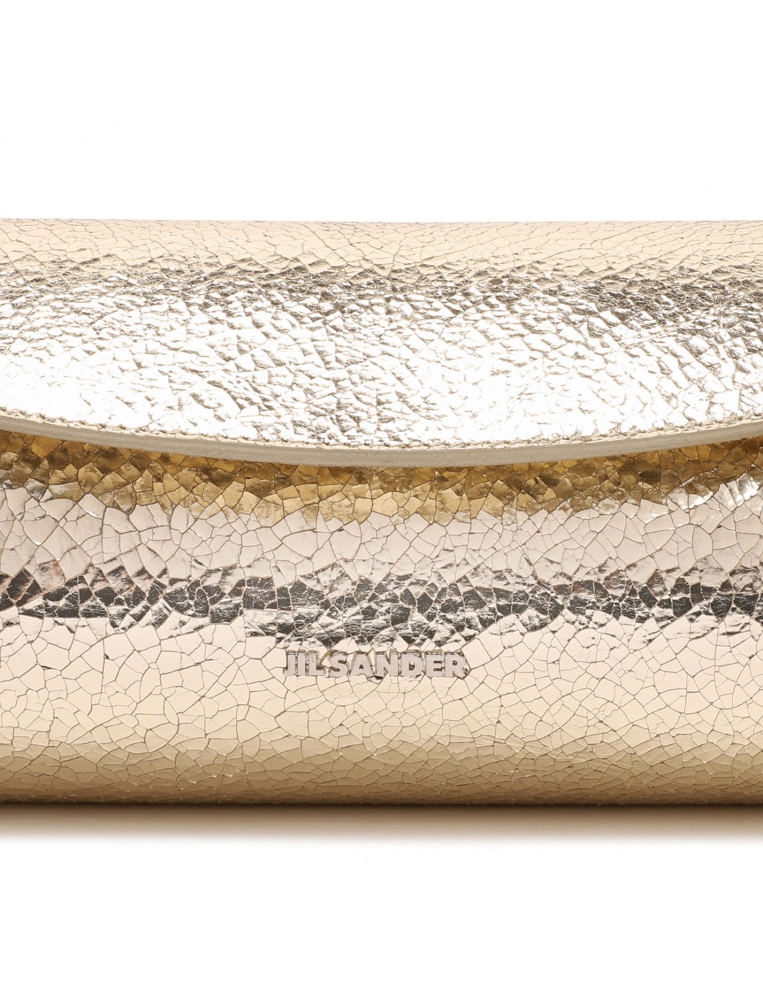 Platinum hue crackled laminated leather Cannolo shoulder bag from Jil Sander featuring adjustable shoulder strap, metal Jil Sander logo, magnetic button closure, nappa lining, internal card slot.