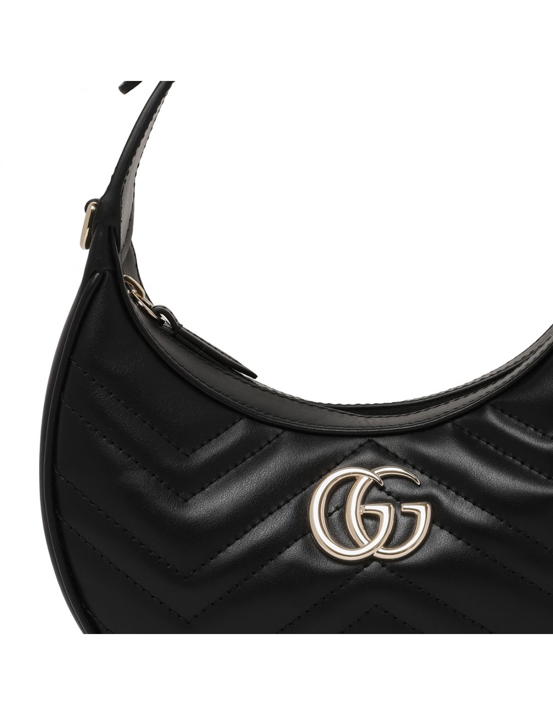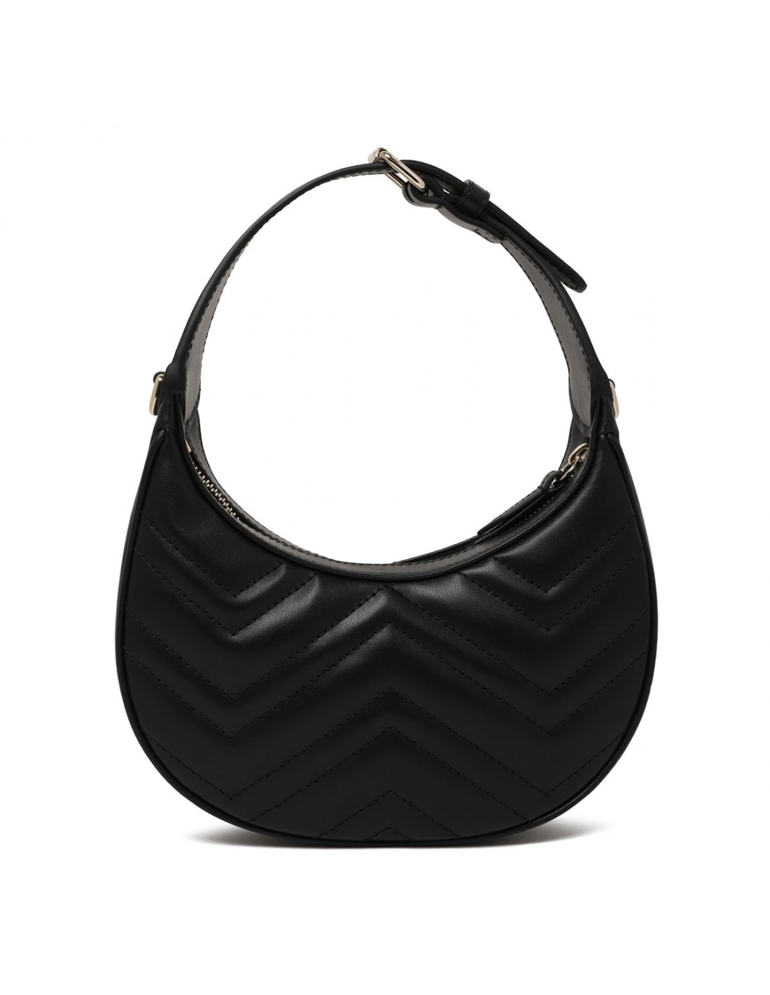 Black matelassé chevron lambskin leather GG Marmont small shoulder bag from Gucci featuring light antique gold-toned double G and hardware, adjustable handle, detachable chain strap, zip fastening, moiré and microfibre lining with suede-like finish, internal two card slots and one hook.