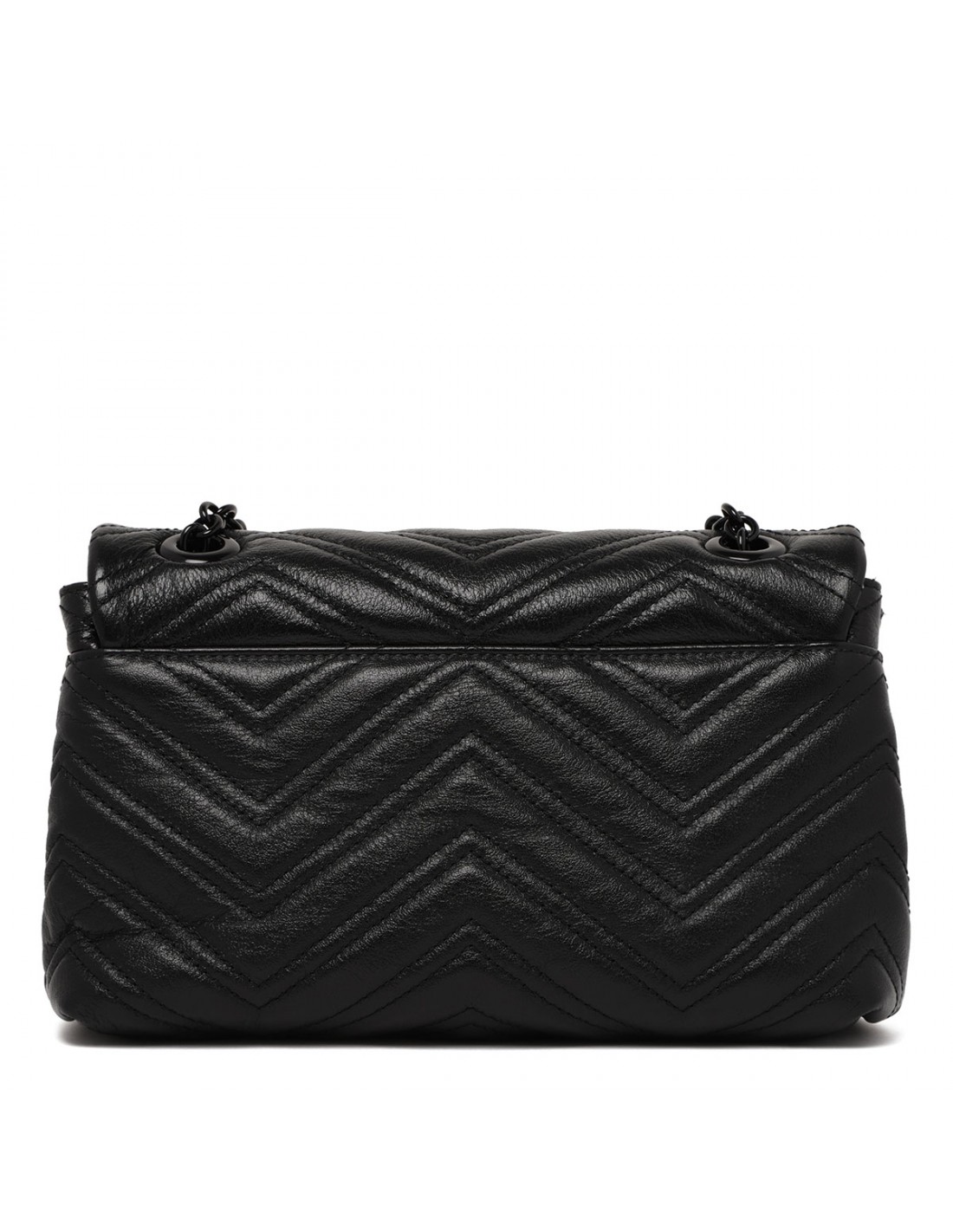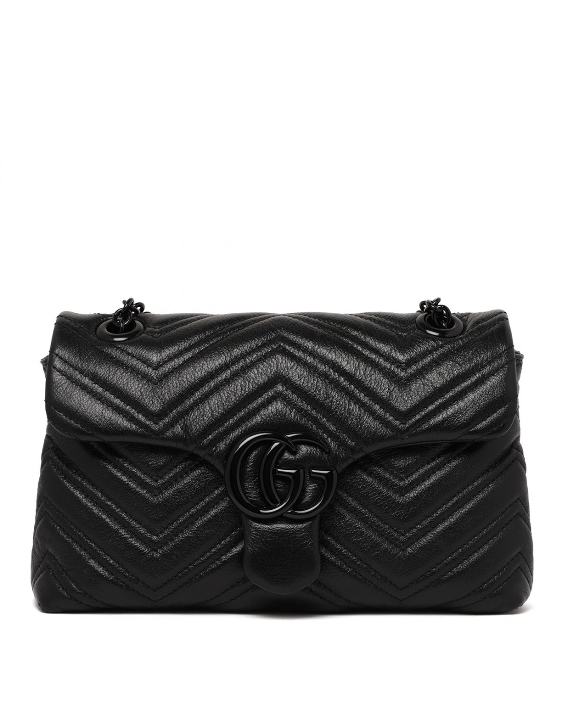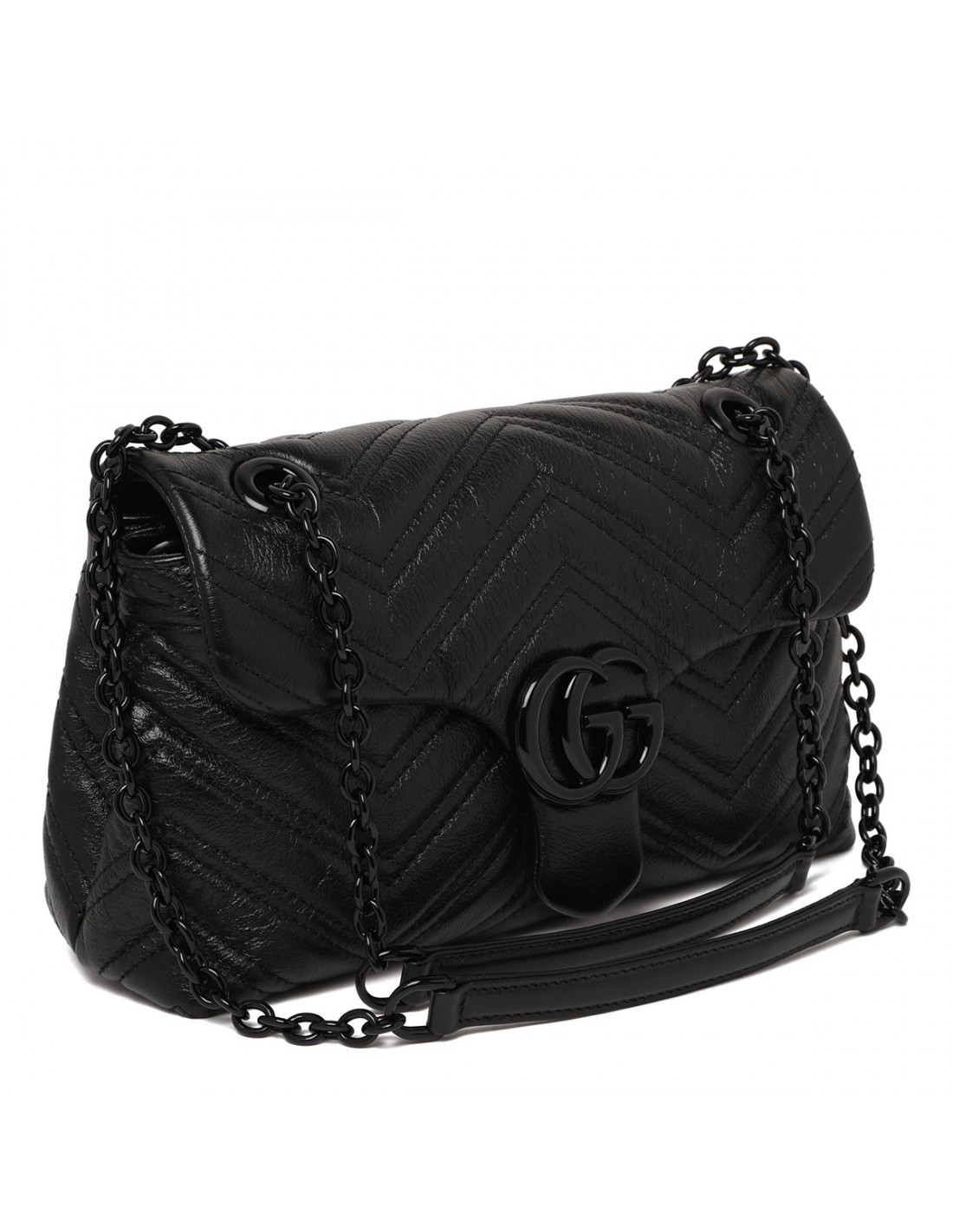 Black matelassé chevron nappa leather GG Marmont small shoulder bag from Gucci featuring tonal enameled double G and hardware, sliding shoulder chain strap, snap magnetic closure, black viscose lining, one internal open pocket.